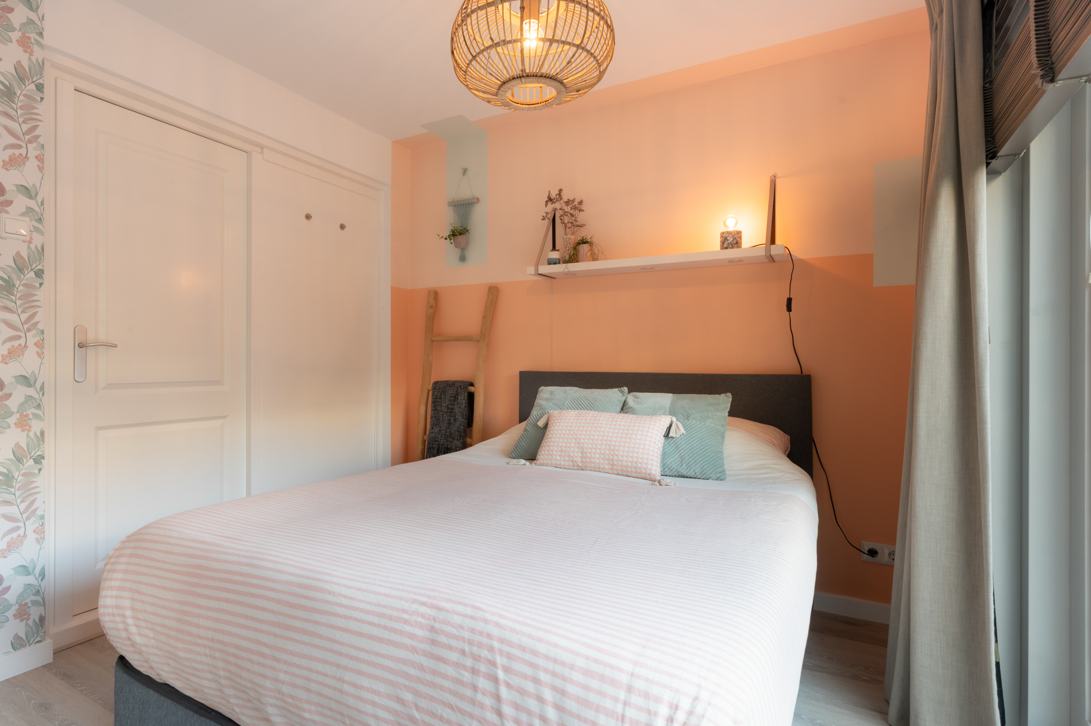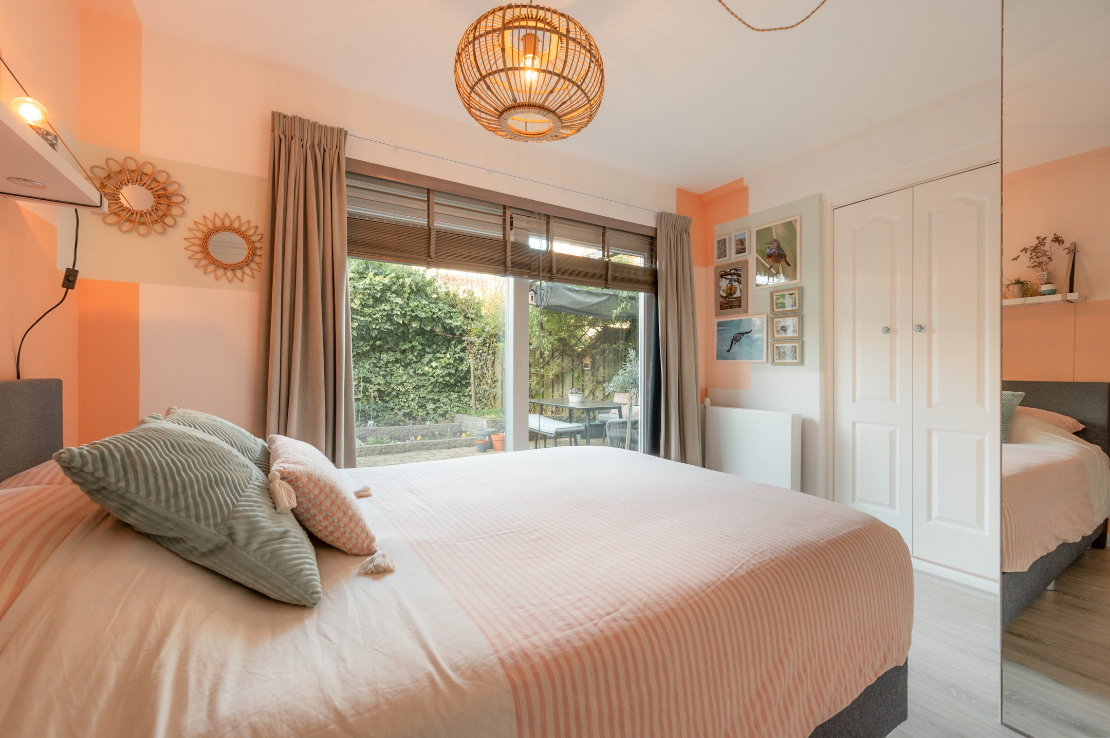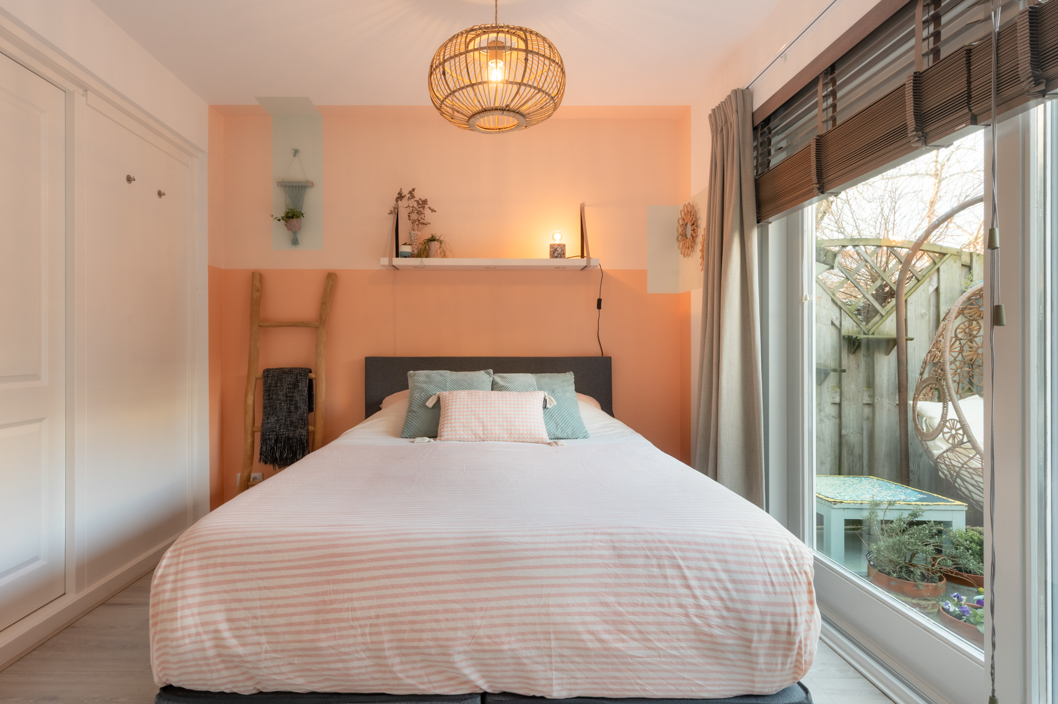 The bedroom is located on the garden side of the house and offers access to the garden through sliding doors. A built-in cupboard has been created for a washing machine, dryer, and connection to the solar panels. From the bedroom, there is access to the separate office. This space would also be suitable as a children's room.