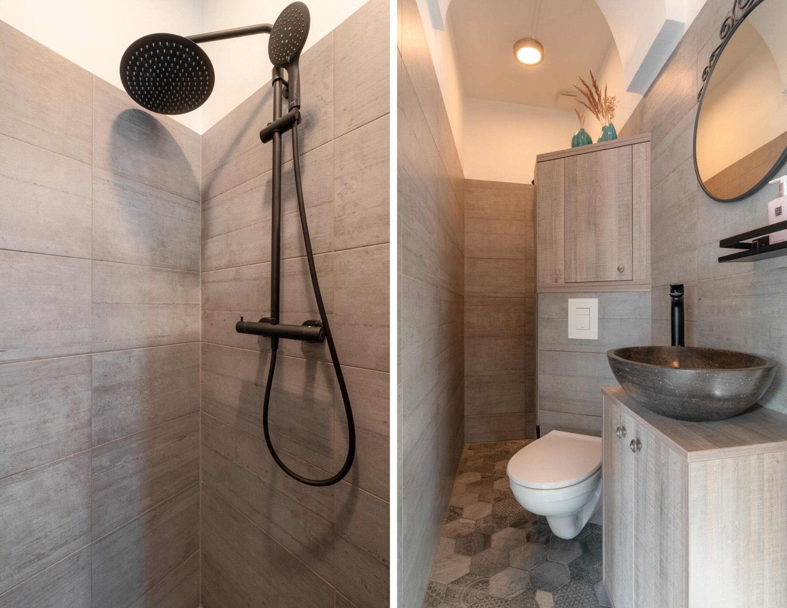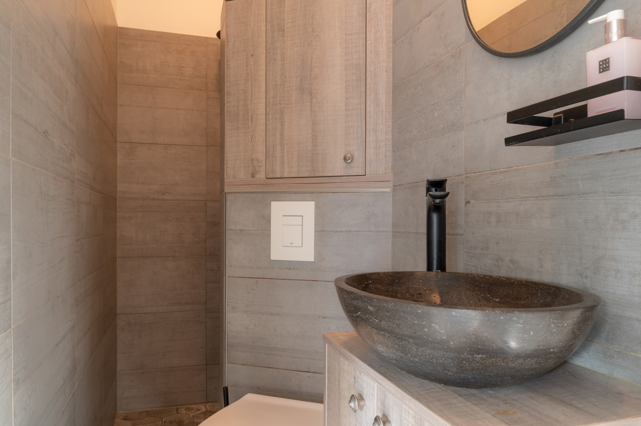 De compacte doch luxe uitgevoerde badkamer is voorzien van een zwevend toilet, wastafel met meubel en een inloopregendouche.