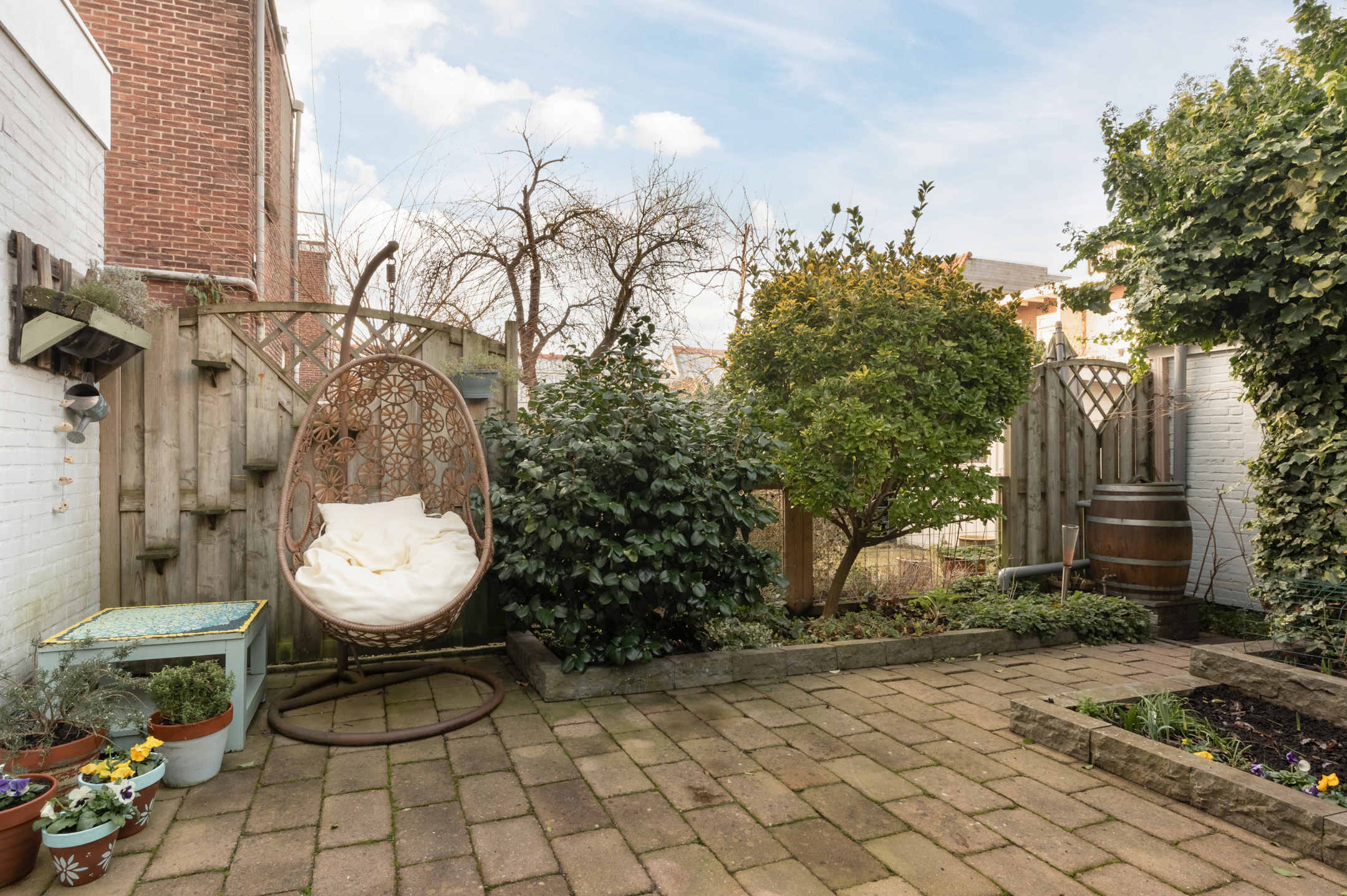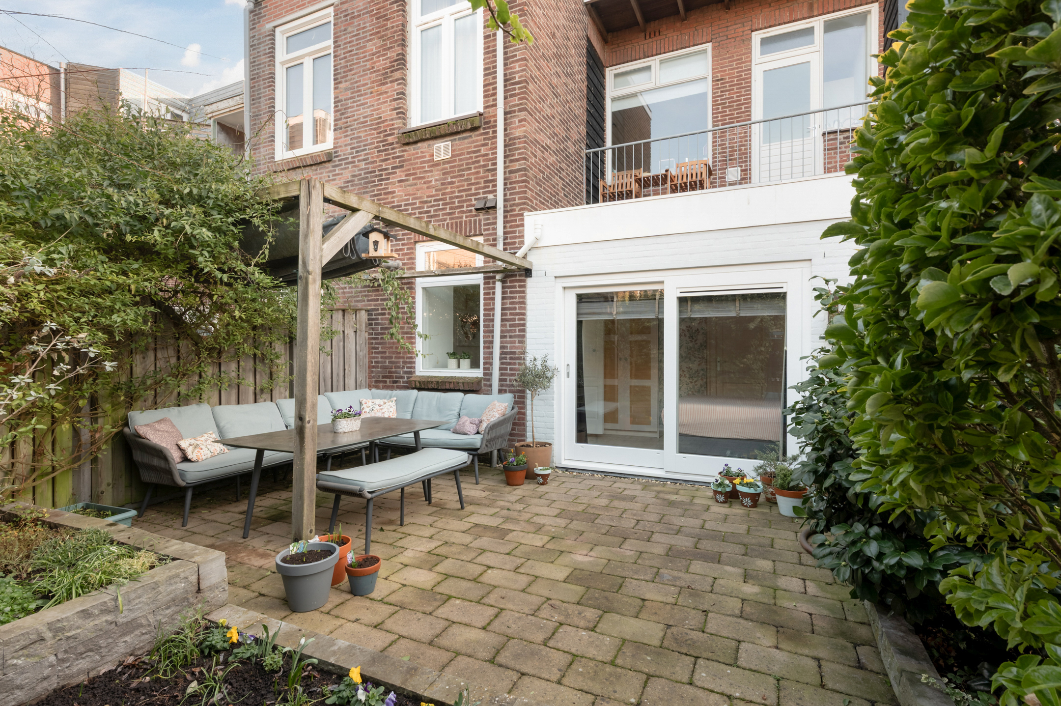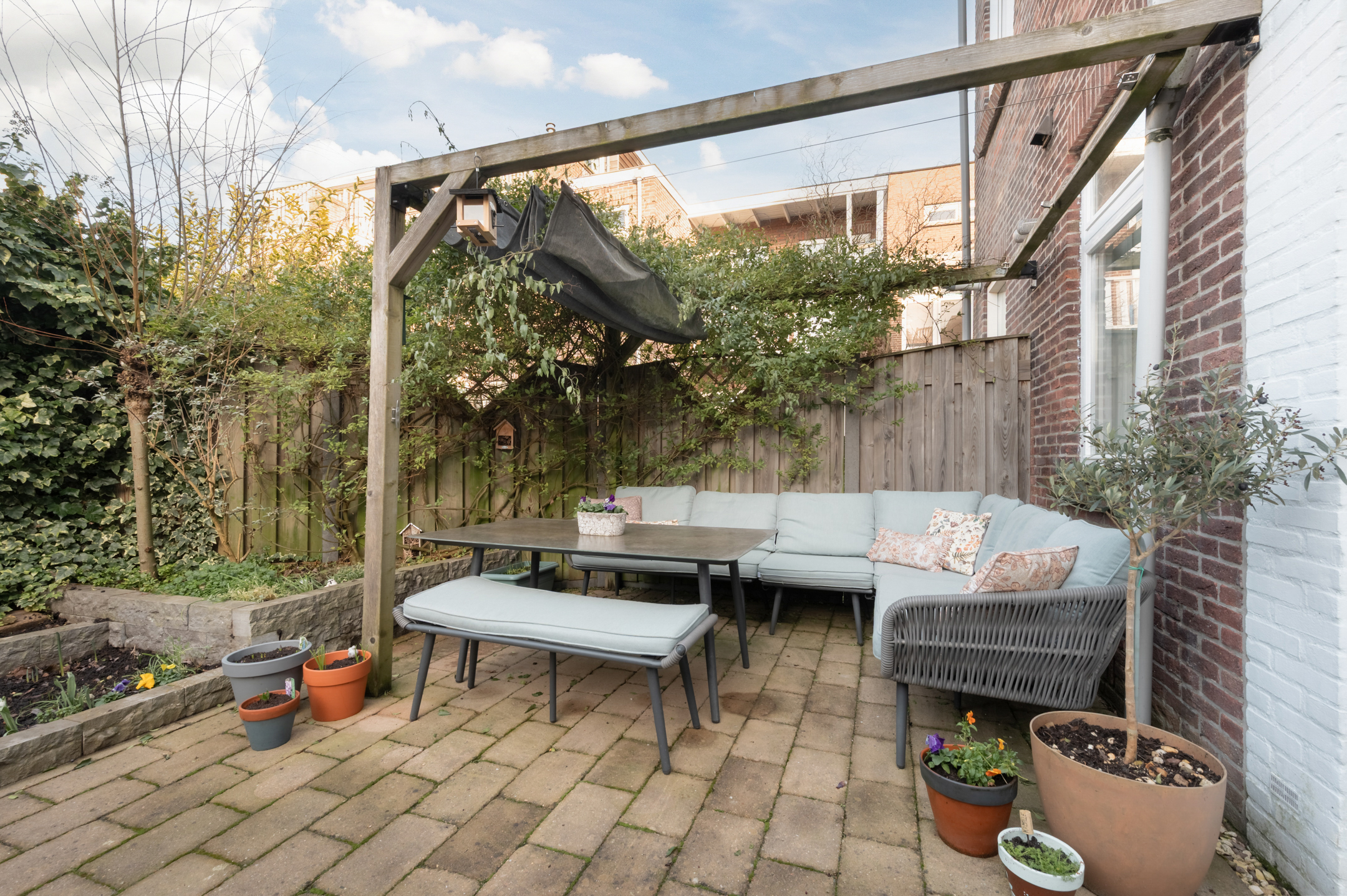 The house has a spacious and sunny west-facing garden with a large tiled terrace interspersed with playfully landscaped green borders. There is also a cozy pergola with shade cloth in the garden. At the back of the garden is a handy stone shed with electricity.