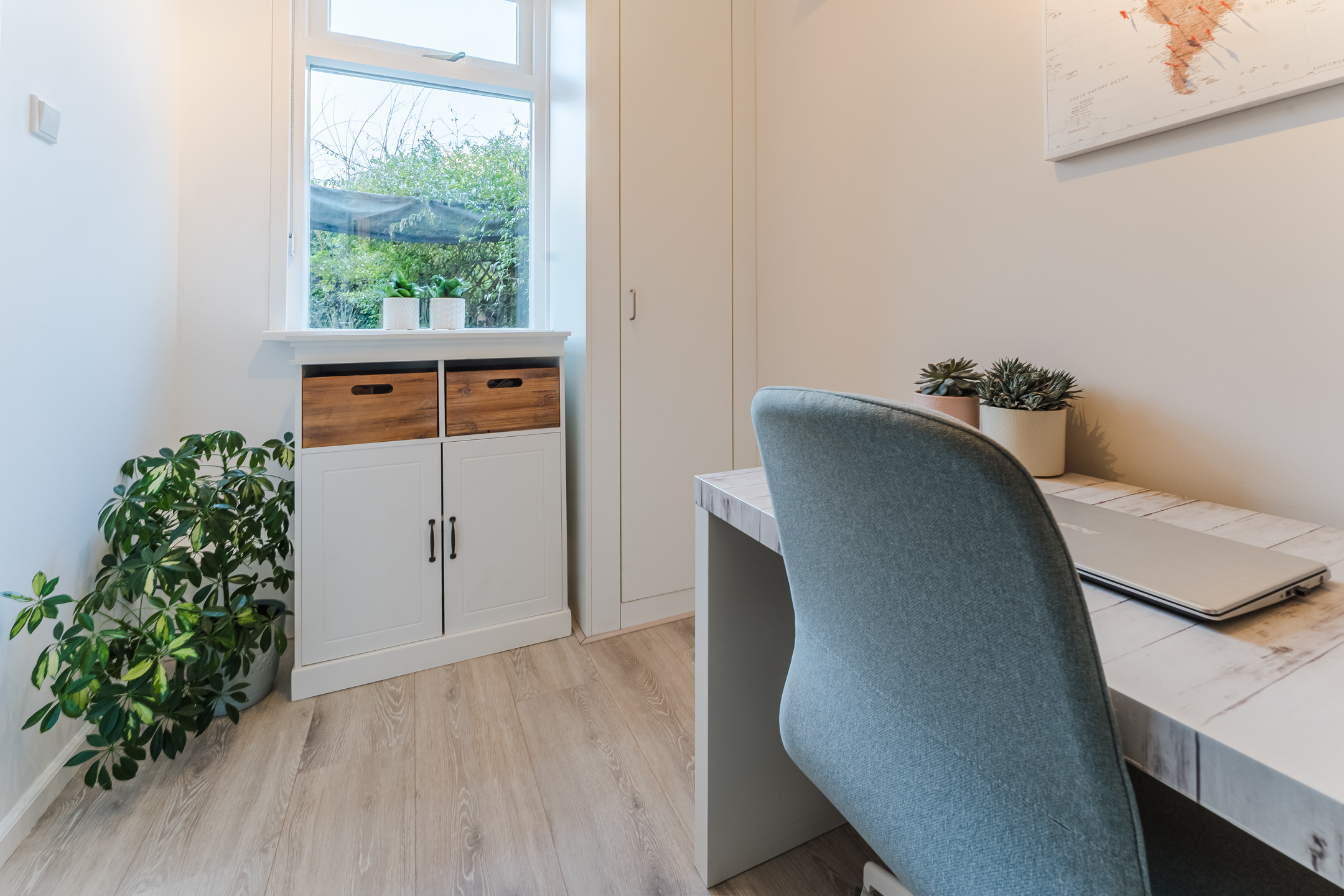 De slaapkamer bevindt zich aan de tuinzijde van de woning en biedt middels een schuifpui toegang tot de tuin. Er is een inbouwkast gerealiseerd voor wasmachine, droger en aansluiting van de zonnepanelen. Vanuit de slaapkamer is er toegang tot het aparte kantoortje. Deze ruimte zou ook zeker geschikt zijn als kinderkamer. Het geheel is netjes afgewerkt met een laminaatvloer.