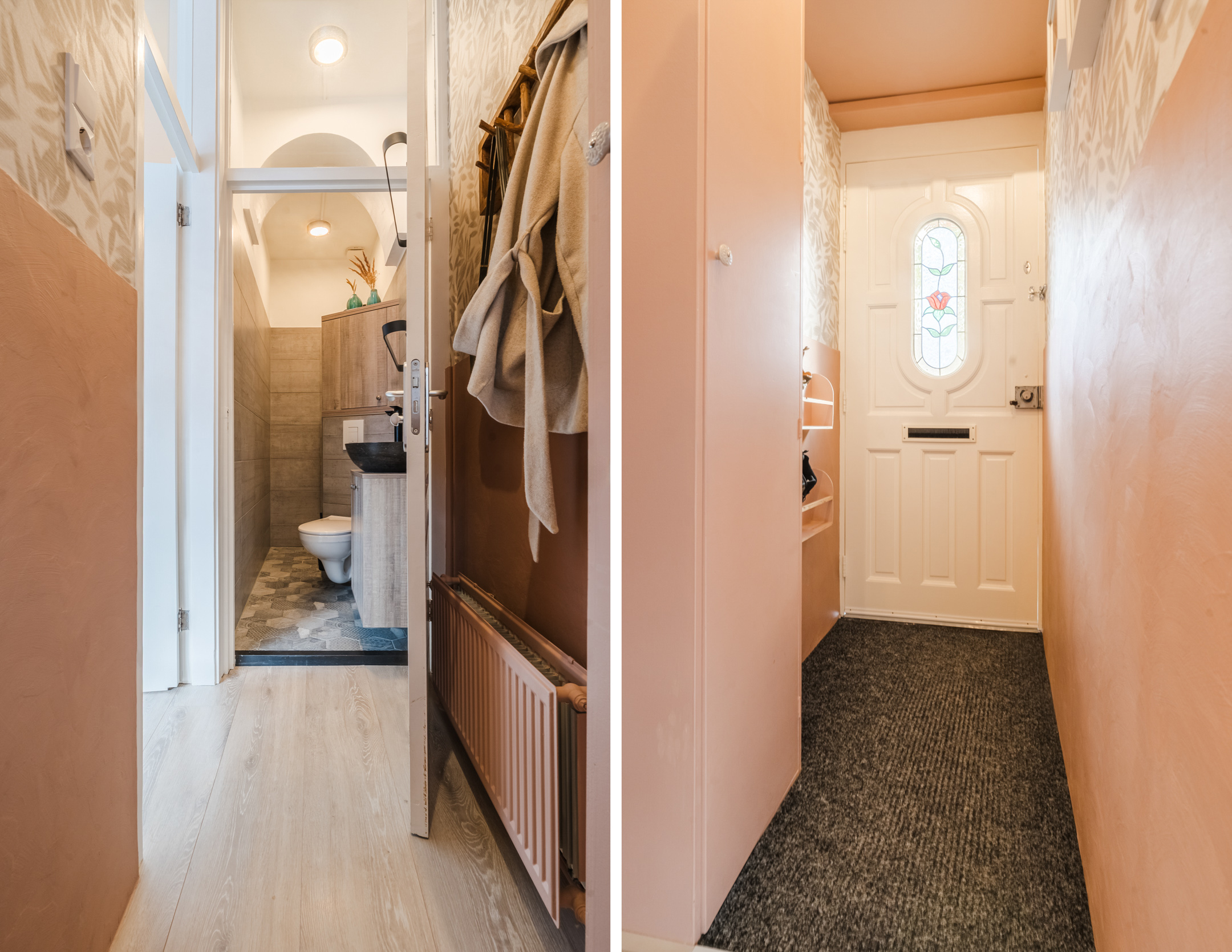 Achter de stijlvolle voordeur met glas-in-lood vinden we de entree met de meterkast en toegang tot zowel de badkamer als tot de woonkamer.