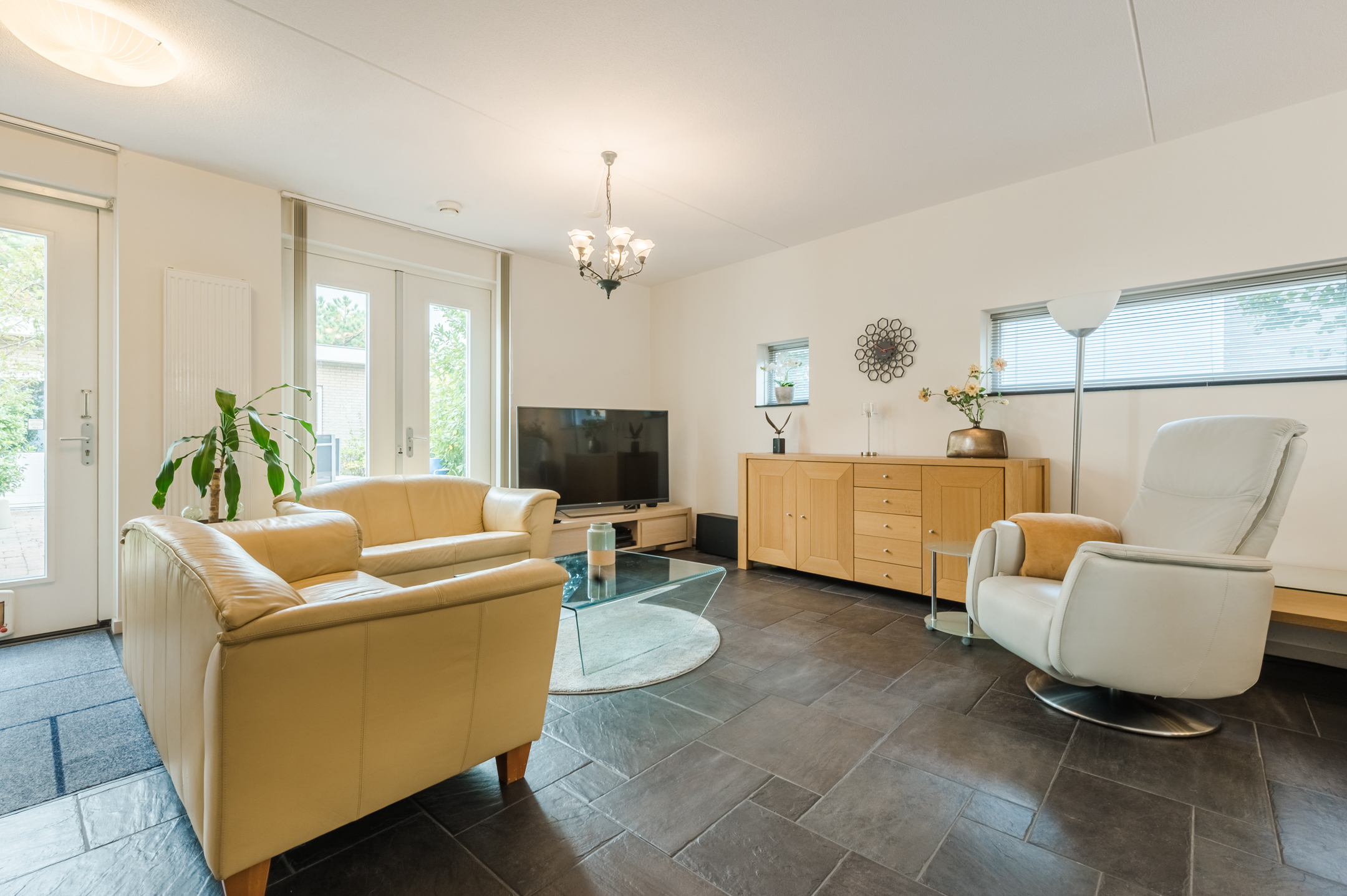 De royale woonkamer is tuingericht, afgewerkt met een plavuizenvloer met vloerverwarming en geniet door de hoekligging van een enorme hoeveelheid lichtinval. Openslaande deuren en een extra achterdeur bieden toegang tot de tuin en zorgen dat het binnen- en buitenleven naadloos in elkaar overgaan.