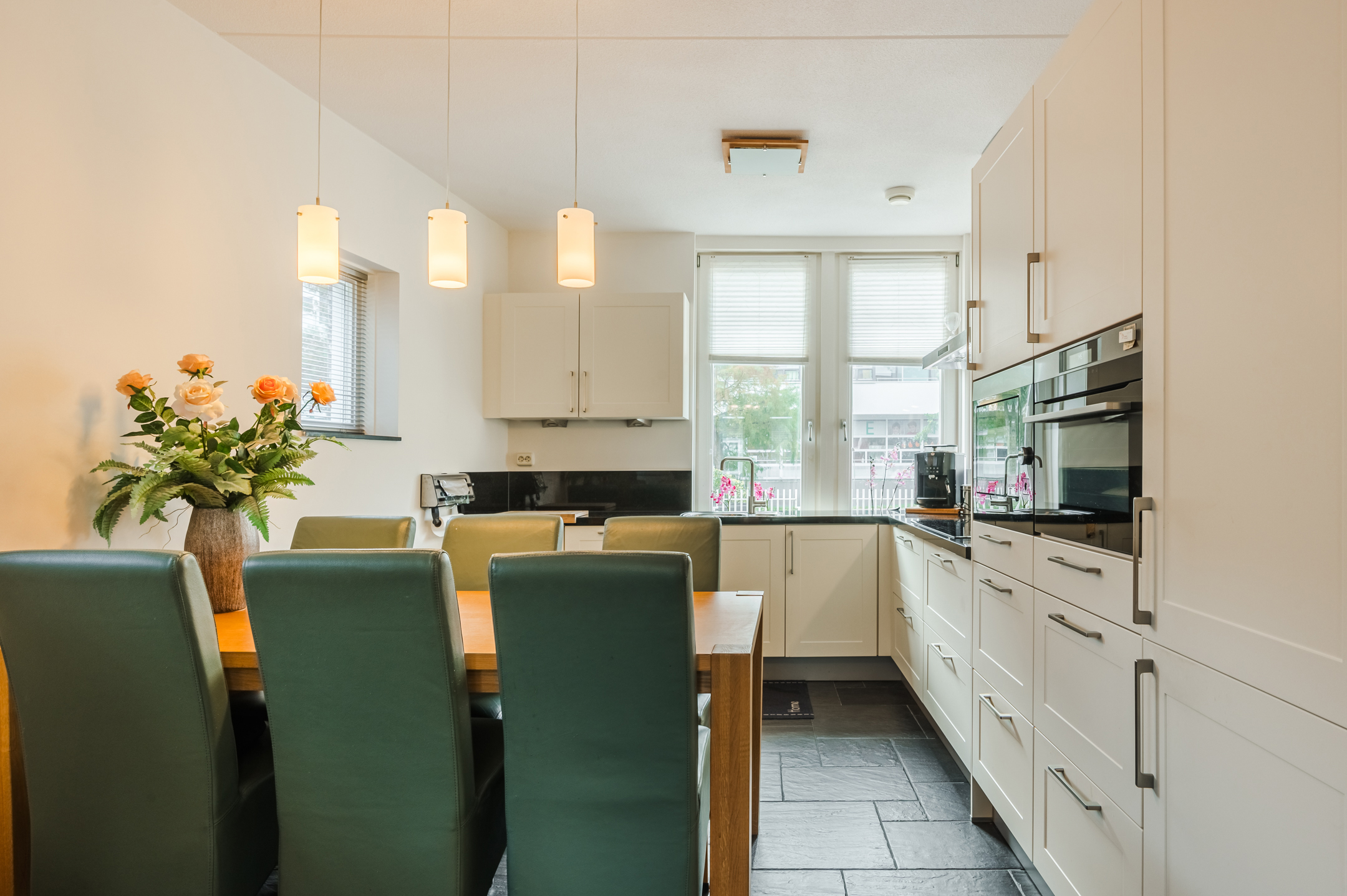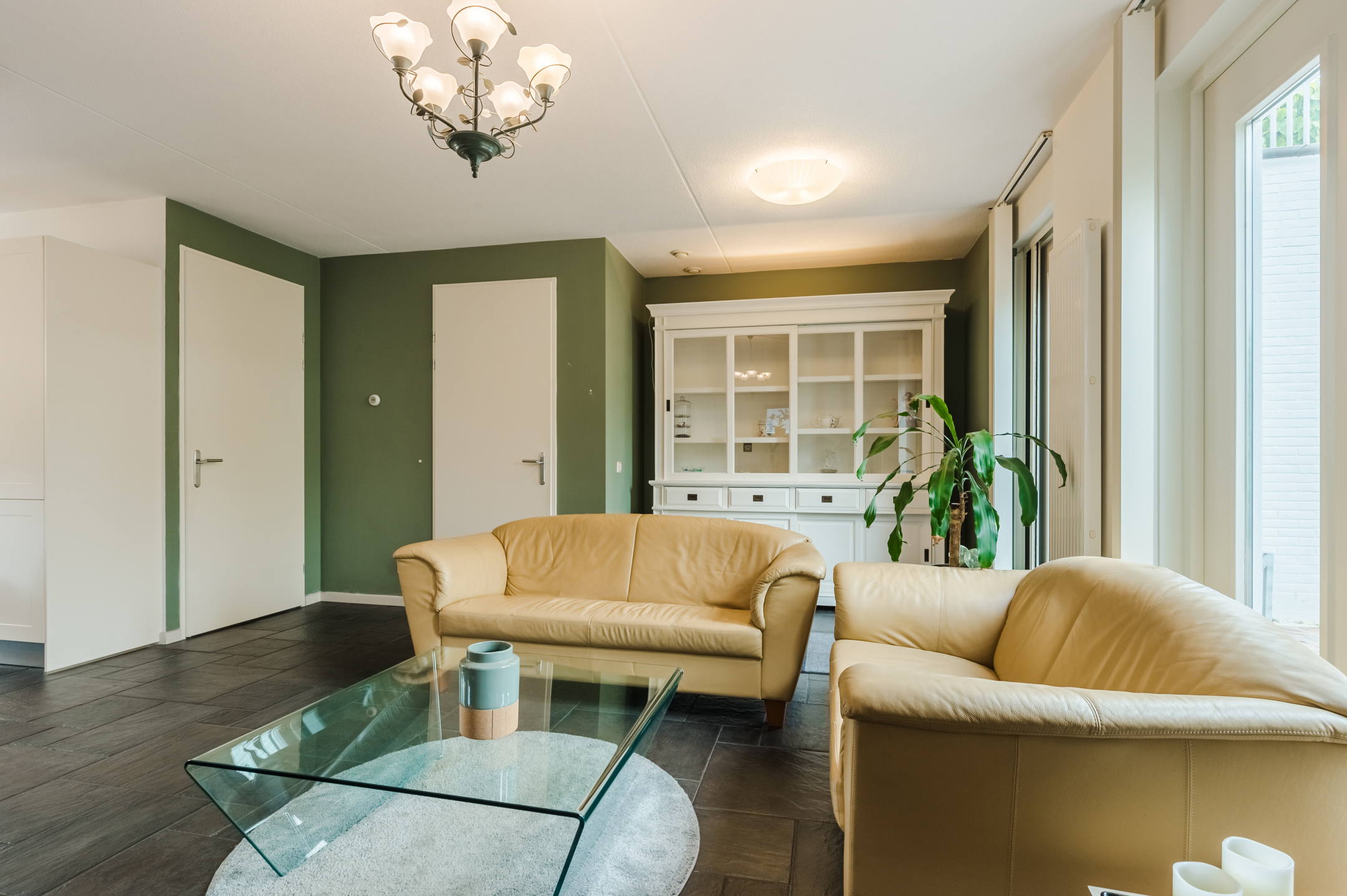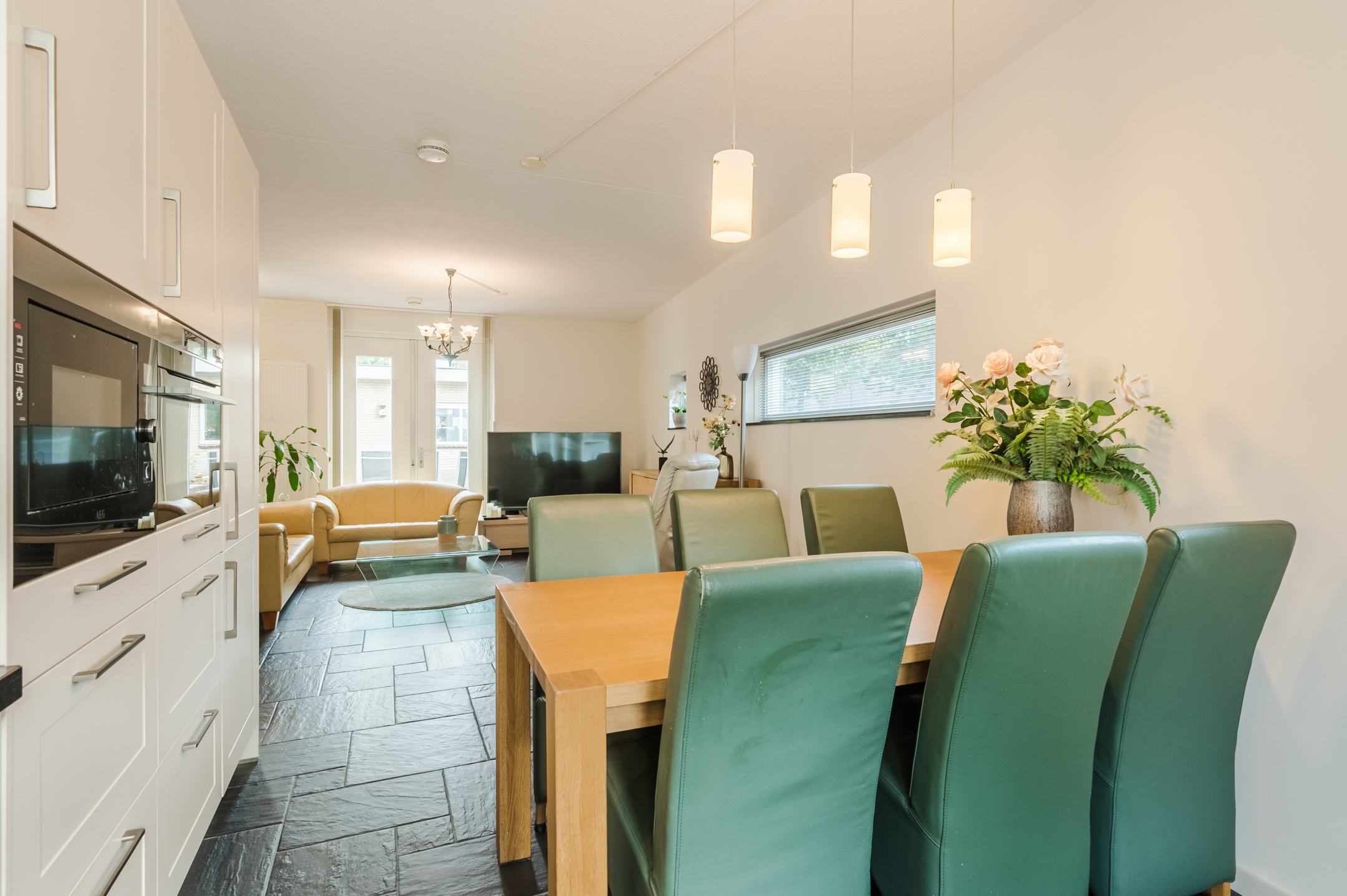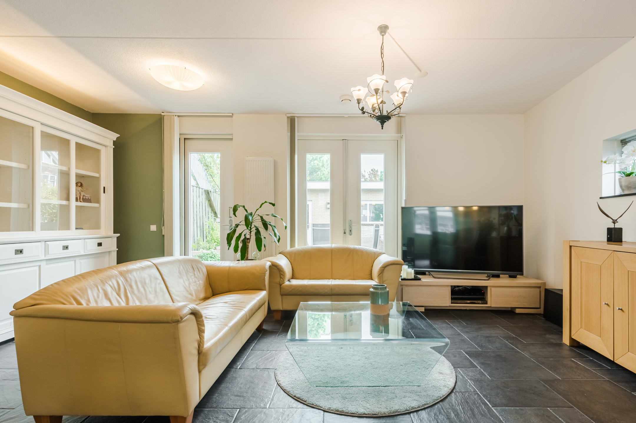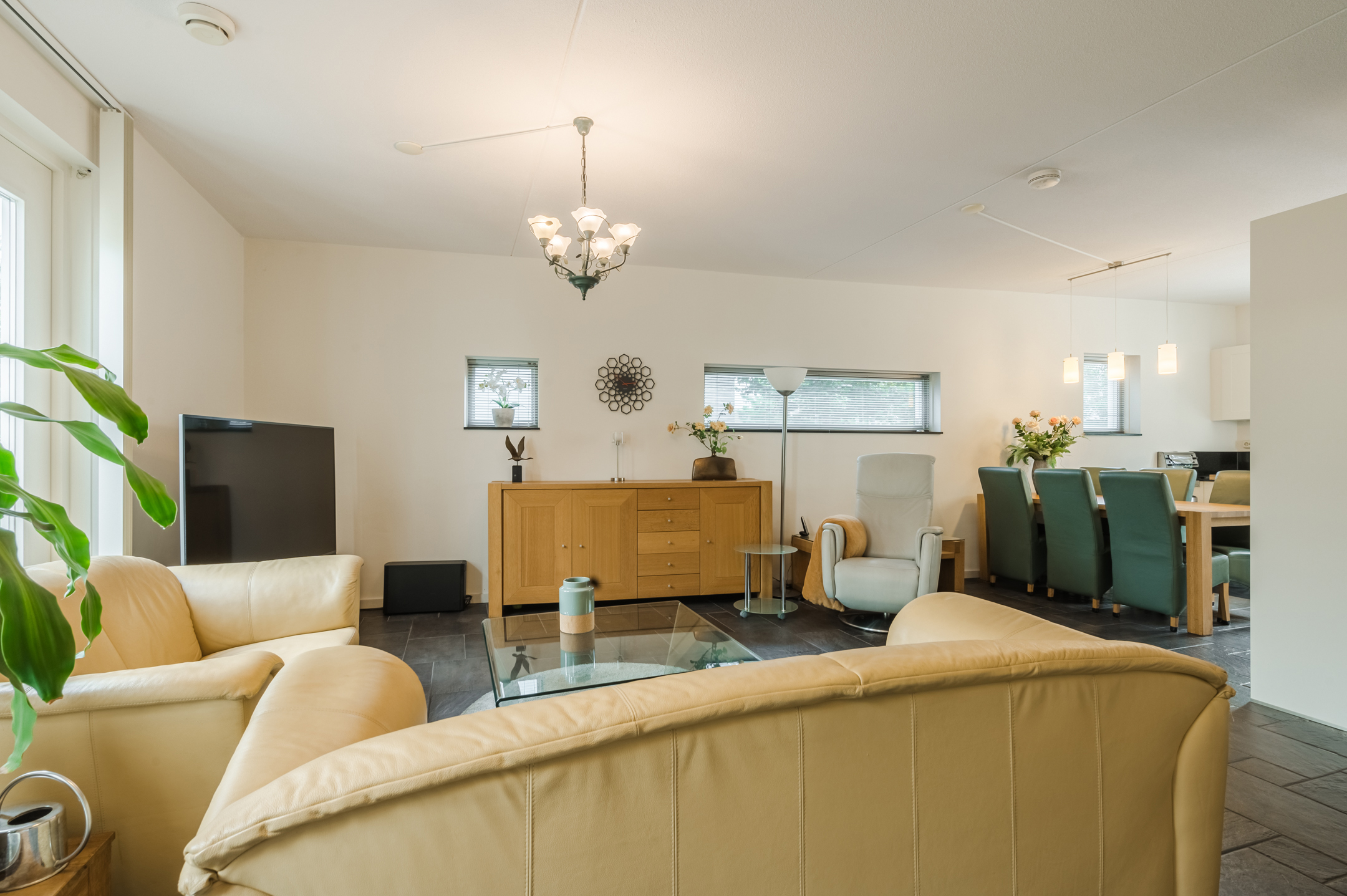 De royale woonkamer is tuingericht, afgewerkt met een plavuizenvloer met vloerverwarming en geniet door de hoekligging van een enorme hoeveelheid lichtinval. Openslaande deuren en een extra achterdeur bieden toegang tot de tuin en zorgen dat het binnen- en buitenleven naadloos in elkaar overgaan.