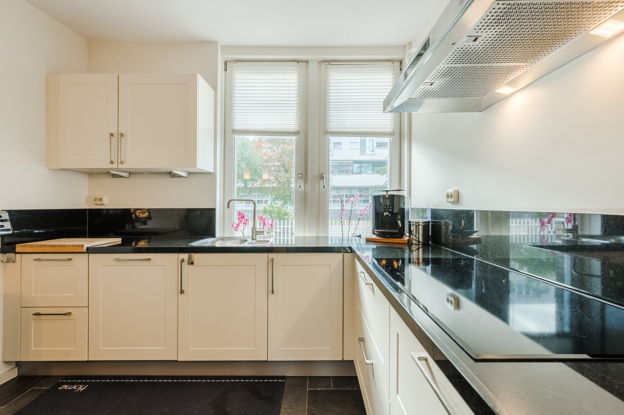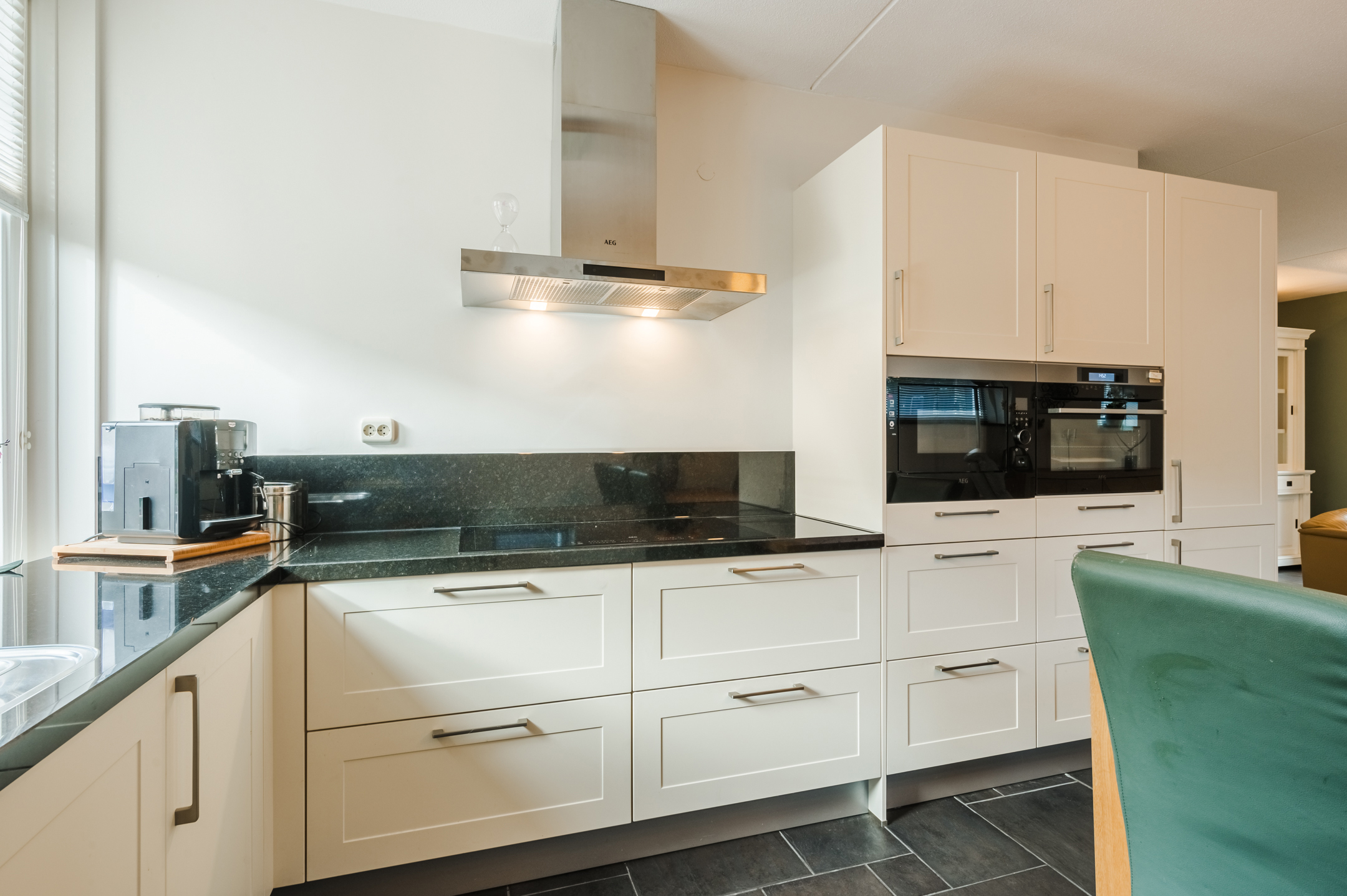 De moderne open keuken is van 2020 en compleet uitgerust met inbouwapparatuur: een inductiekookplaat, afzuigkap, oven, magnetron, koelkast/diepvries en een vaatwasser.