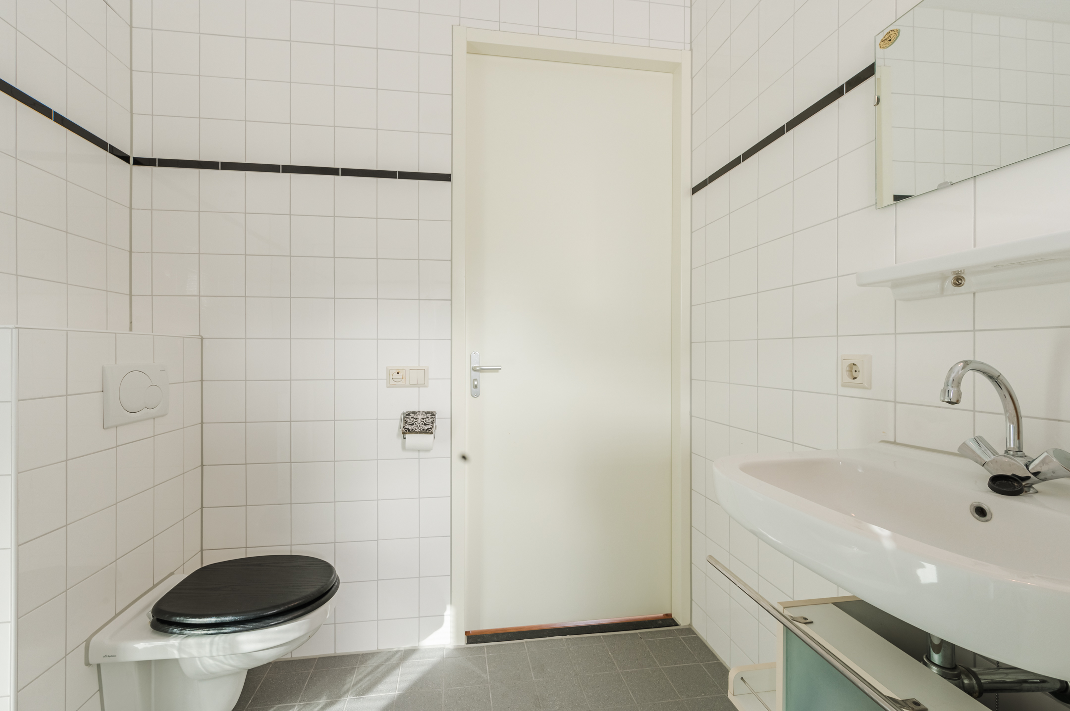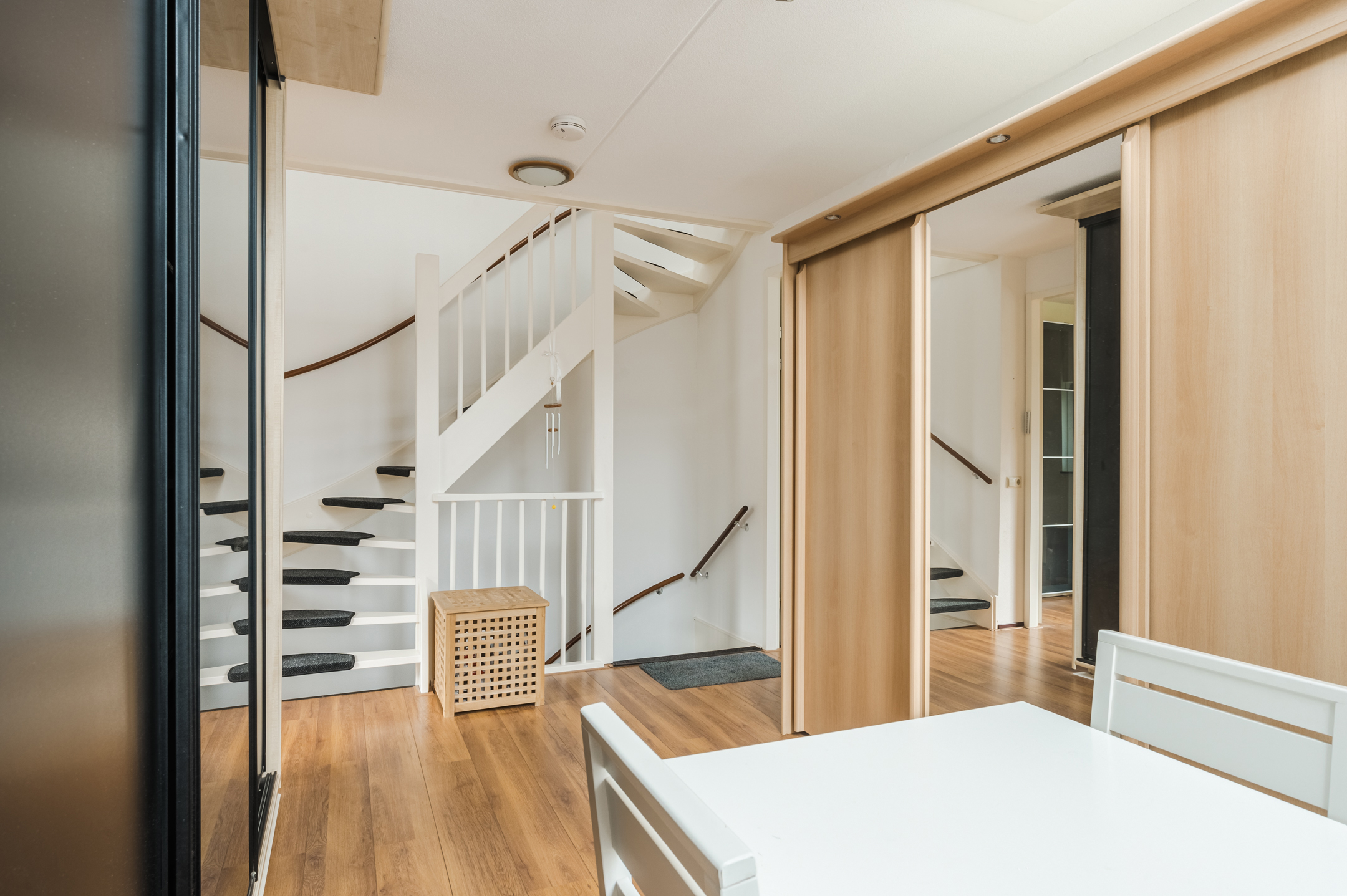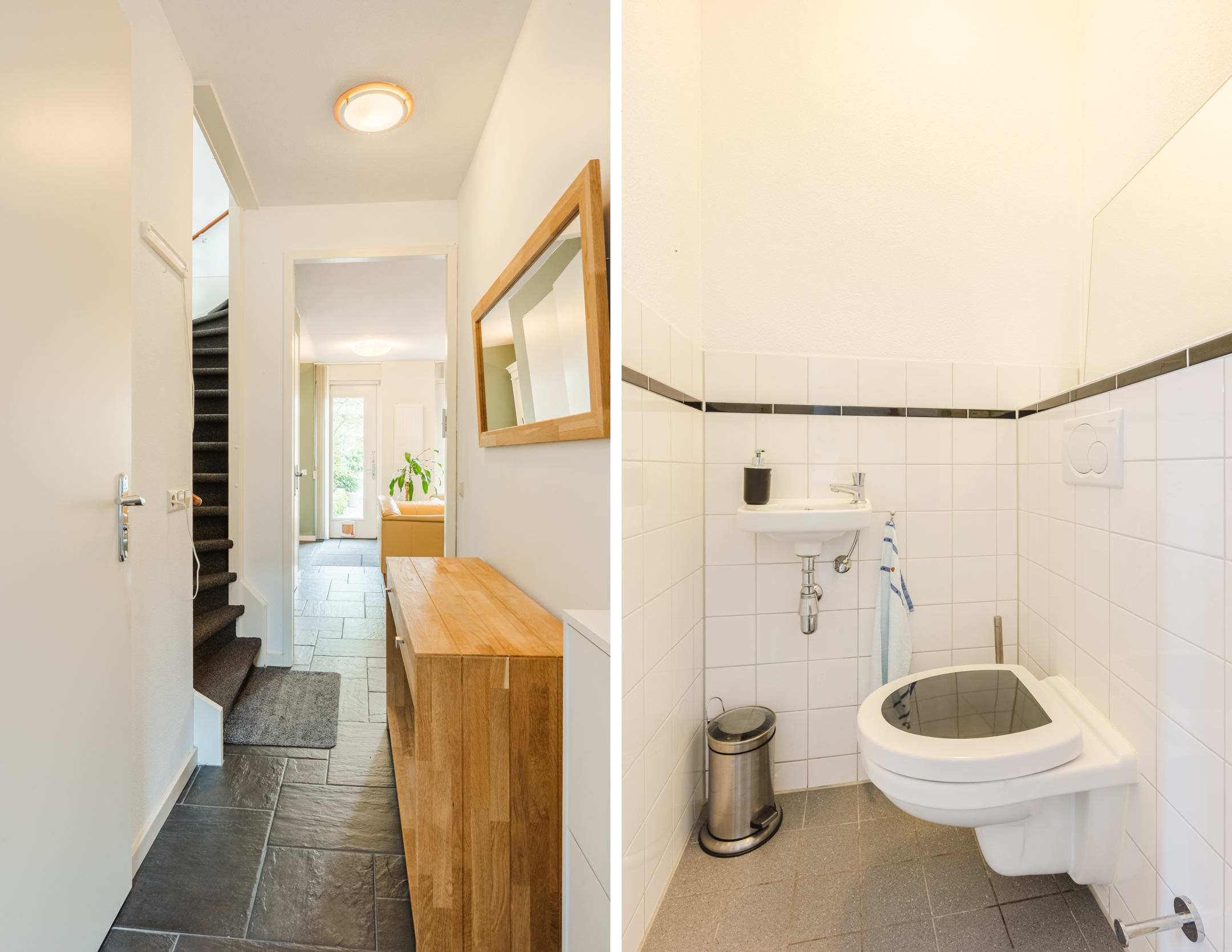 Achter de voordeur vinden we de entreehal met de meterkast, het gastentoilet met fonteintje, de trapopgang naar de eerste verdieping en de toegang tot de woonkamer met open keuken.