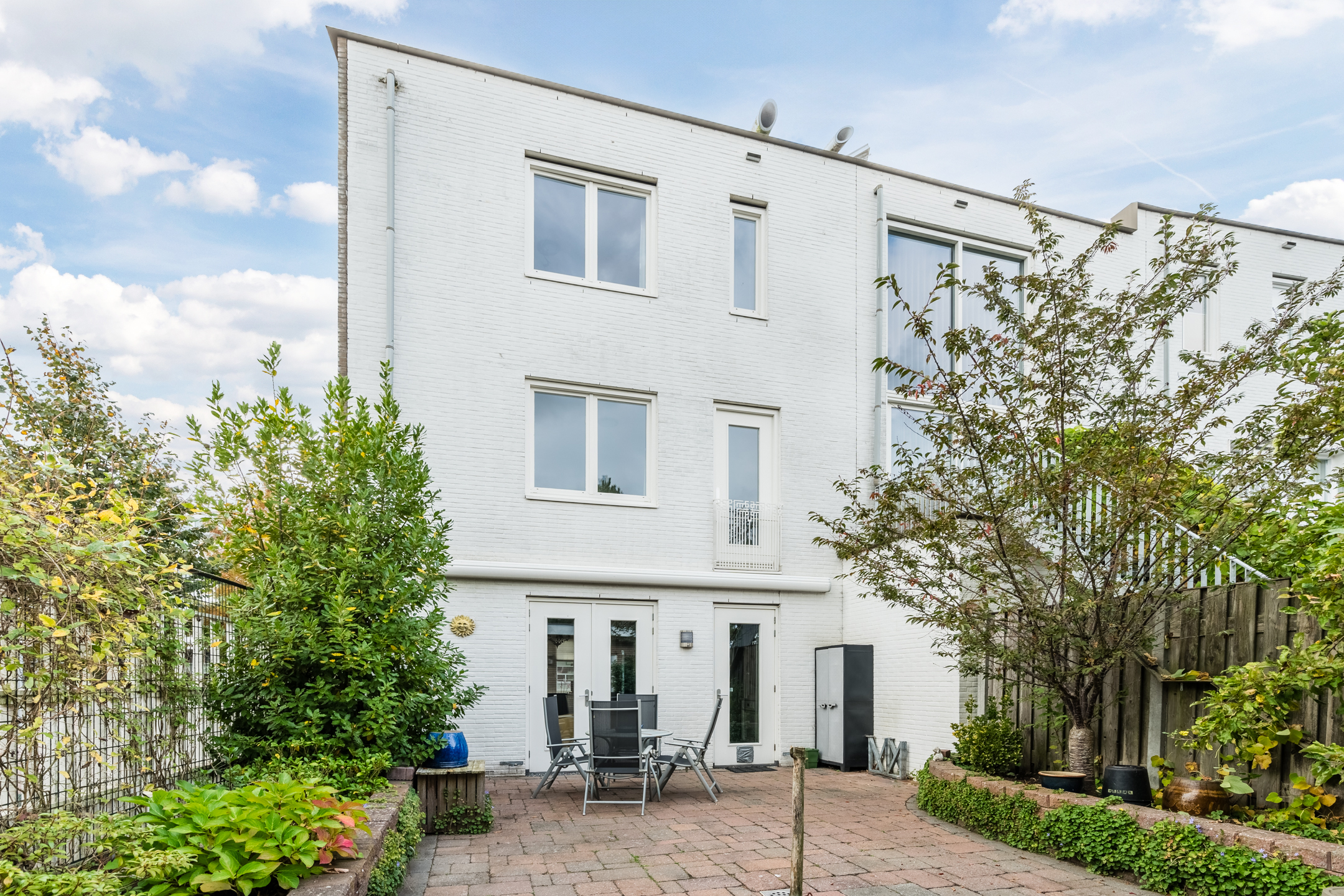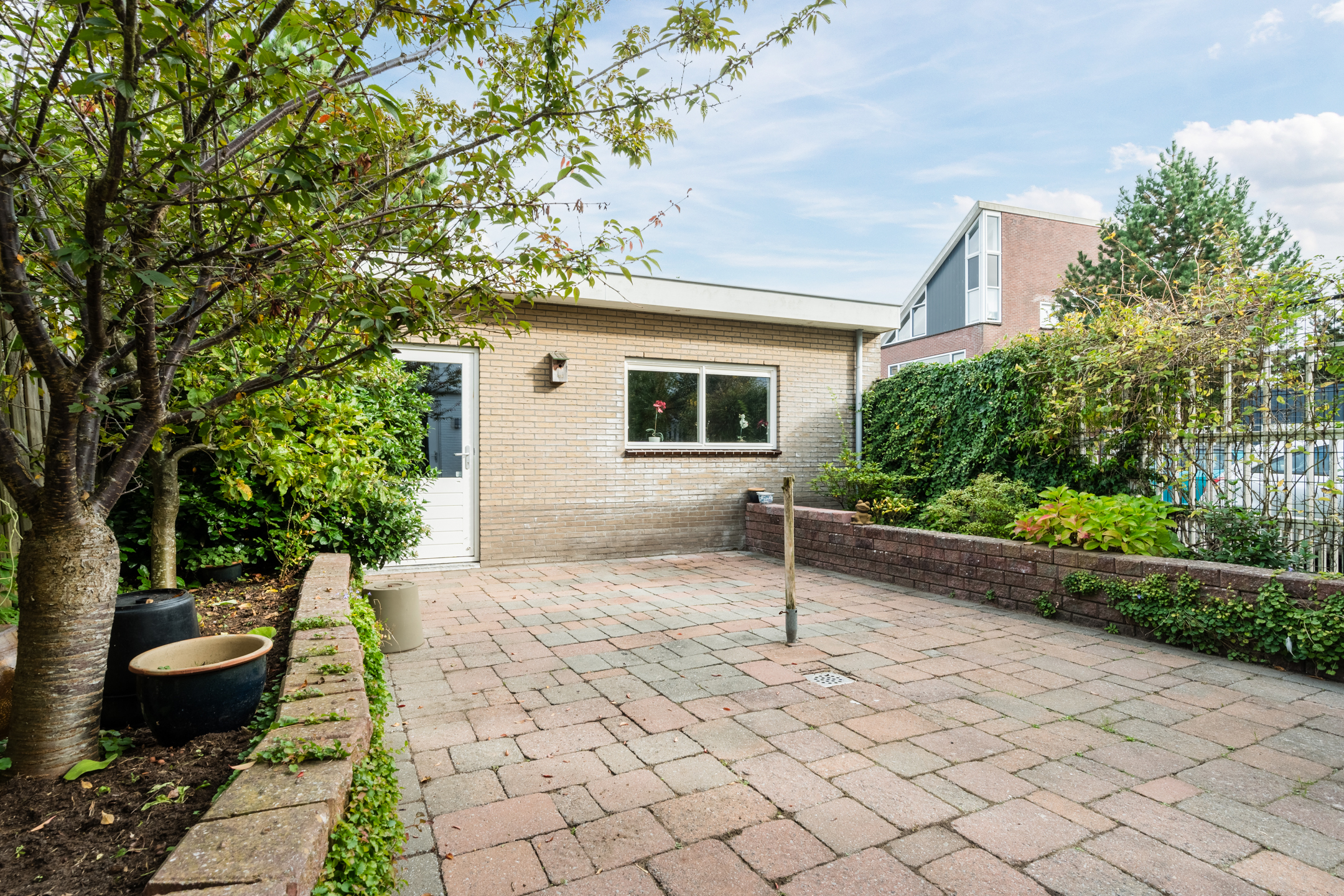 De woning beschikt over een knusse en onderhoudsvriendelijke achtertuin op het oosten welke beschikt over een groot betegeld terras dat wordt omlijst door groene borders. Achterin de tuin staat de grote stenen garagebox.