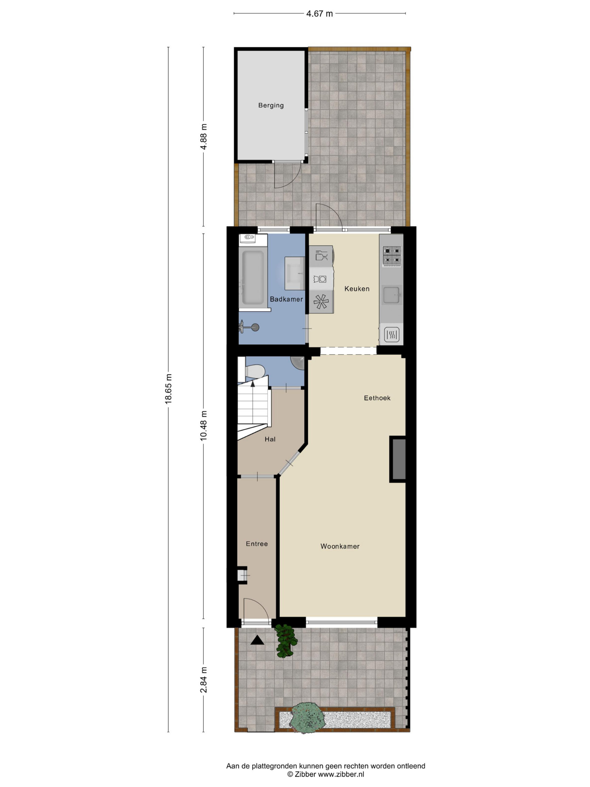 De achtertuin is compleet in het hard aangelegd en beschikt over een vrijstaande berging, geschikt voor fietsen en opslag. Parkeren vindt plaats in de openbare parkeervakken in de straat.