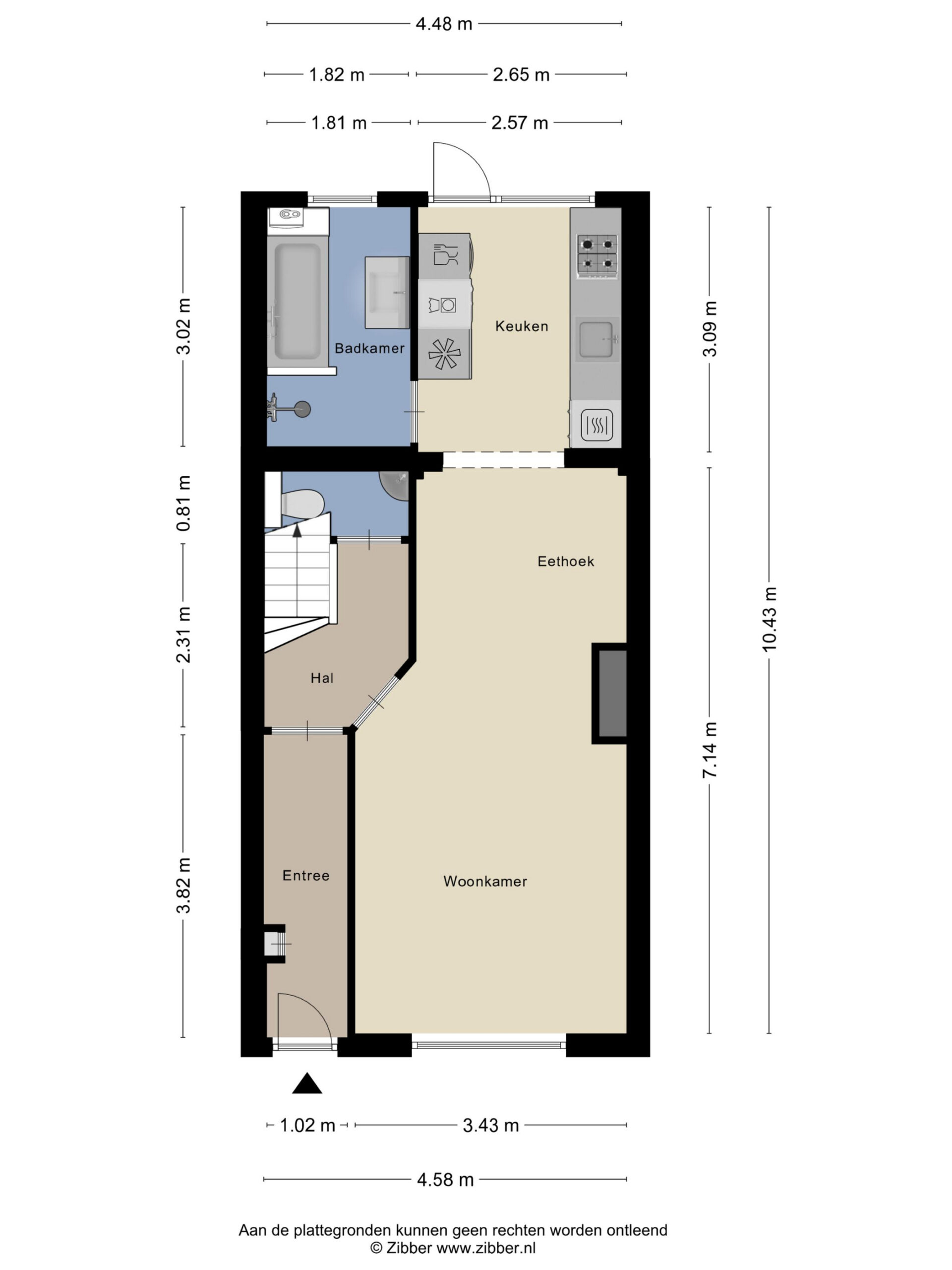 Via de entree aan de voorzijde kom je in de hal met trapopgang naar de bovenverdieping en het toilet met fonteintje. De woonkamer en het eetgedeelte vormen samen een volwaardige leefruimte met een prettige verhouding tussen zitten en tafelen. Aan de achterzijde ligt de keuken, opgesteld in een rechte wandopstelling en voorzien van kastruimte, werkblad en diverse apparatuur (gaskookplaat, afzuigkap, combi-oven en combimagnetron). Vanuit de keuken is er directe toegang tot de achtertuin en de badkamer. De badkamer is licht betegeld en uitgerust met een ligbad, separate regendouche en een wastafelmeubel.