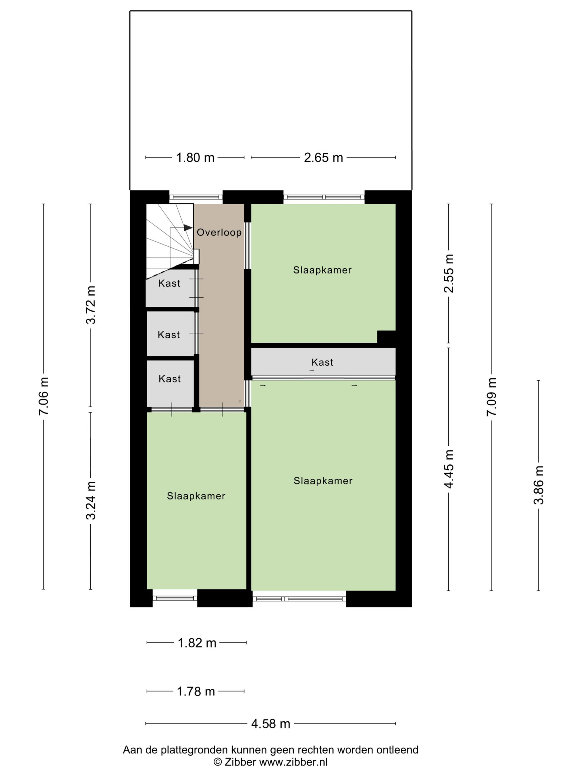 Op de bovenverdieping grenzen drie slaapkamers en extra bergruimte aan de overloop. Aan de achterzijde ligt een slaapkamer (2,55 x 2,65), en aan de voorzijde bevinden zich twee slaapkamers (3,24 x 1,82) en (4,45 x 2,65). Alle slaapkamers zijn voorzien van daglicht en geschikt als slaap-, werk- of hobbyruimte.