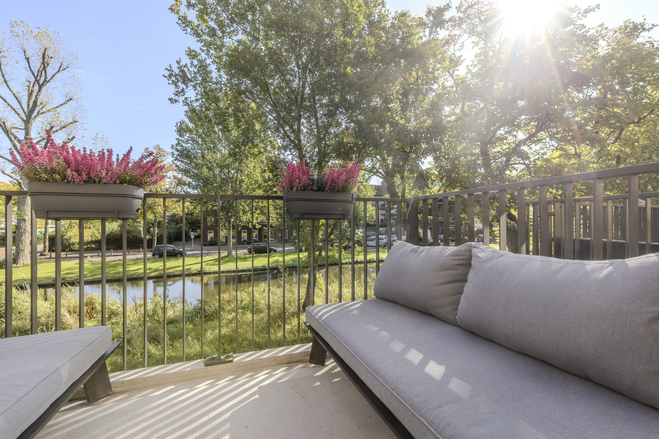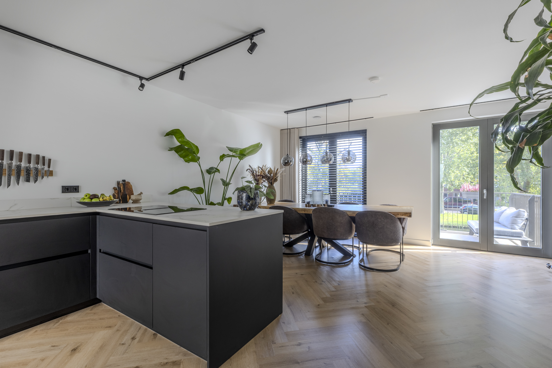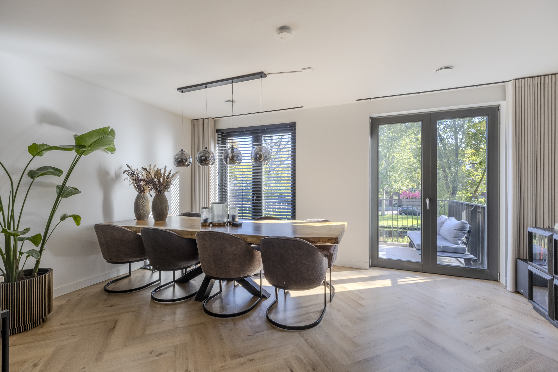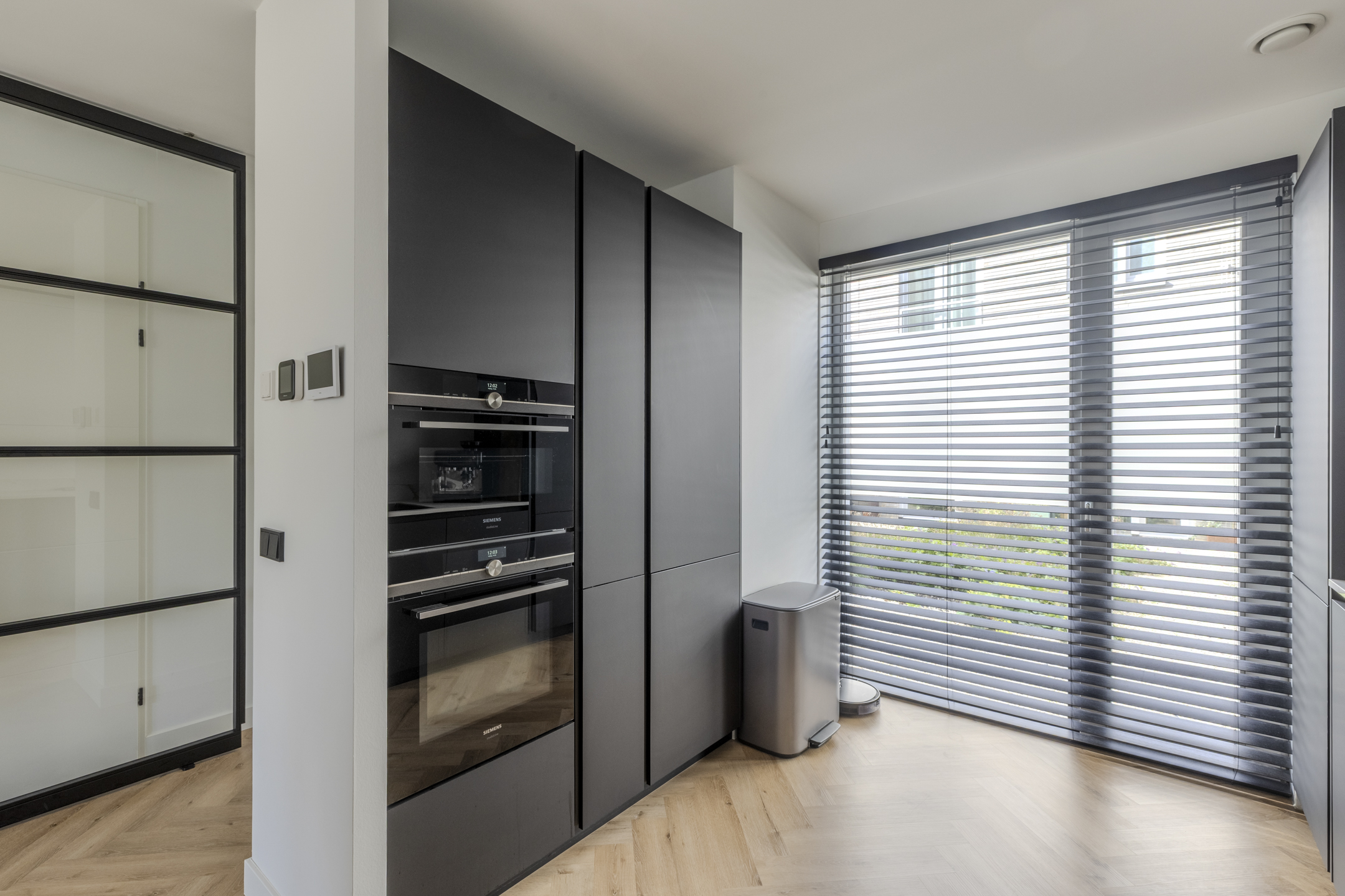 De lichte woonkamer geniet van een prettige hoeveelheid lichtinval en is strak afgewerkt met een PVC-vloer met vloerverwarming. Openslaande deuren bieden toegang tot een ruim balkon en een tweede set openslaande deuren fungeert als Frans balkon. Deze ligt aan de achterzijde van de woning op het westen (middag/avondzon). Zowel vanuit de woonkamer als vanaf het balkon kijkt u uit over het water.