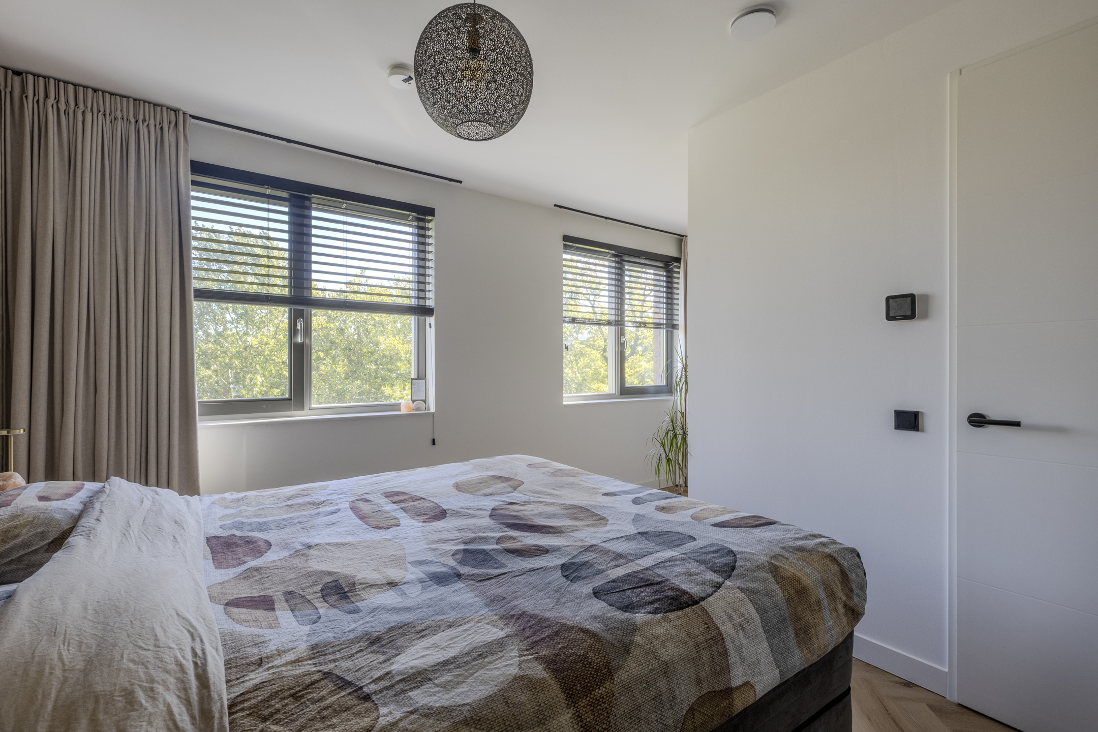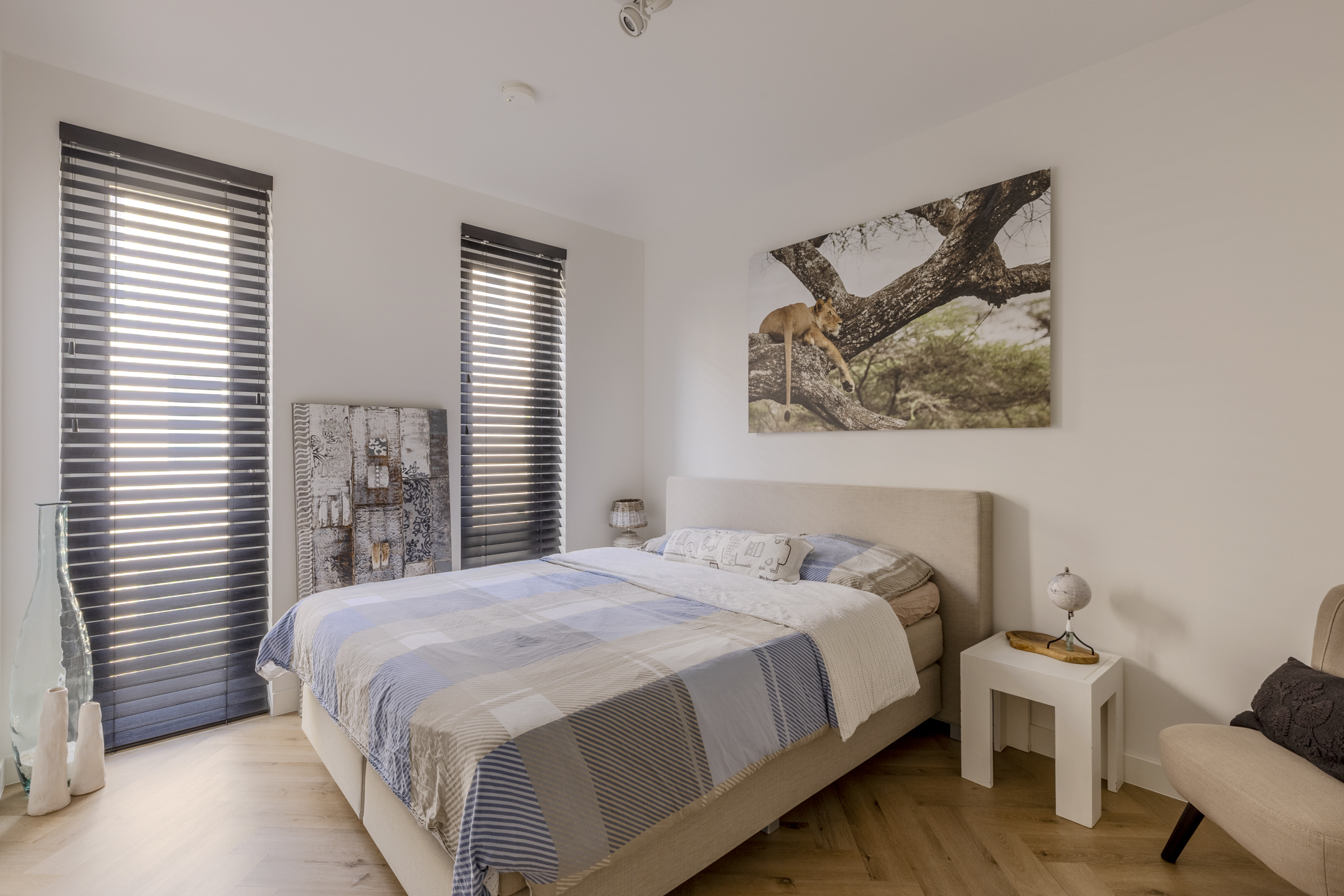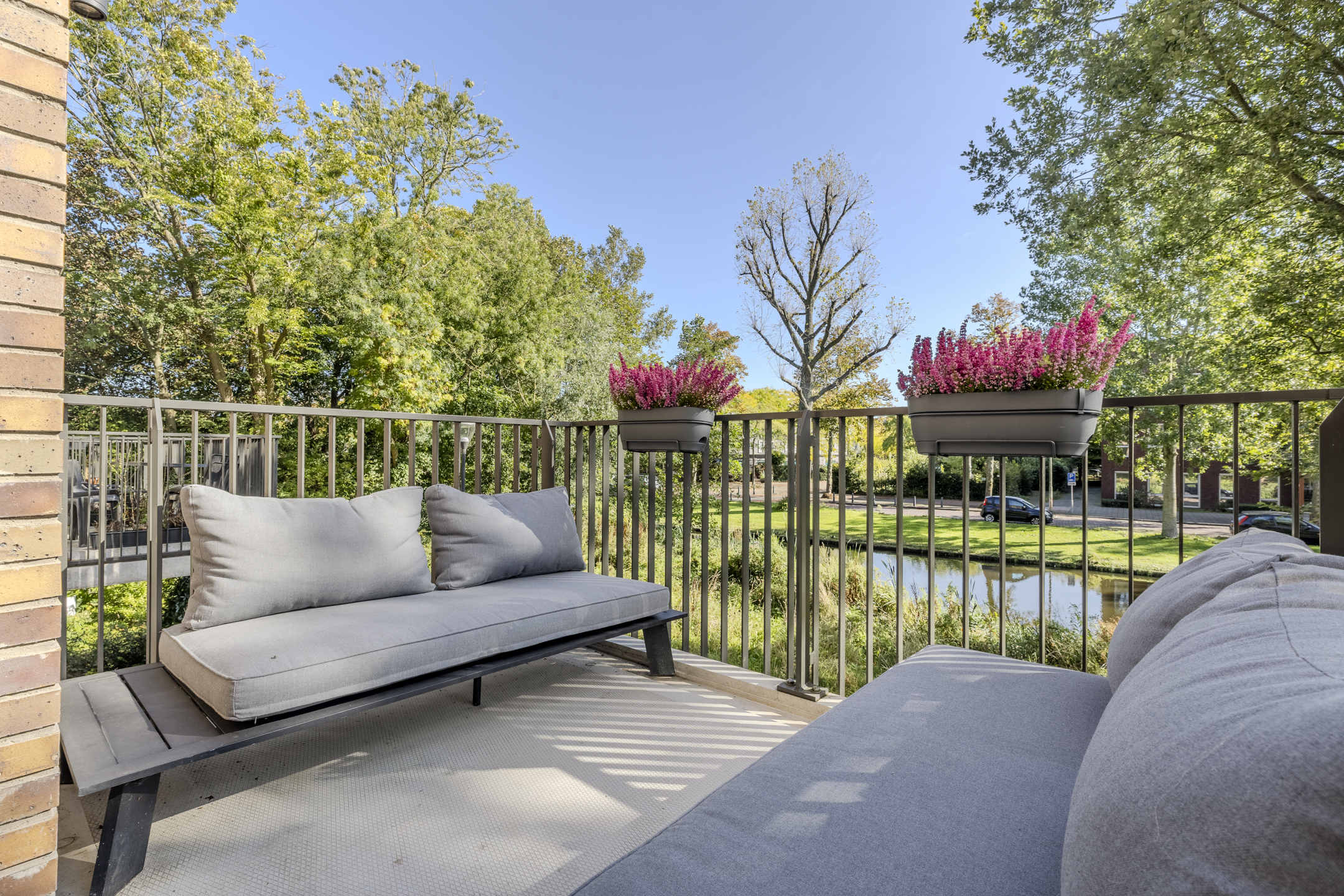 De lichte woonkamer geniet van een prettige hoeveelheid lichtinval en is strak afgewerkt met een PVC-vloer met vloerverwarming. Openslaande deuren bieden toegang tot een ruim balkon en een tweede set openslaande deuren fungeert als Frans balkon. Deze ligt aan de achterzijde van de woning op het westen (middag/avondzon). Zowel vanuit de woonkamer als vanaf het balkon kijkt u uit over het water.