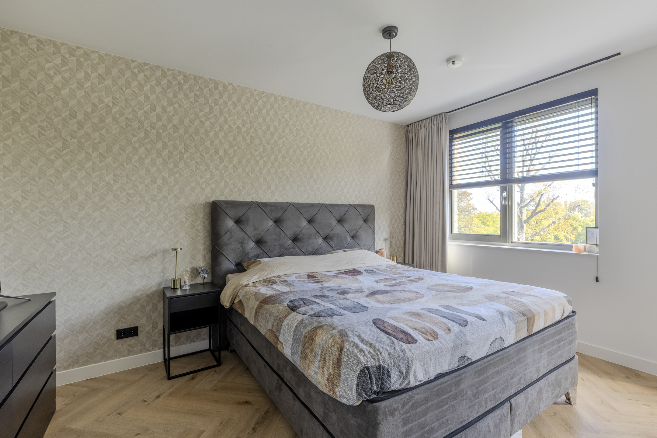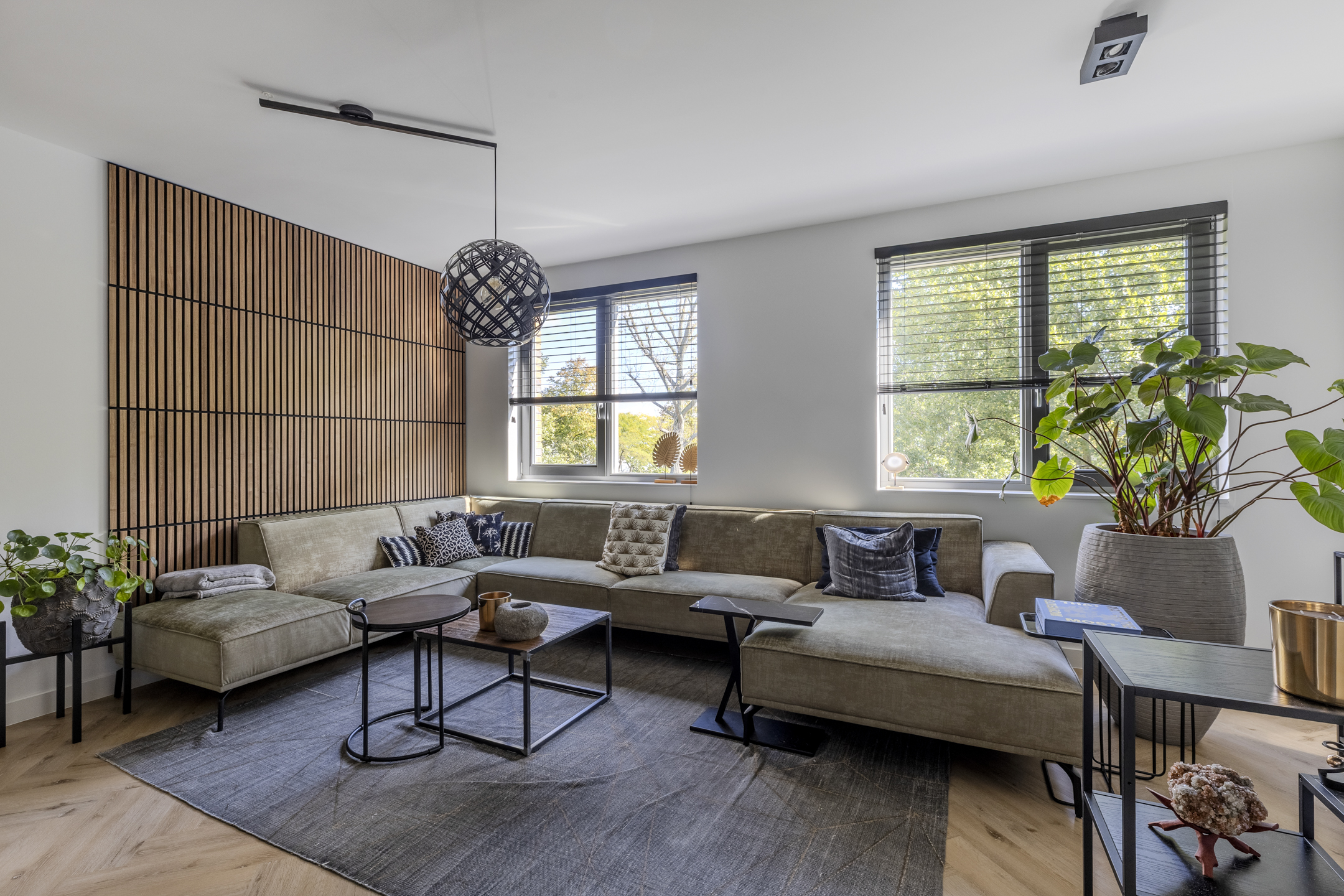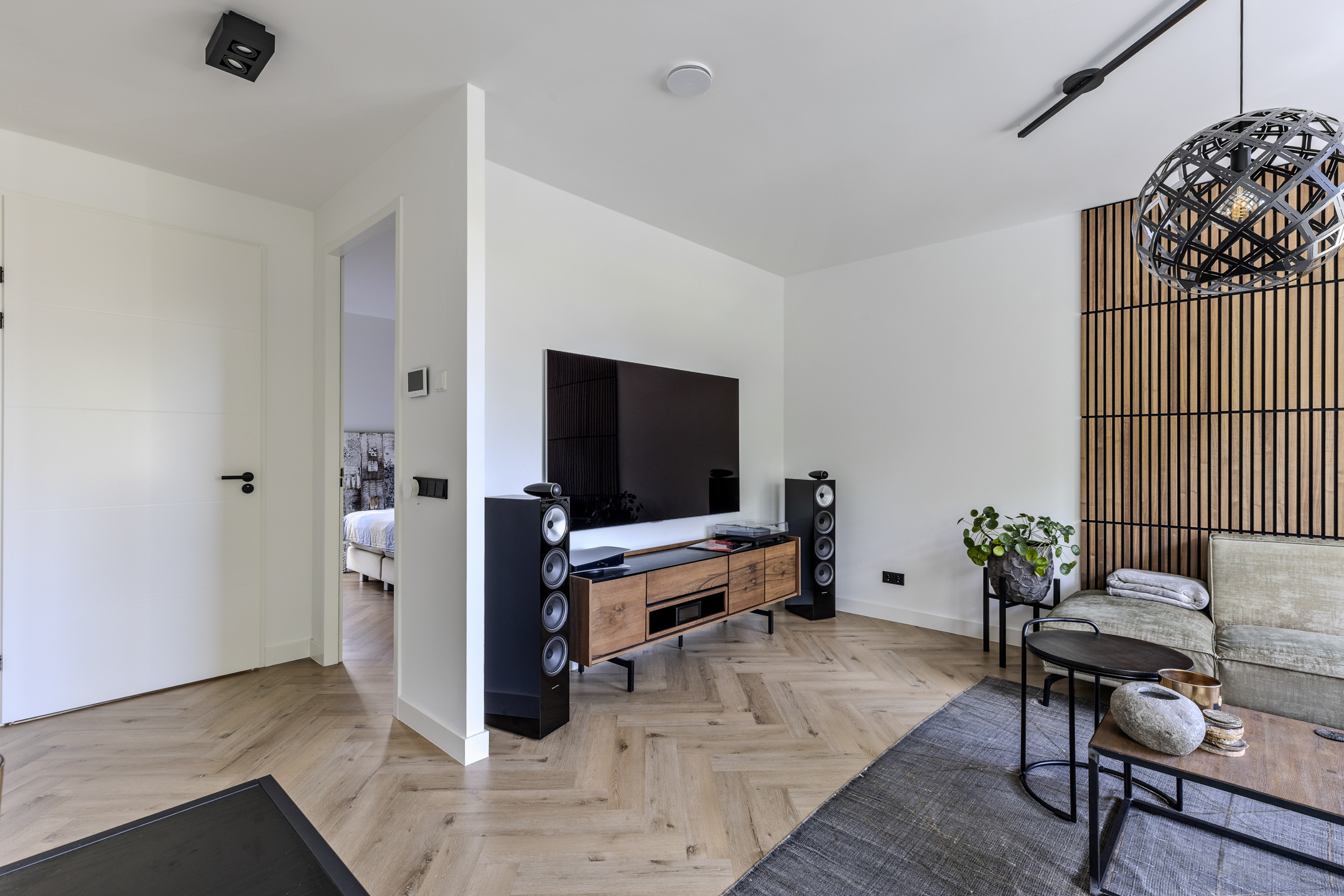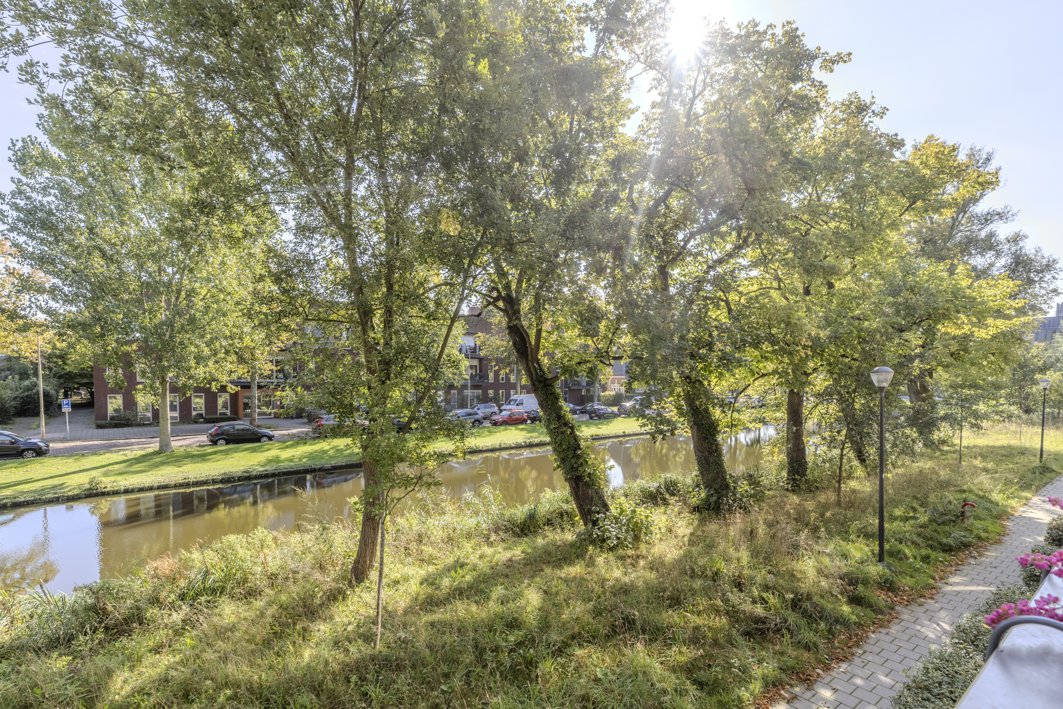 De lichte woonkamer geniet van een prettige hoeveelheid lichtinval en is strak afgewerkt met een PVC-vloer met vloerverwarming. Openslaande deuren bieden toegang tot een ruim balkon en een tweede set openslaande deuren fungeert als Frans balkon. Deze ligt aan de achterzijde van de woning op het westen (middag/avondzon). Zowel vanuit de woonkamer als vanaf het balkon kijkt u uit over het water.
