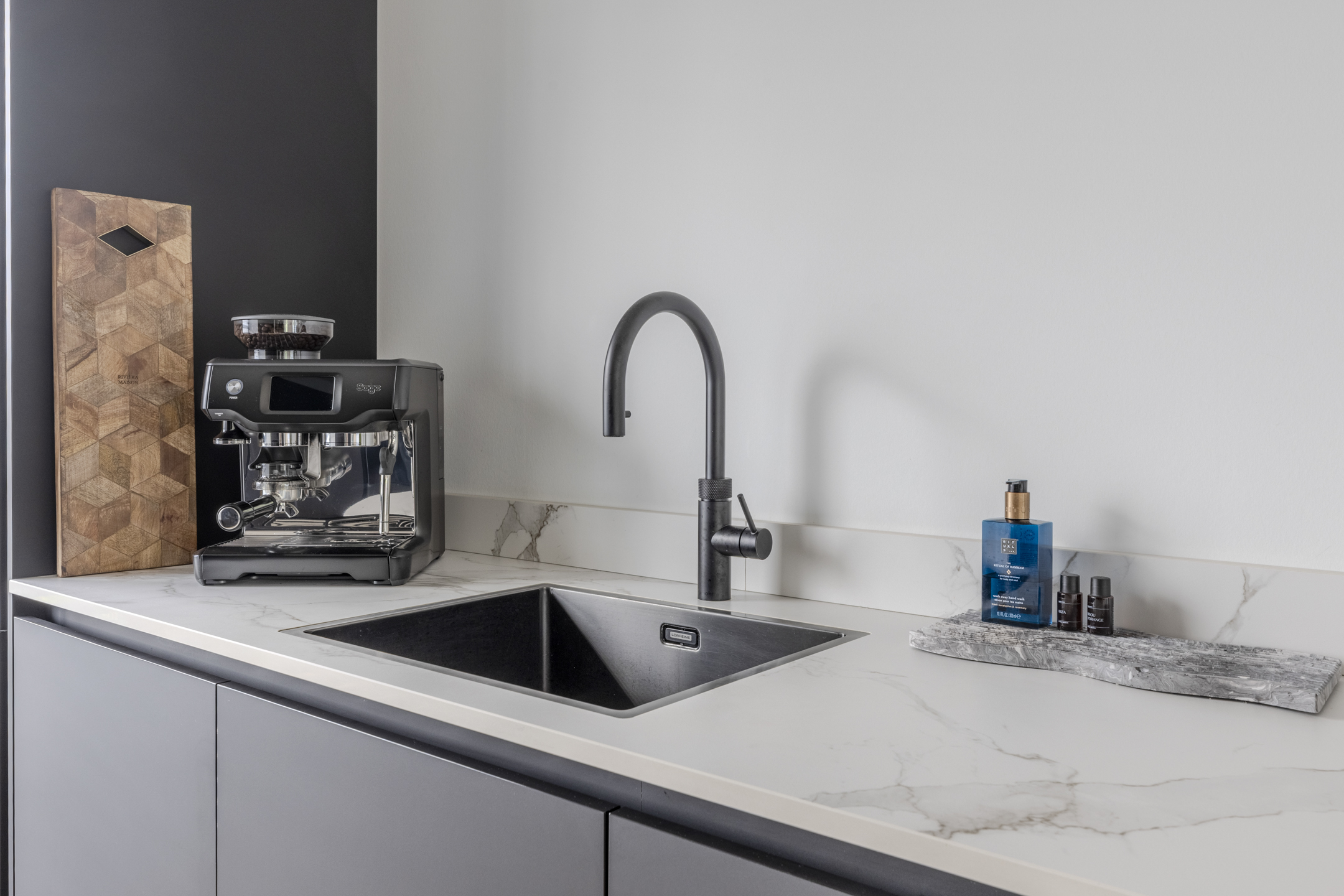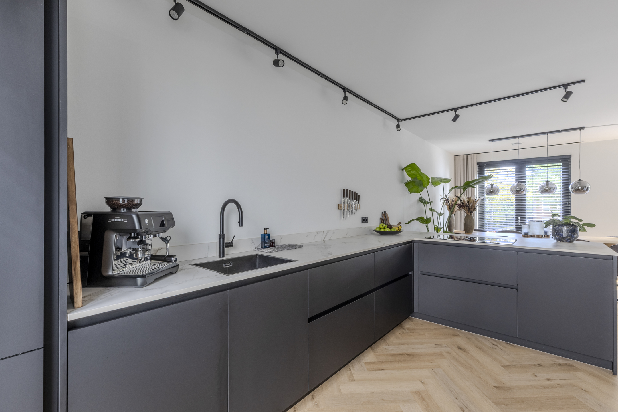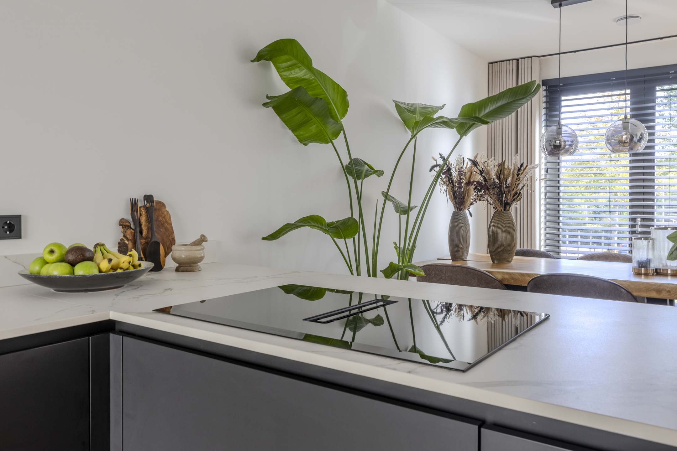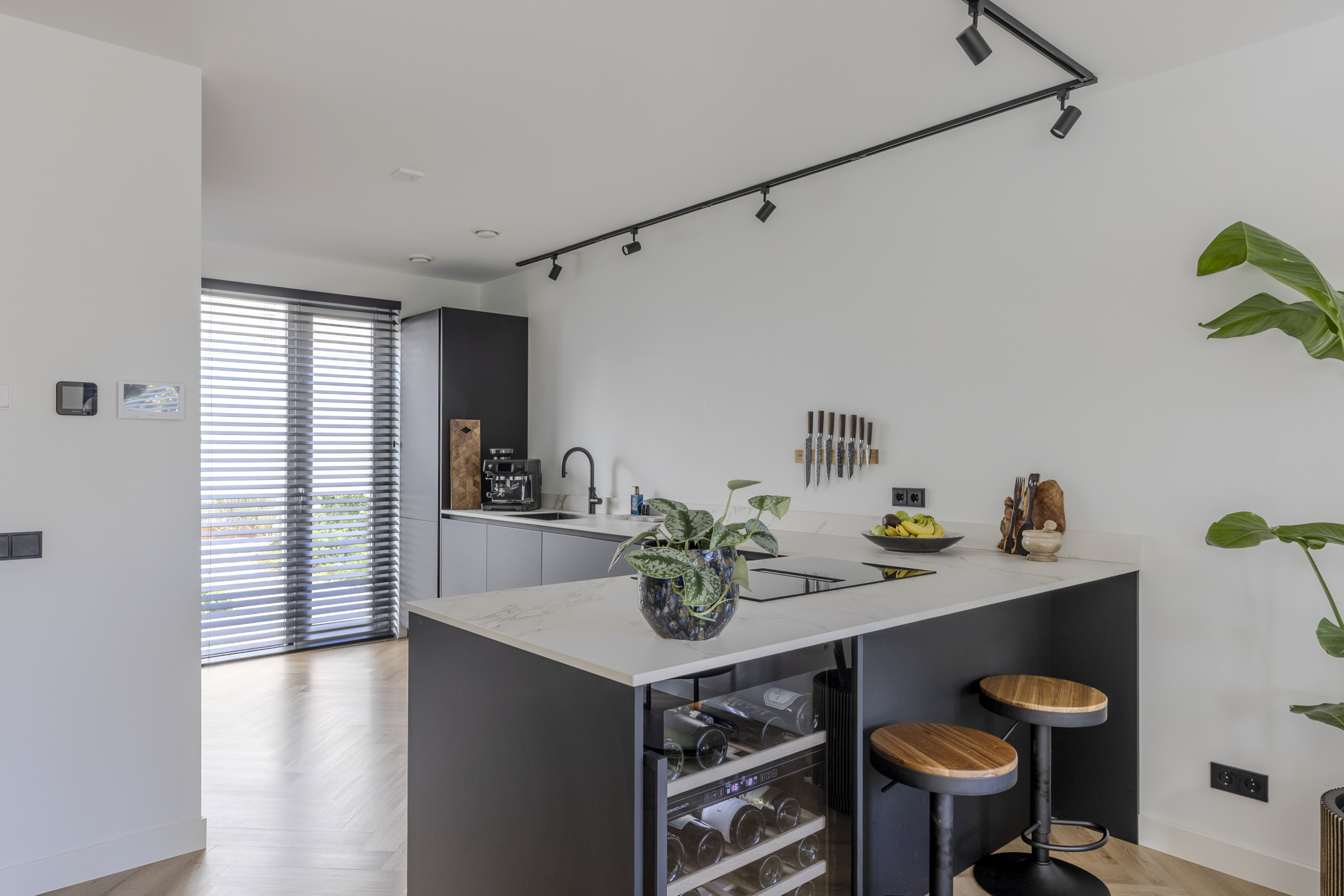 De open keuken met Dekton werkblad is voorzien van luxe inbouwapparatuur van Siemens: een inductiekookplaat, oven, stoomoven, magnetron, koelkast, vriezer, wijnklimaatkast (Küppersbusch) en een vaatwasser.