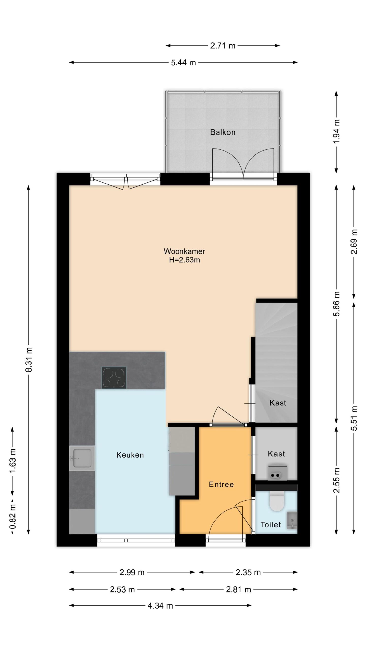 Achter de voordeur vinden we de entreehal met de meterkast, het gastentoilet met fonteintje en de toegang tot de woonkamer met open keuken.