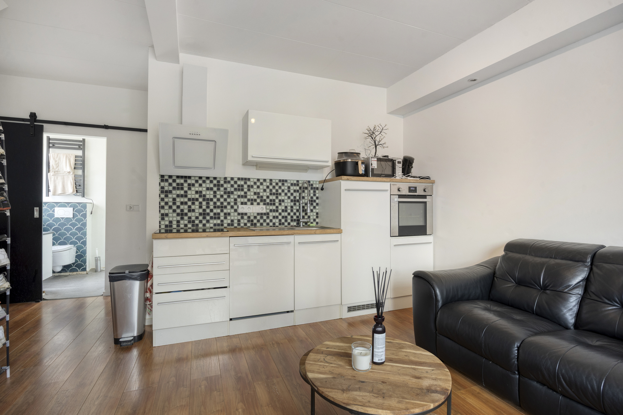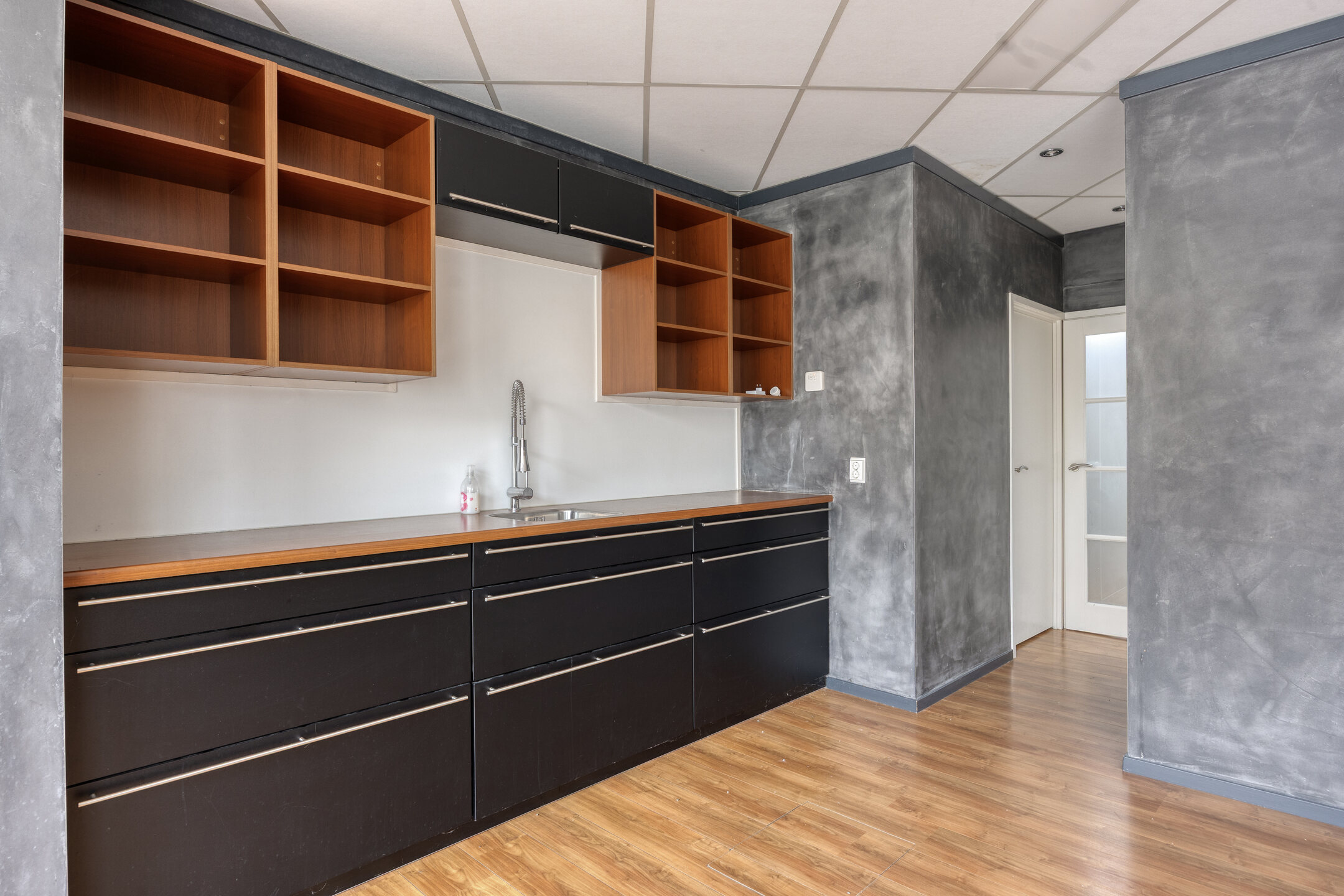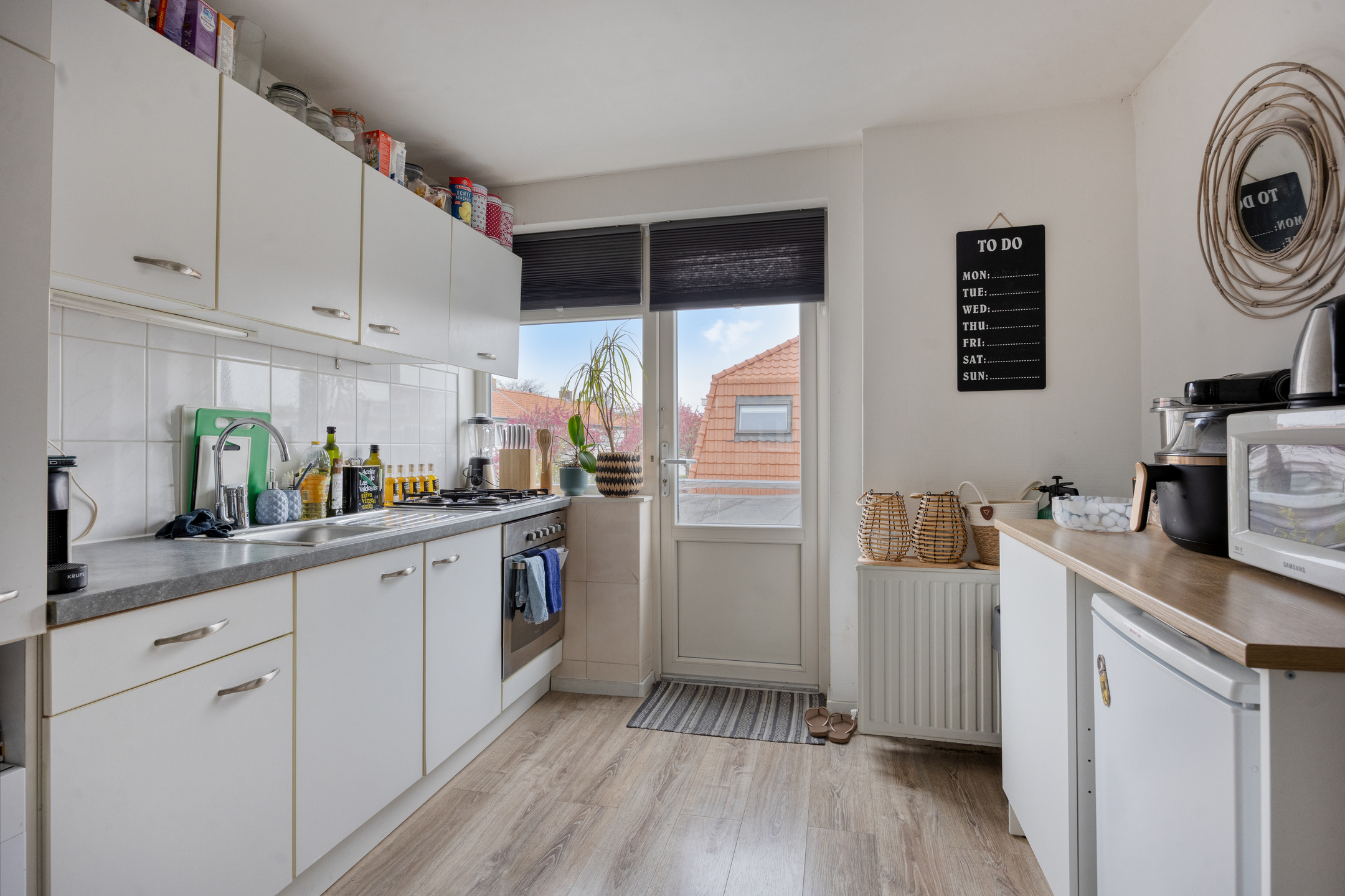 De open keuken sluit direct aan op de woonkamer en is voorzien van een lang werkblad en diverse inbouwapparatuur zoals een gasfornuis, oven en koelkast. Vanuit de keuken heeft u direct toegang tot het dakterras.