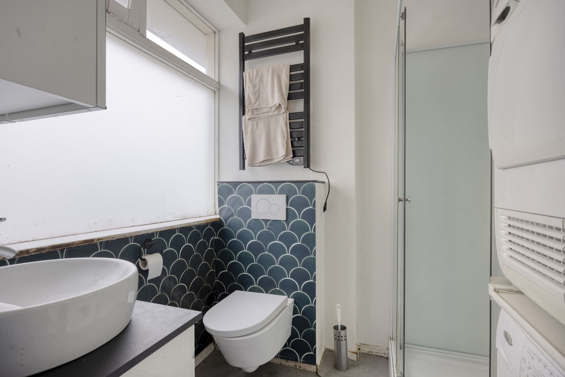 De badkamer is compact maar compleet en beschikt over een douchecabine, wastafel met spiegel, zwevend toilet en een handdoekradiator. Tevens is hier een aansluiting voor witgoed aanwezig.