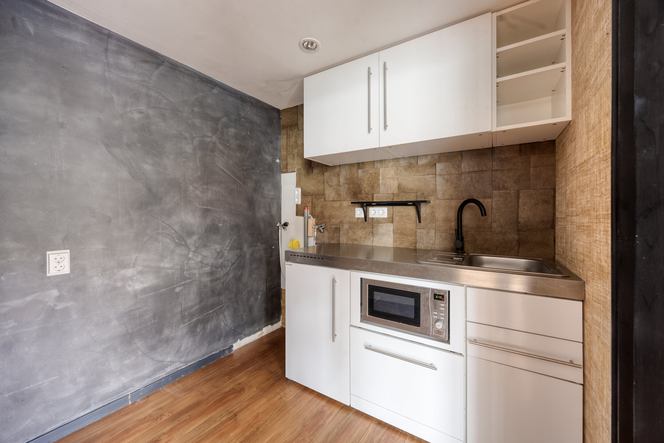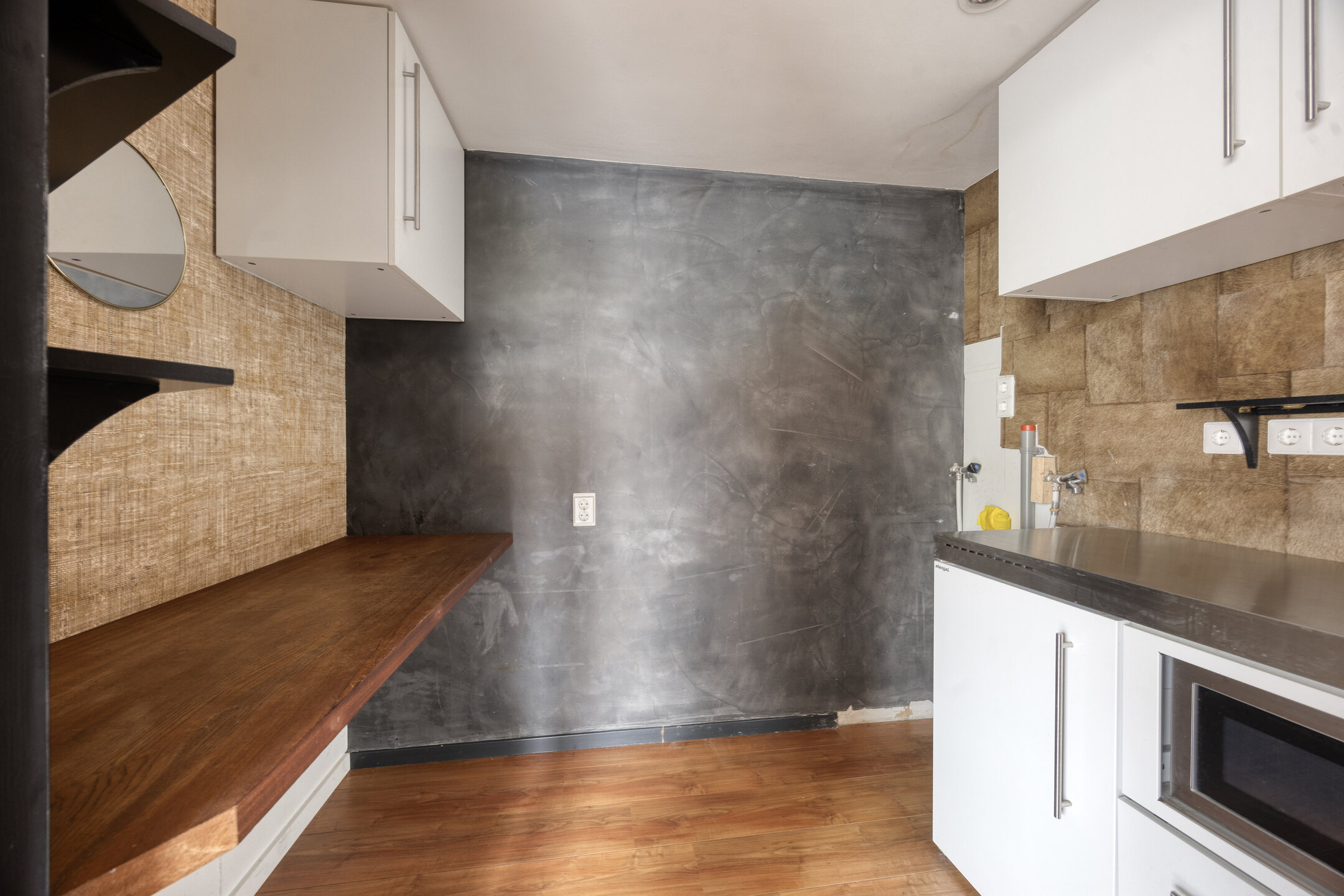 De keuken is praktisch ingericht met een langwerpig aanrecht, spoelbak en voldoende kastruimte. Tevens bevindt er zich een bijkeuken in het pand, eveneens voorzien van een aanrecht, spoelbak en extra opbergruimte. Hier vindt u ook een ingebouwde magnetron en een (kleine) vaatwasser, wat het geheel extra functioneel maakt.
