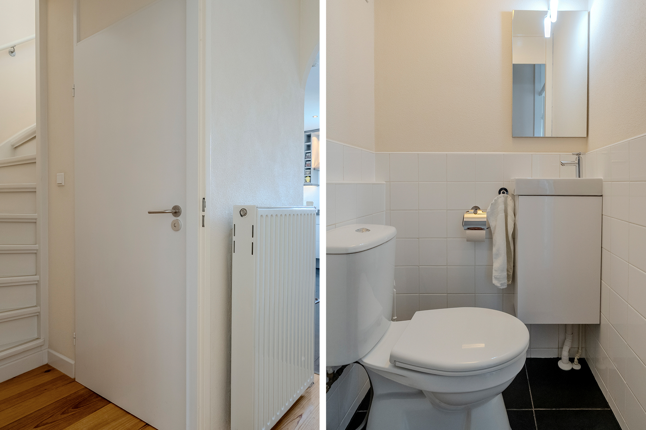 Tussenhal met toilet en fonteintje en trap naar 1e verdieping.