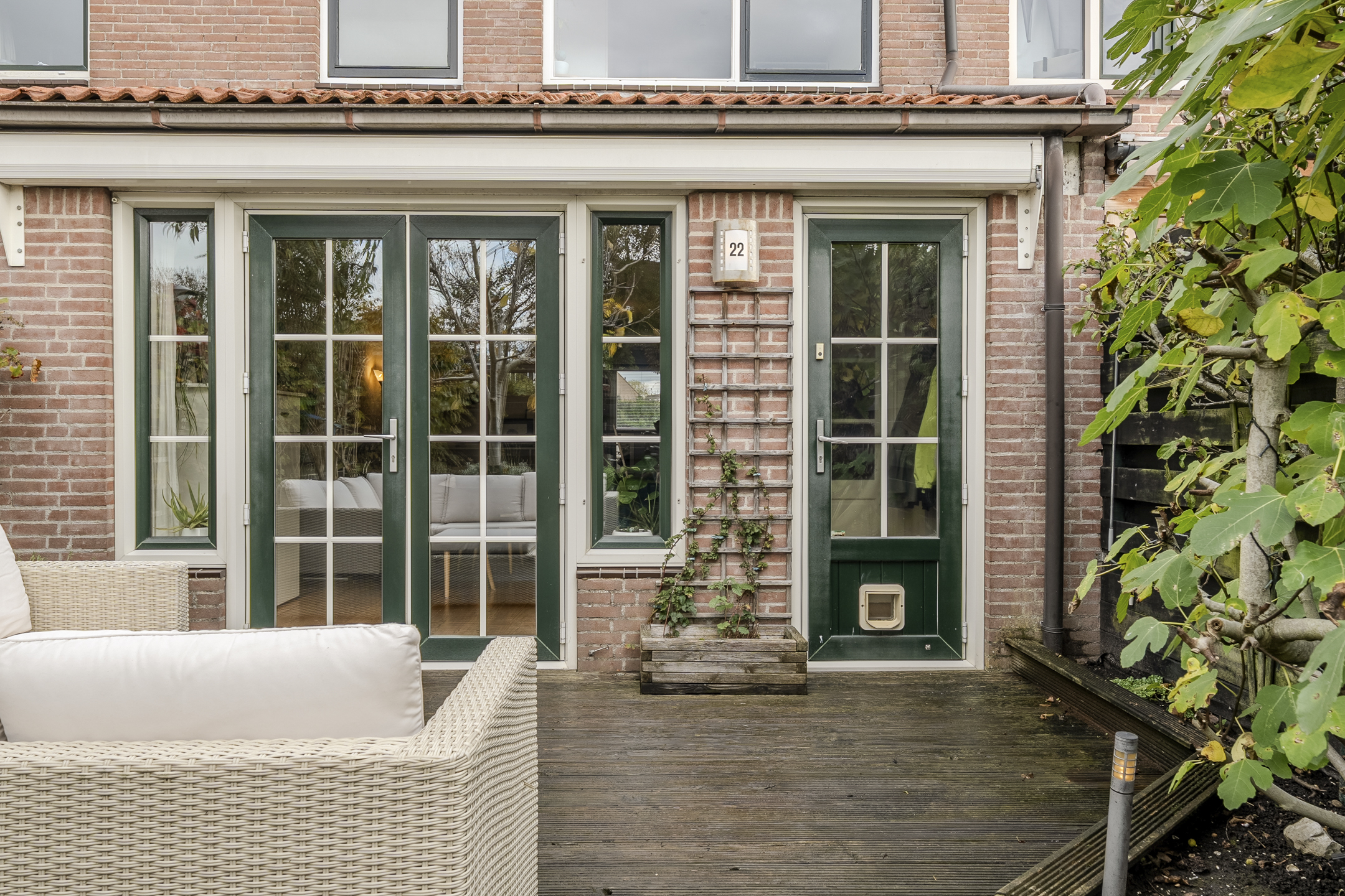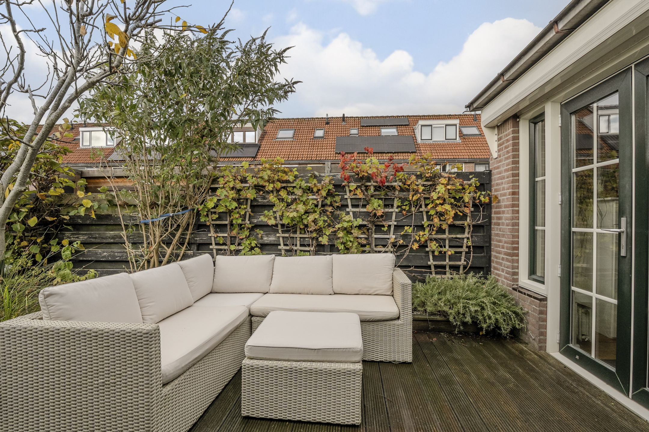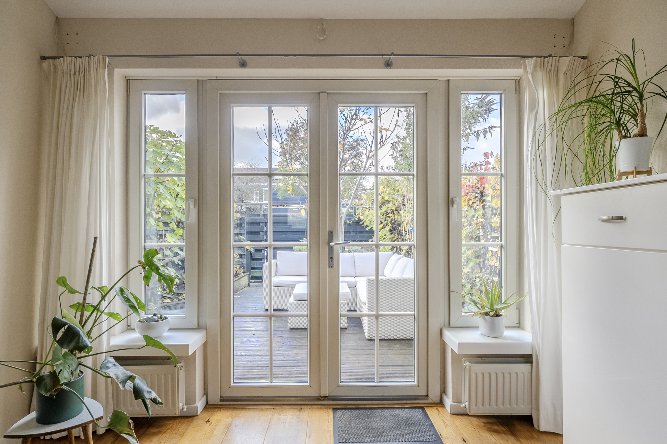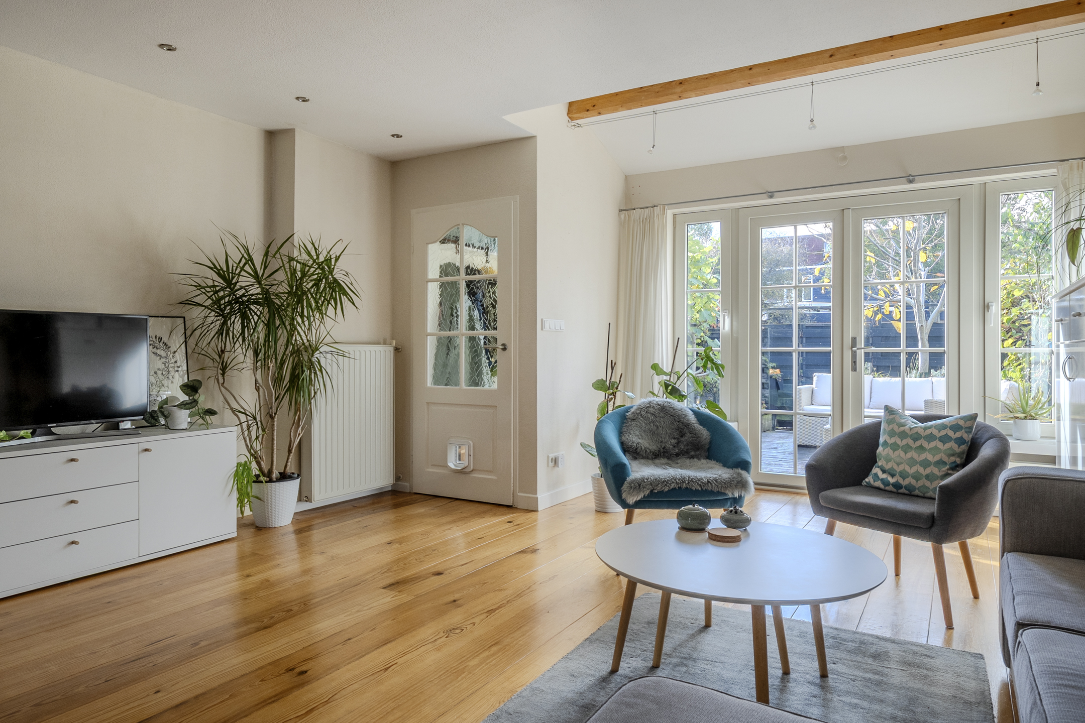 De royale openslaande tuindeuren of de loopdeur geeft een prachtige overgang naar de zonnige en fraai aangelegde achtertuin welke op het zuidwesten gelegen is. Gezien de gunstige ligging en het ontbreken van achterburen heeft u veel privacy in de tuin.
