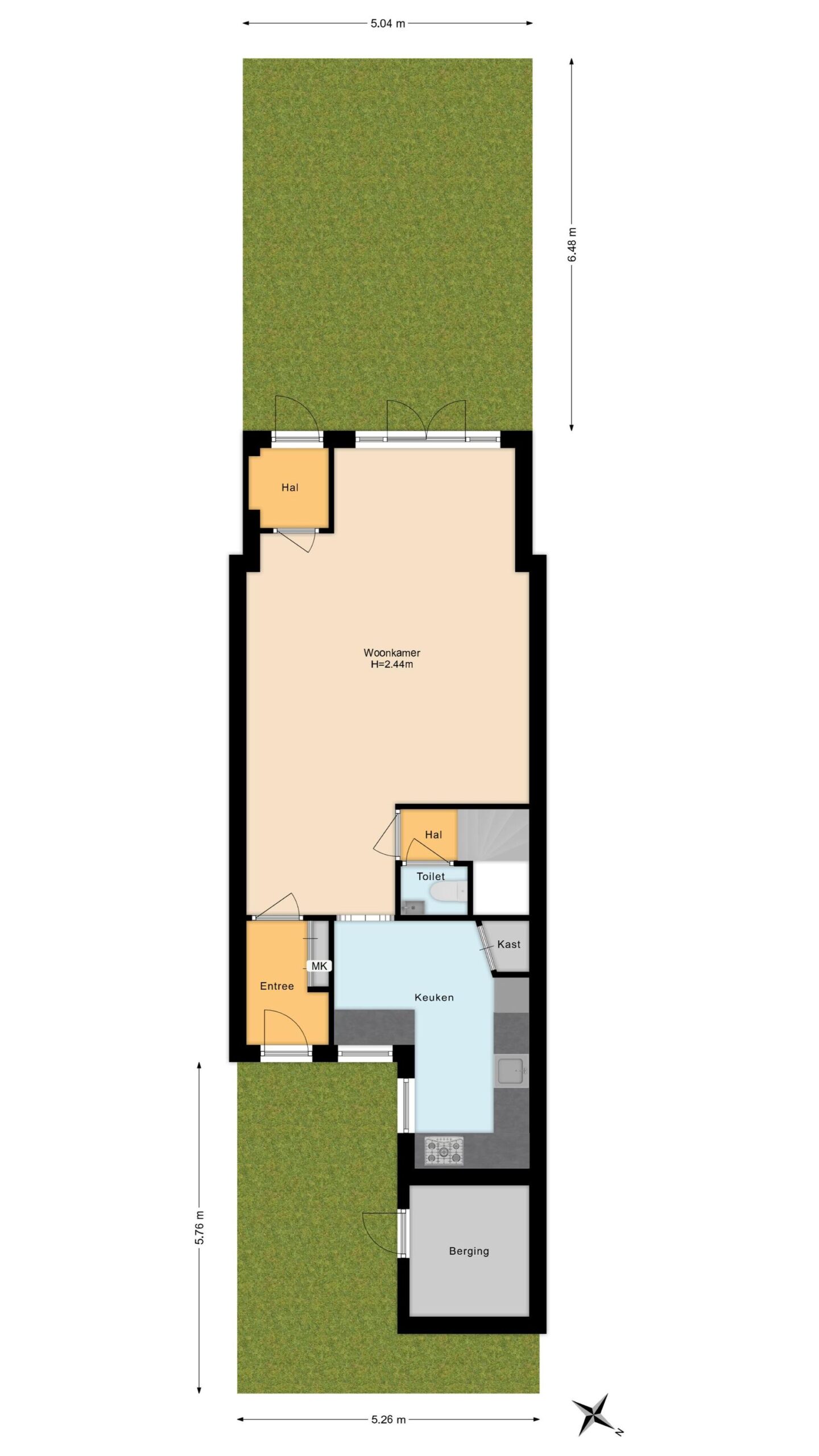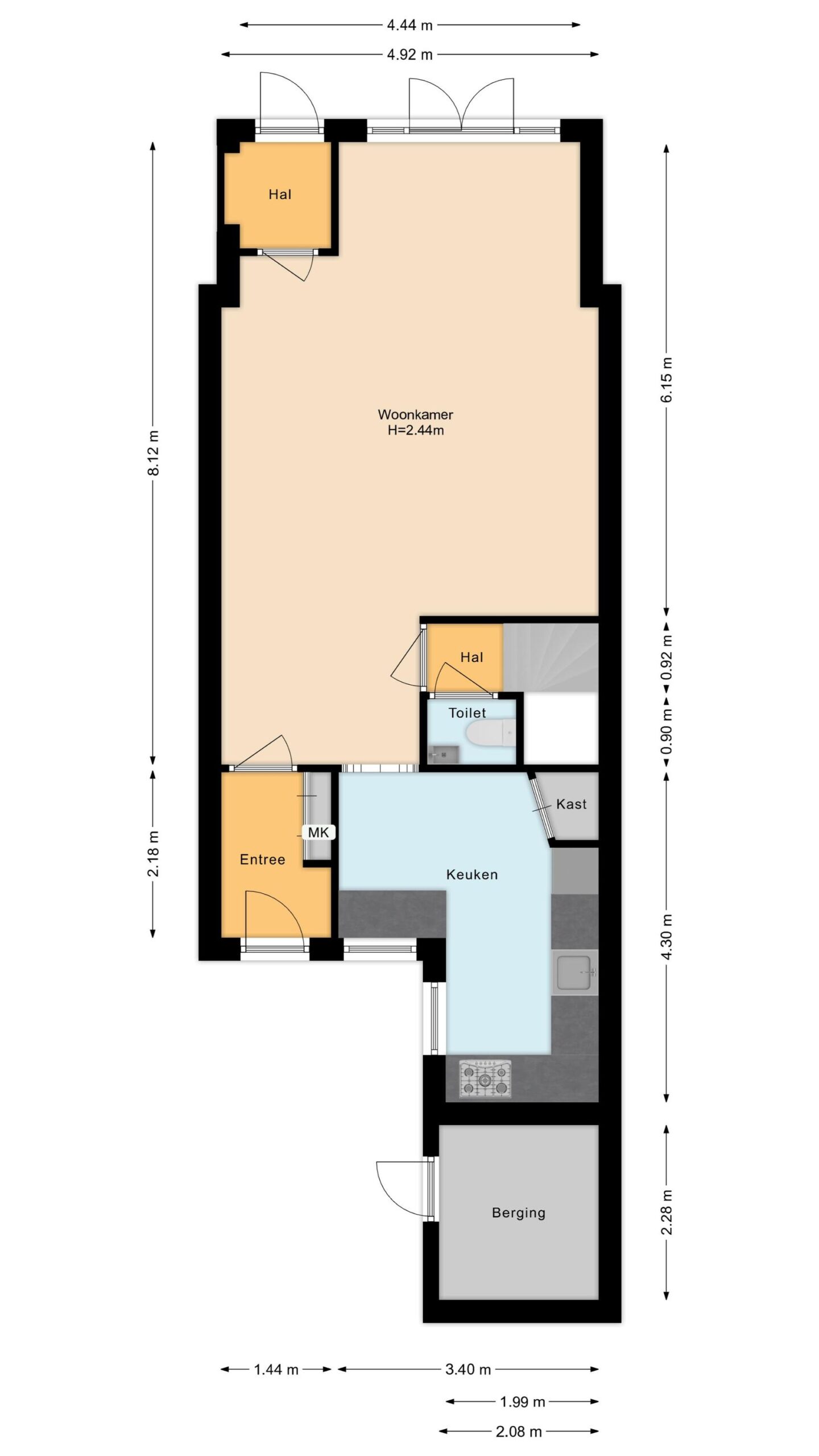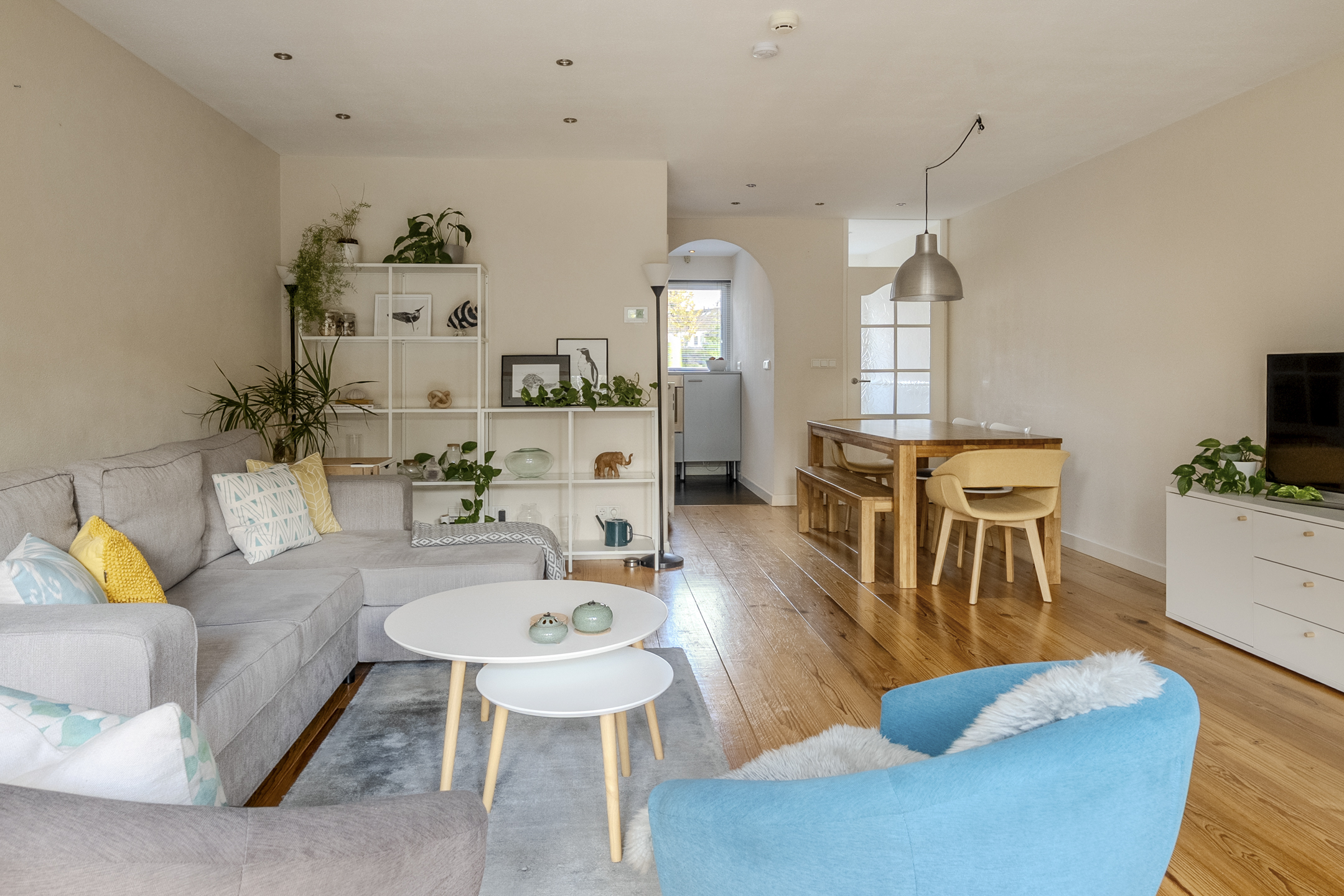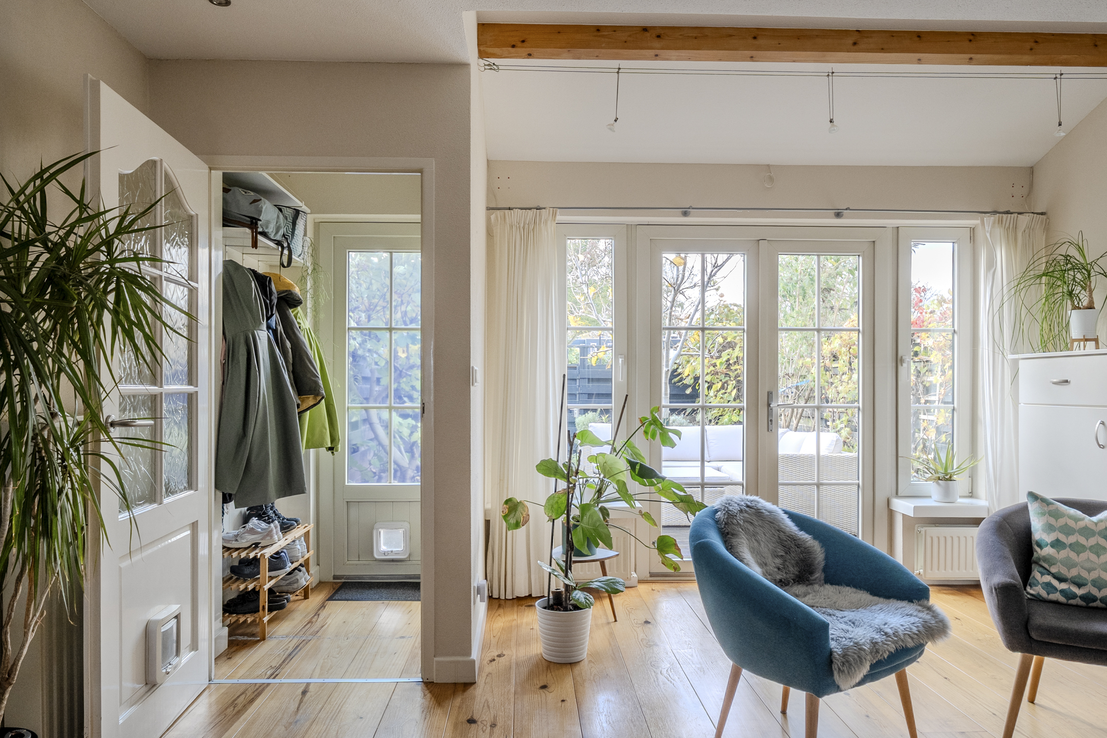 Entree, berging, hal, meterkast, ruime uitgebouwde woonkamer (40m2!) met massief houten vloer en openslaande deuren, gespoten wanden en plafond met inbouwspots en rookmelder en een praktische hal aan de achterzijde.