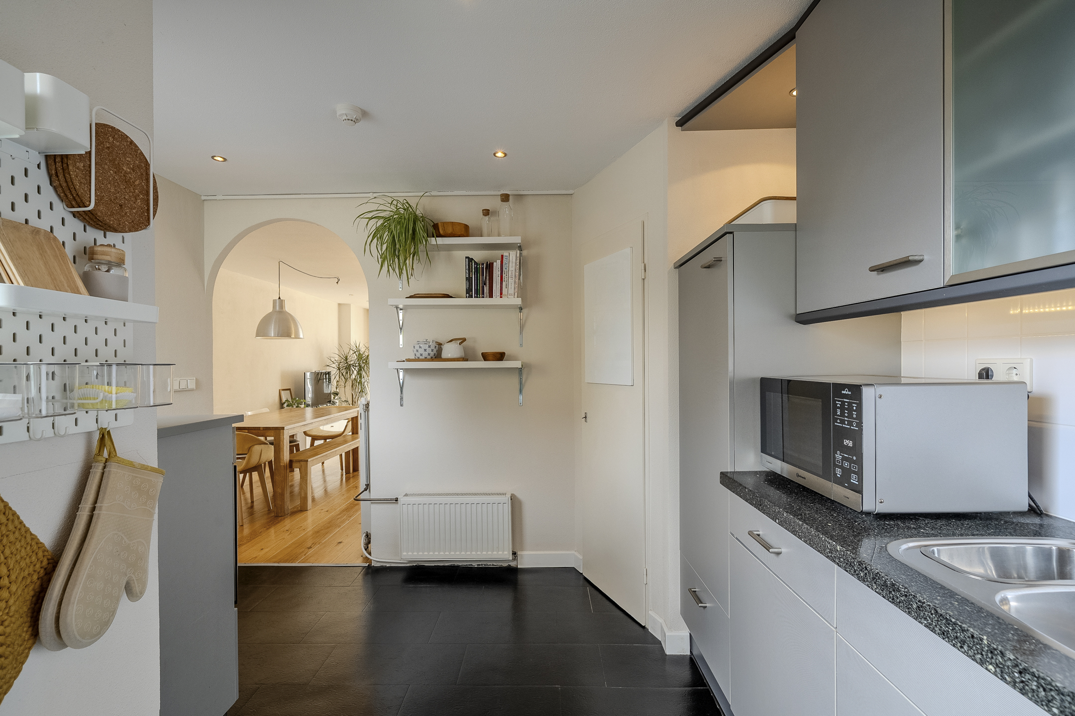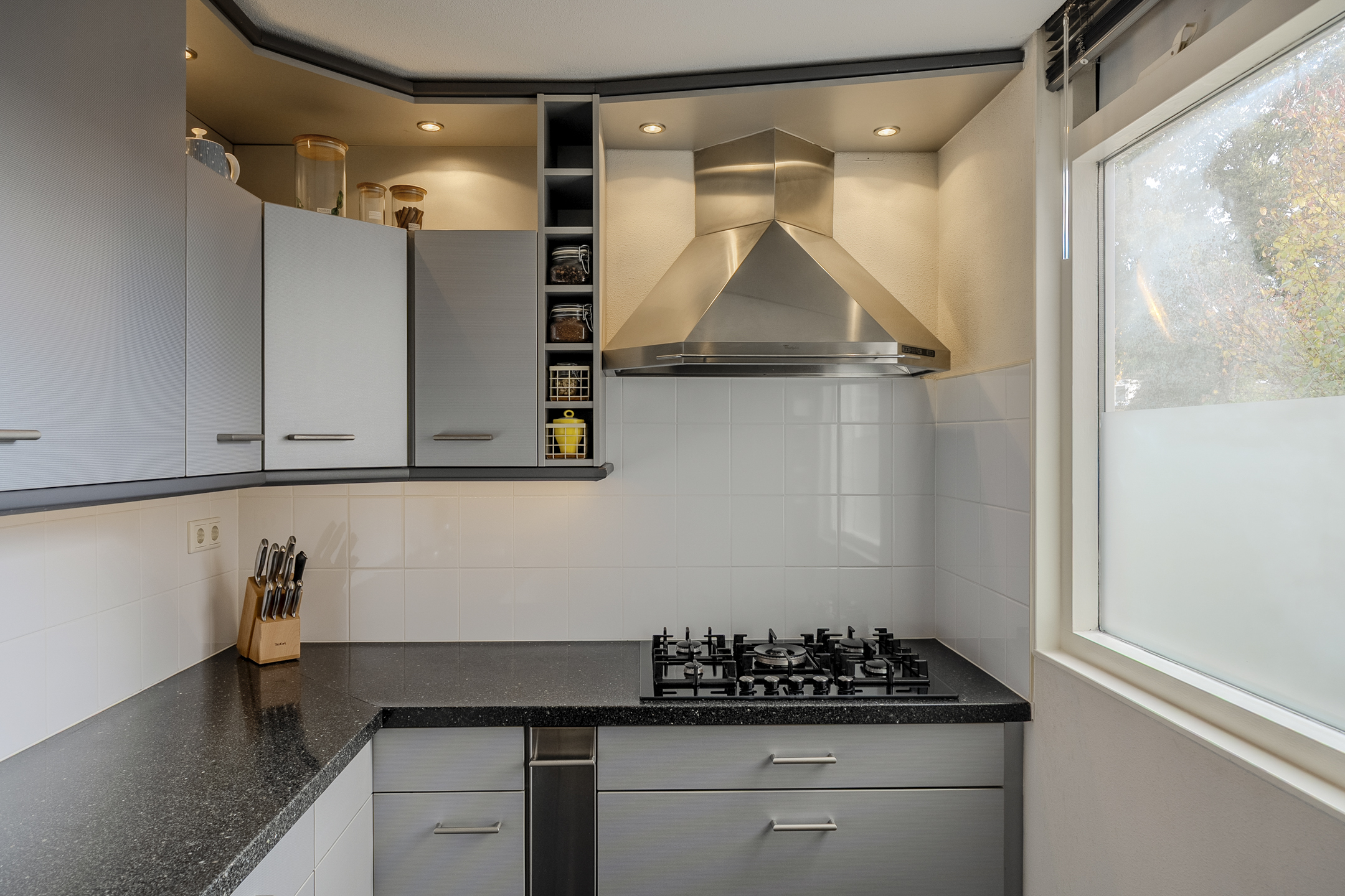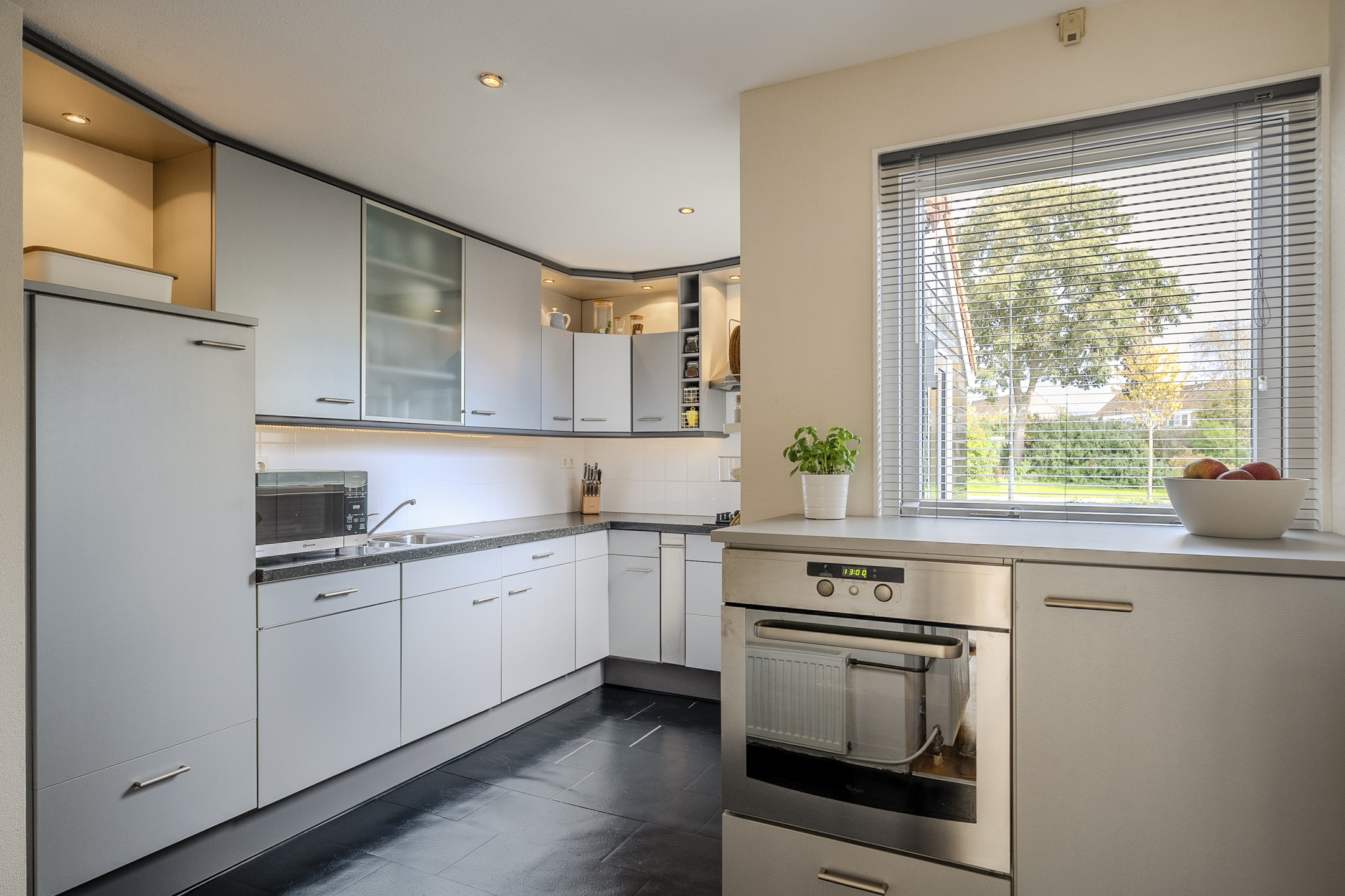 Aan de voorzijde van de woning is de uitgebouwde half open keuken (2003) in L-opstelling geplaatst en voorzien van diverse inbouwapparatuur, waaronder een vaatwasser, koelkast, 5 pits gaskookplaat inclusief wokbrander, close-in boiler, carrousel kast, prachtig stenen aanrechtblad en nog een royale bergkast.