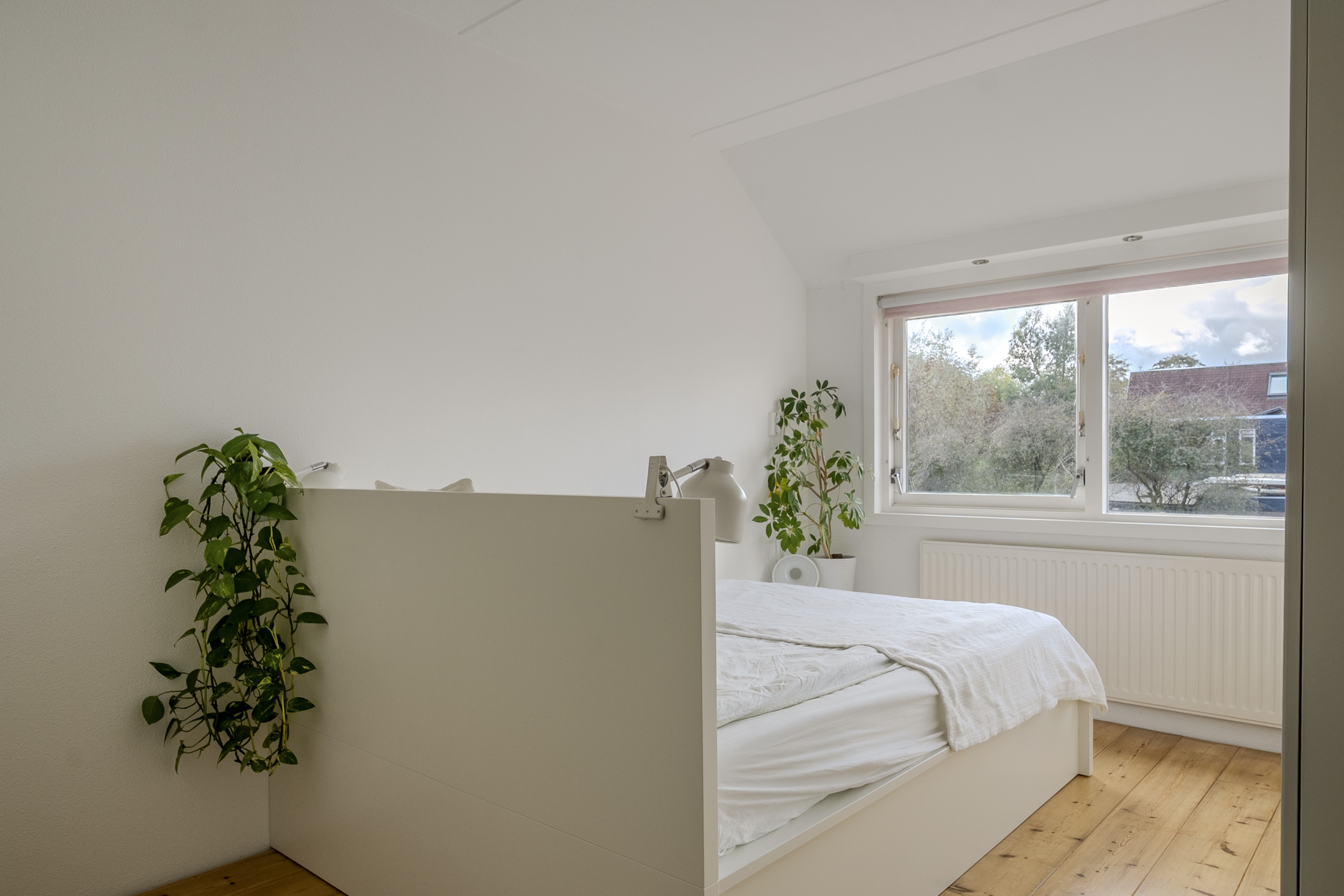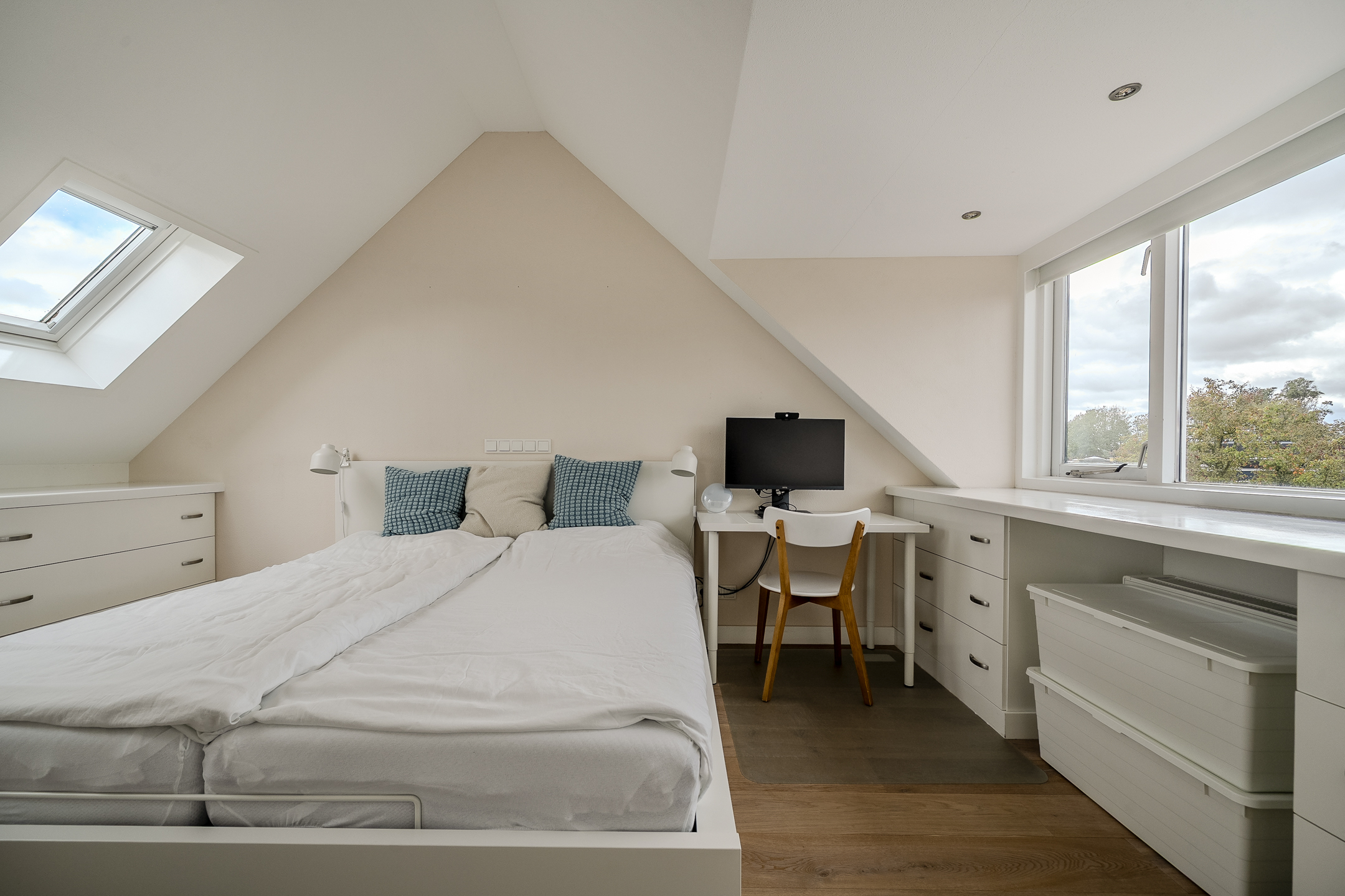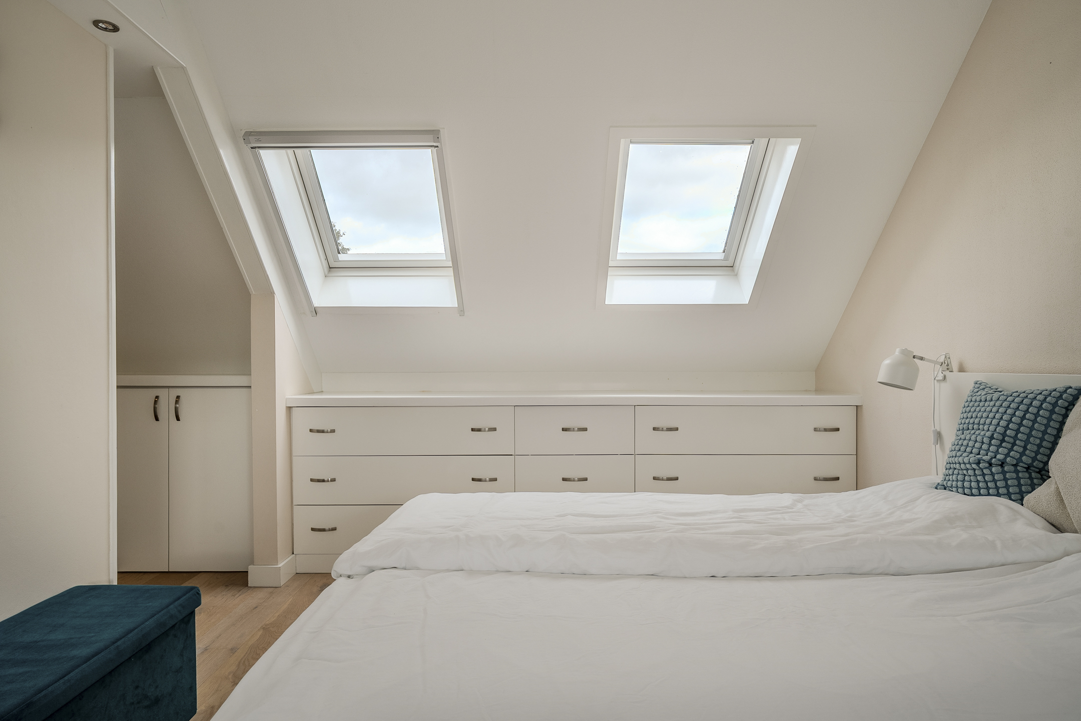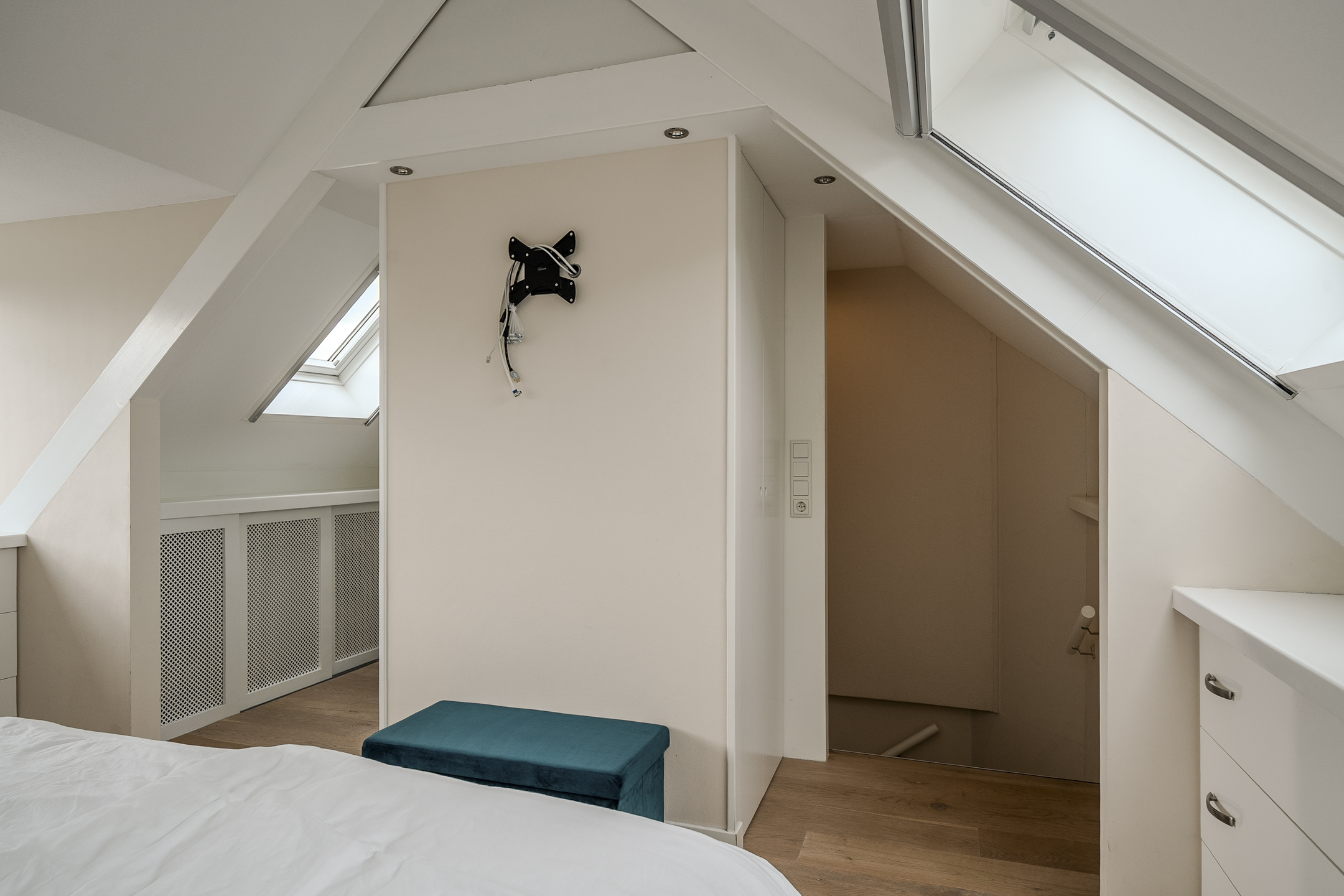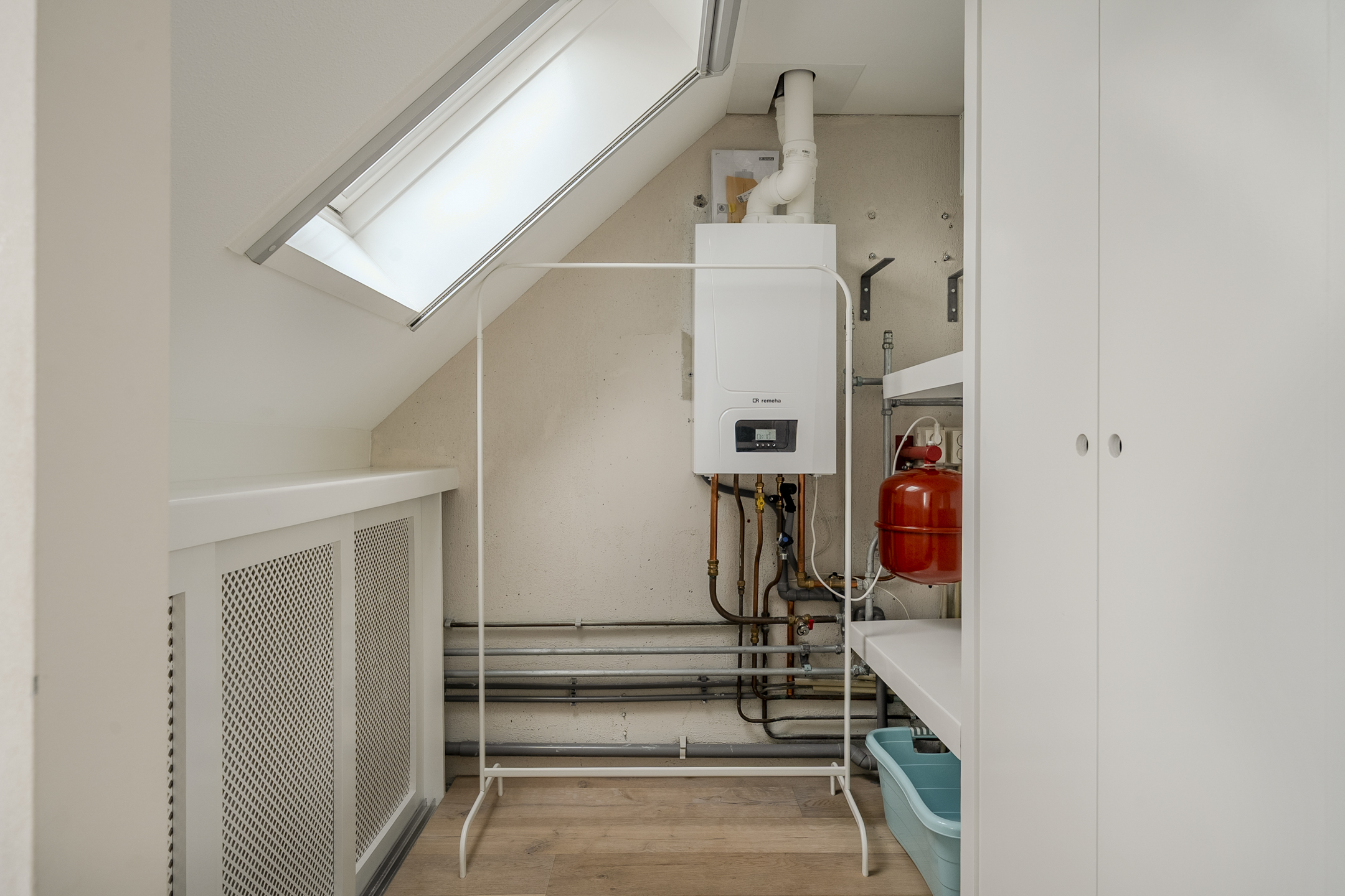 Via een vaste trap is de gerenoveerde zolderverdieping bereikbaar. Hier is de 4e slaapkamer gerealiseerd! En wat voor een! Met een riante dakkapel en drie dakramen is het een prachtige kamer geworden, met vaste kasten en een zee aan bergruimte! Verder treft u hier nog een opstel plek voor de wasmachine en droger en de opstelling voor de CV-ketel (Remeha 2024) Ʃn nog meer bergruimte op de vliering!