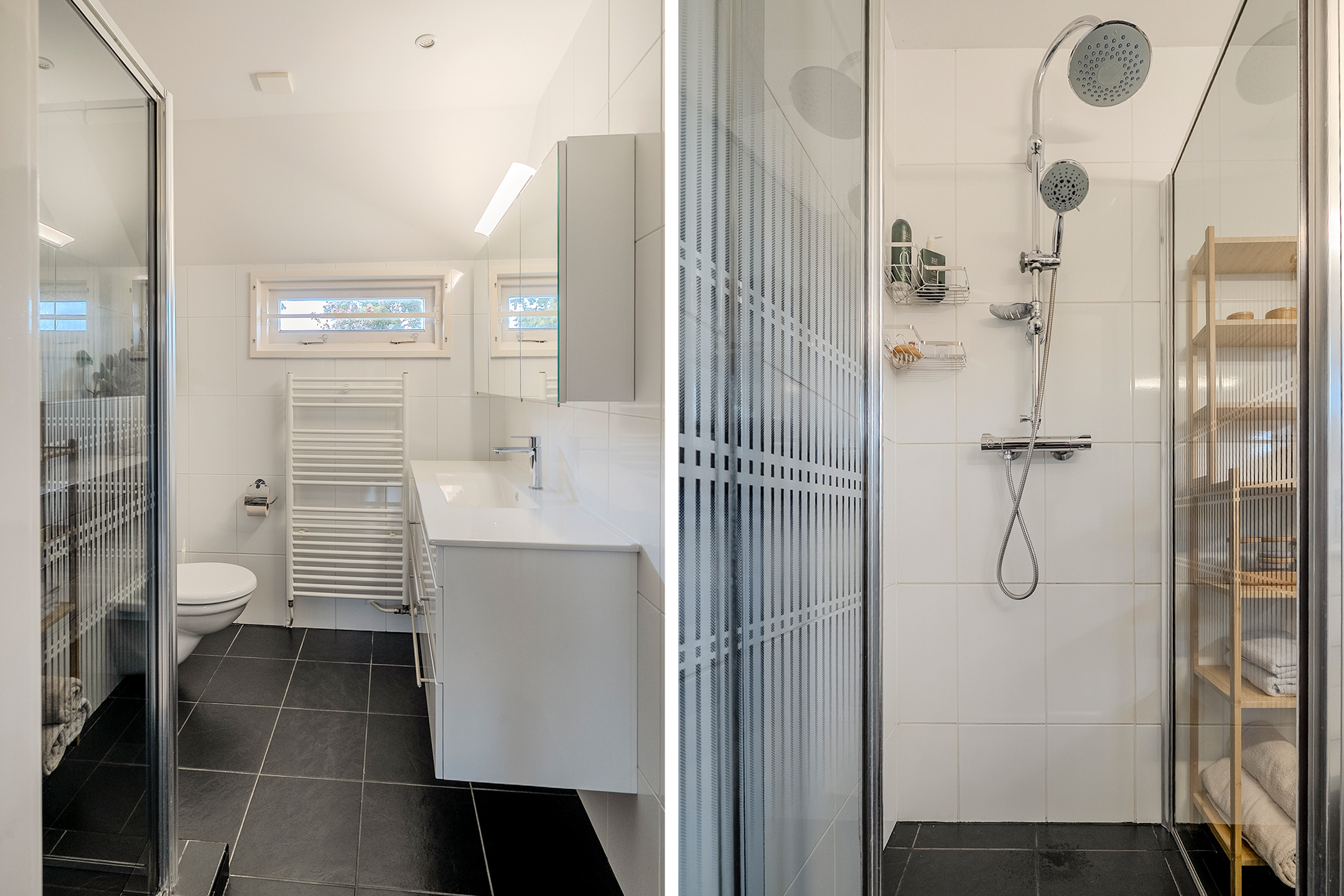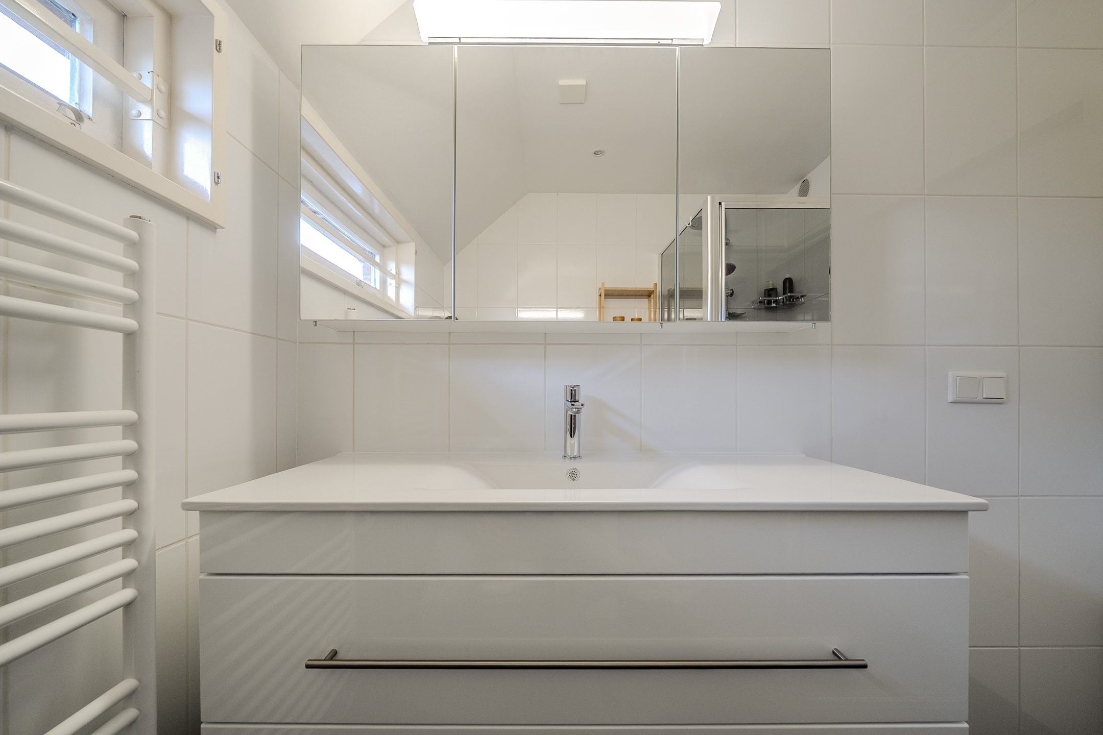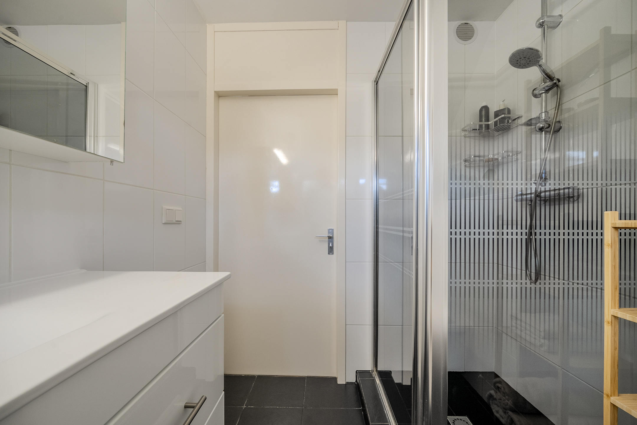 Geheel betegelde badkamer (2009) met wastafel met meubel (2024), spiegelkast, douchecabine en tweede toilet.