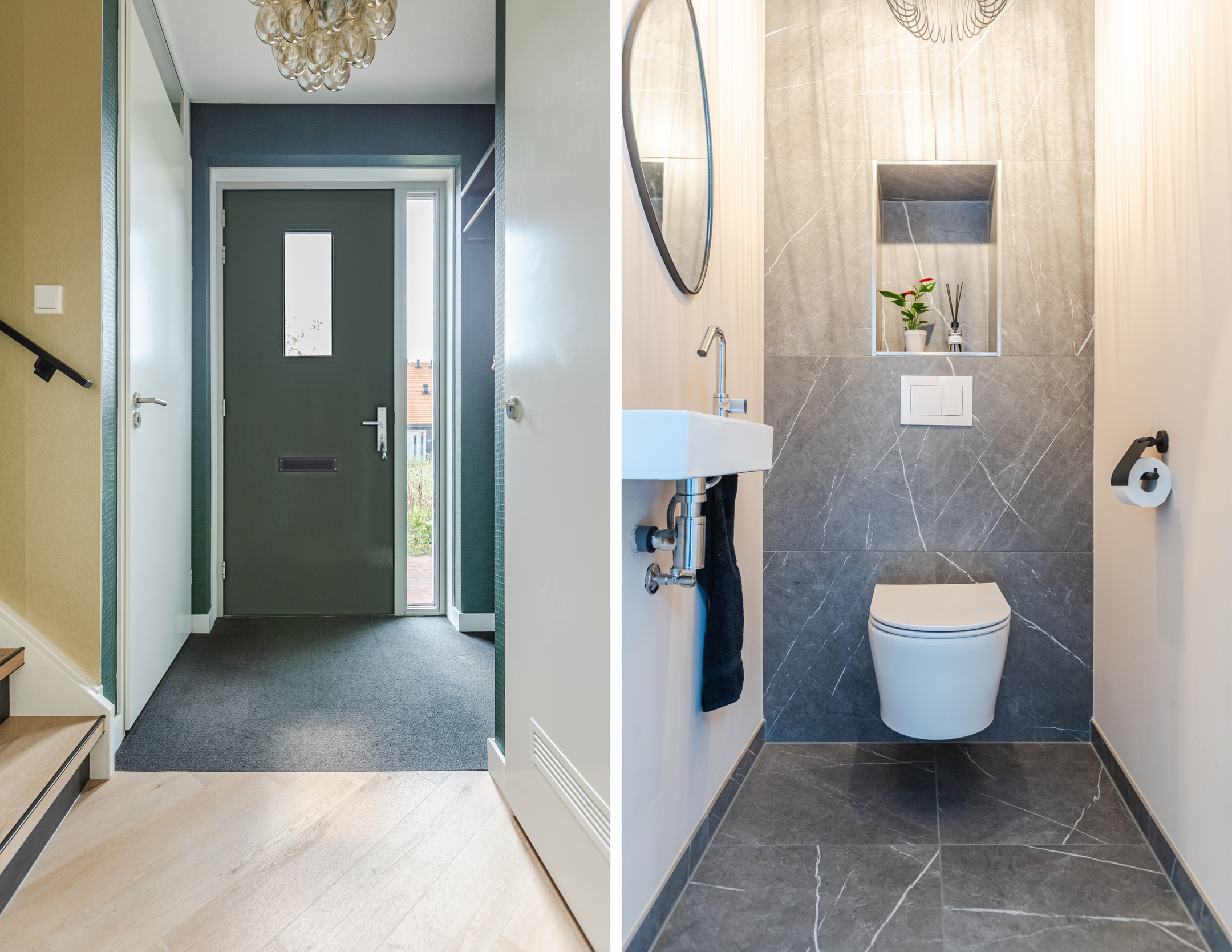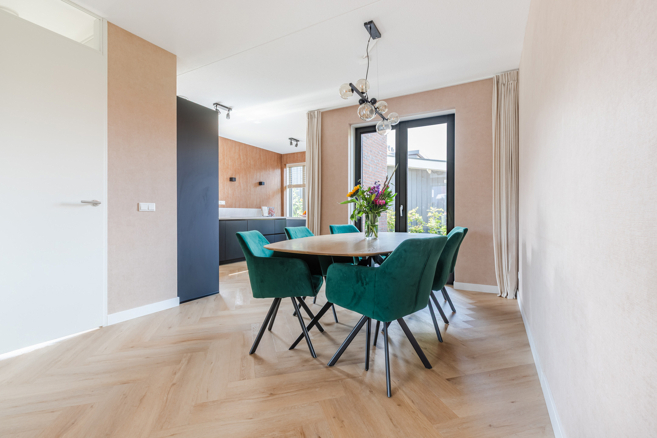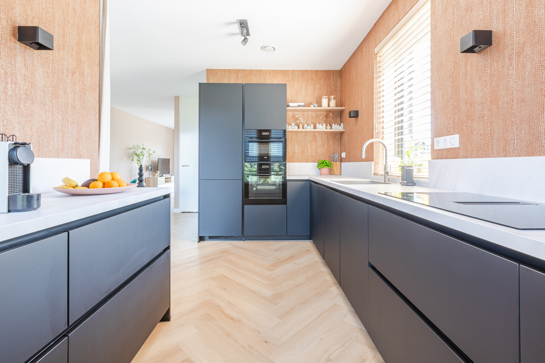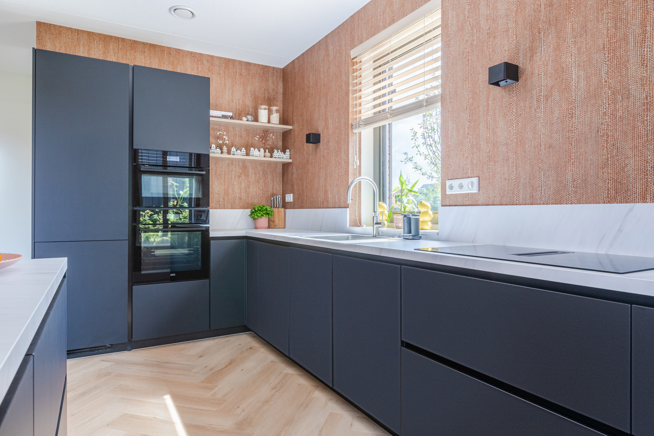 Entree met hal, meterkast en luxe toiletruimte met wandcloset, trap met trapkast, een luxe en riante keuken met AEG inbouwapparatuur (inductie kookplaat met geĆÆntegreerde afzuigkap, vaatwasser, combi-oven, stoomoven, koel-vriescombinatie en Quooker). Een fijne en tuingerichte woonkamer met schuifpui met een knappe wand/plafond en vloerafwerking (visgraat PVC vloer).