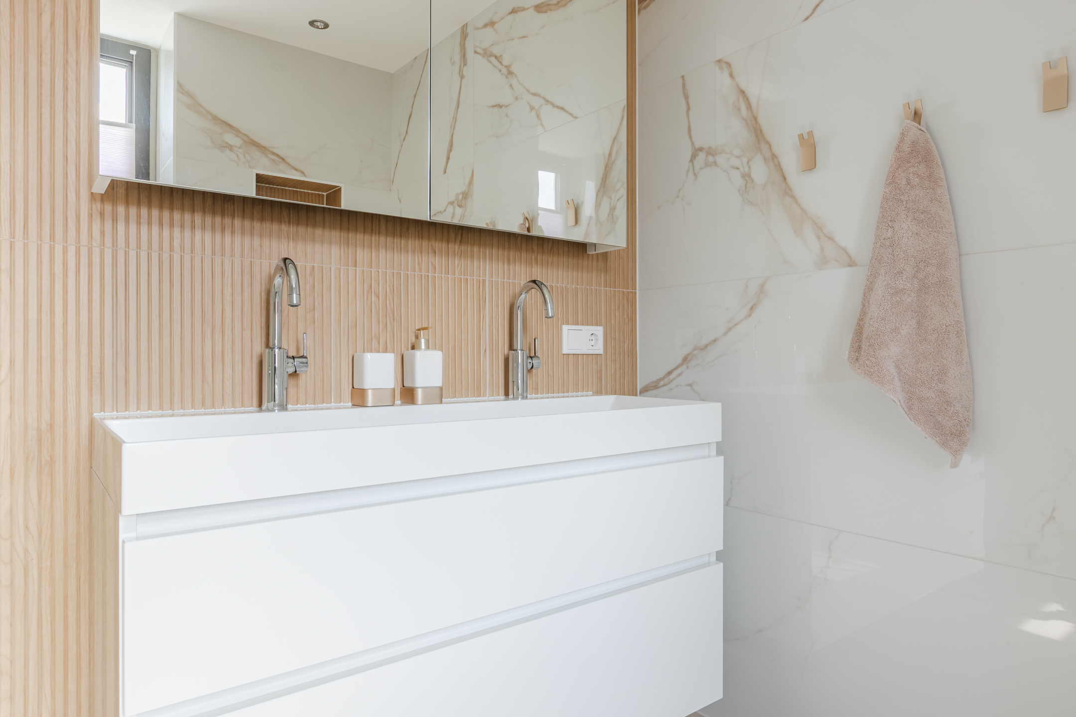 De overloop geeft toegang tot 3 goede slaapkamers, luxe betegelde badkamer met ruime inloopdouche met drain, dubbele wastafel met meubel, fraaie spiegel en 2e wandcloset.