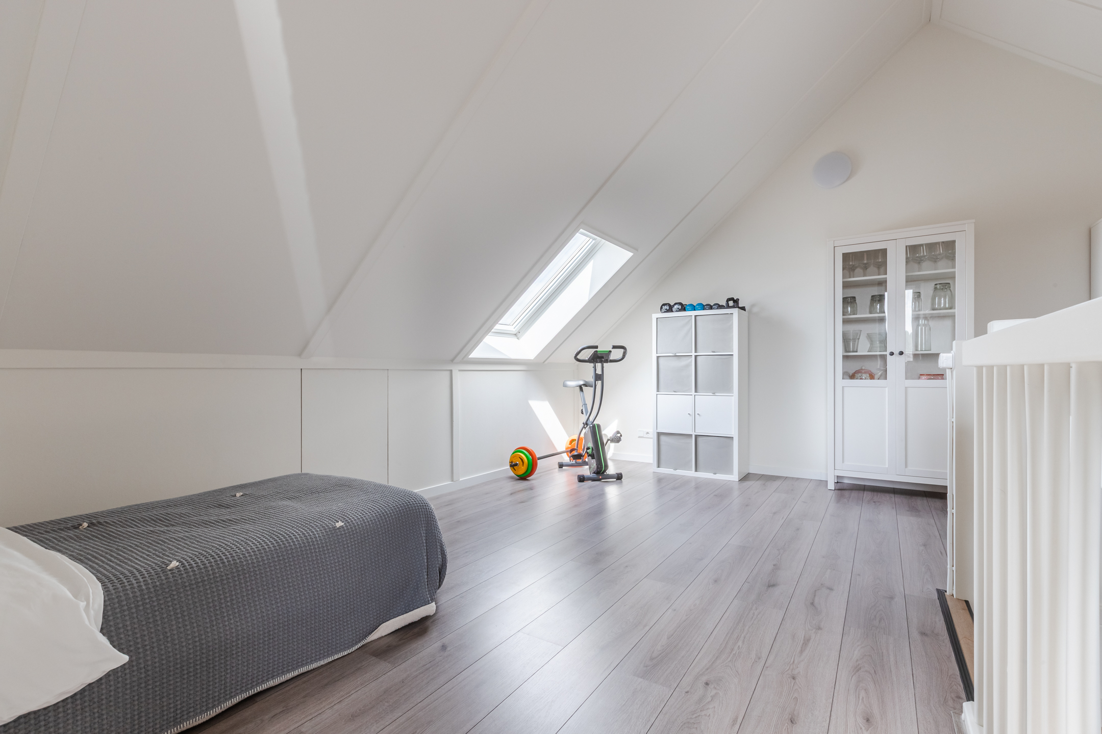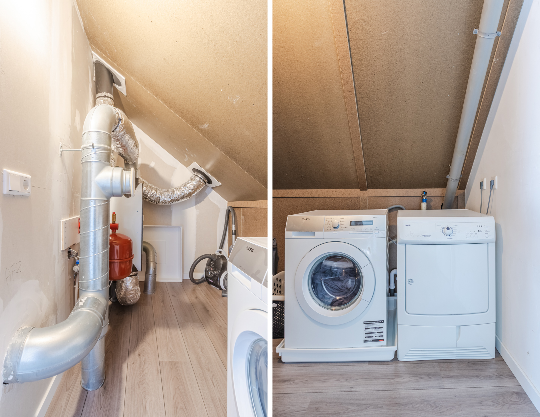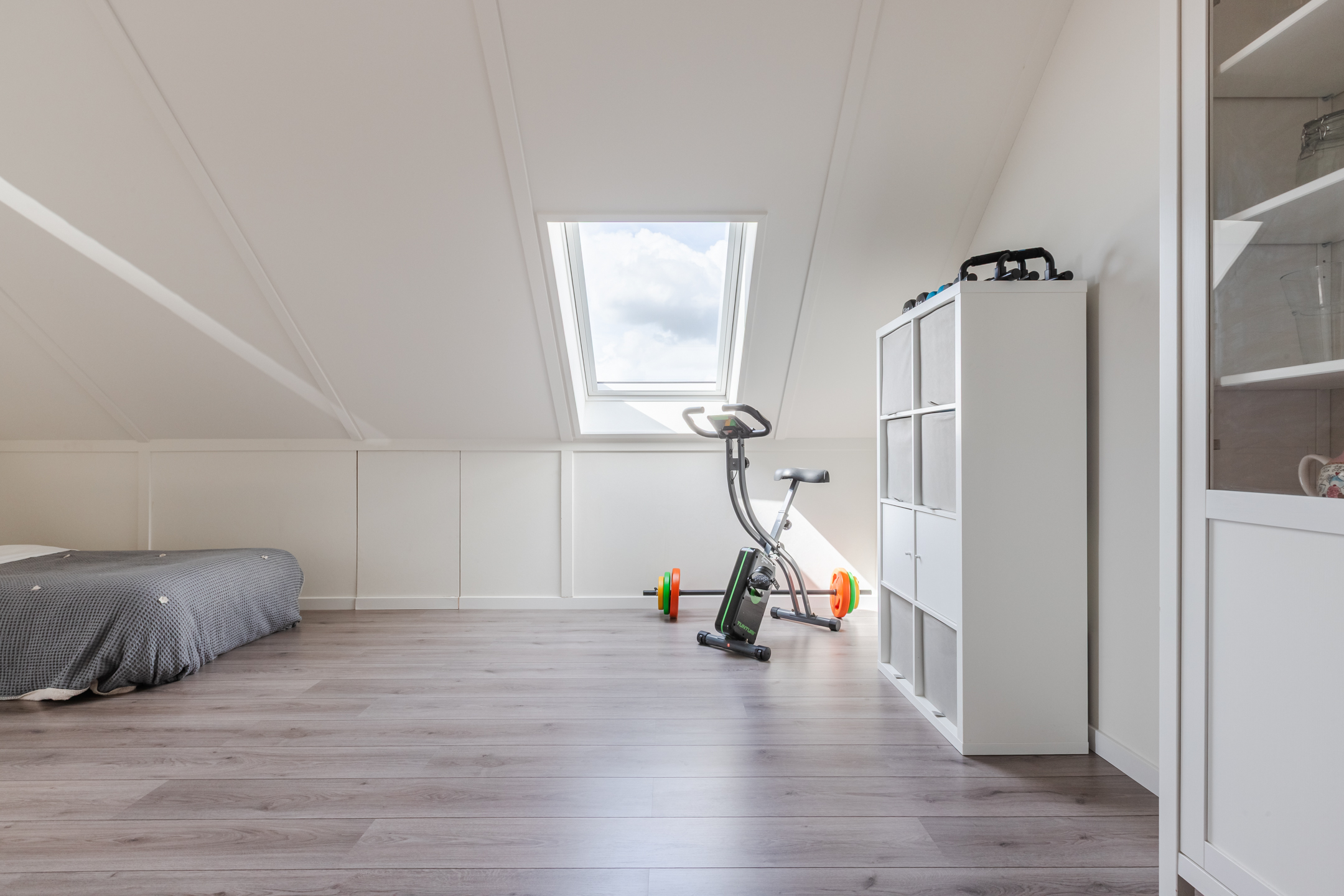 Zeer riante 4e (zolder) slaapkamer v.v. Velux dakraam en zijraam, bergruimte achter de knieschotten en een aparte en afsluitbare technische ruimte voor de wasmachine, droger en warmte terugwin installatie.