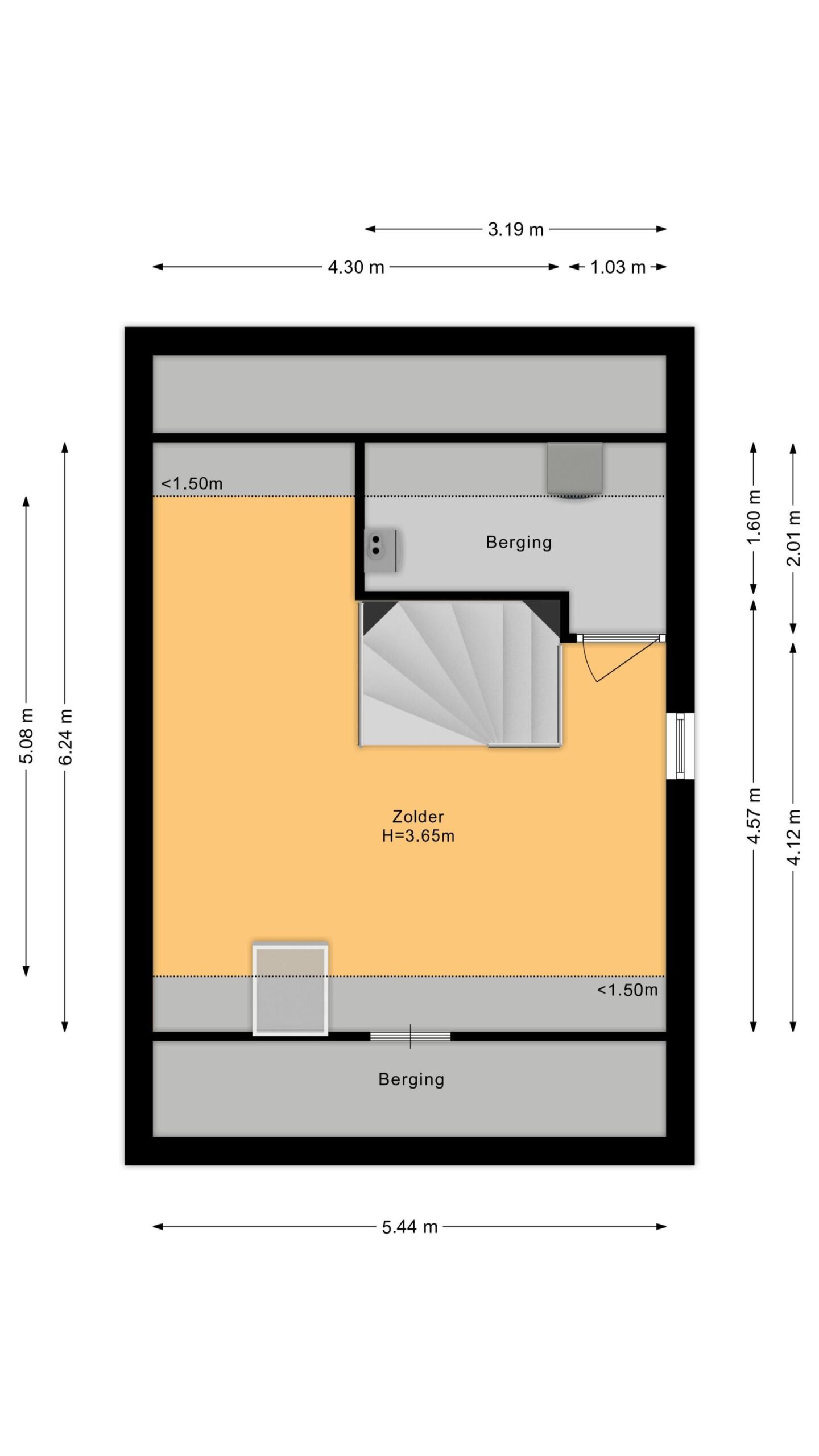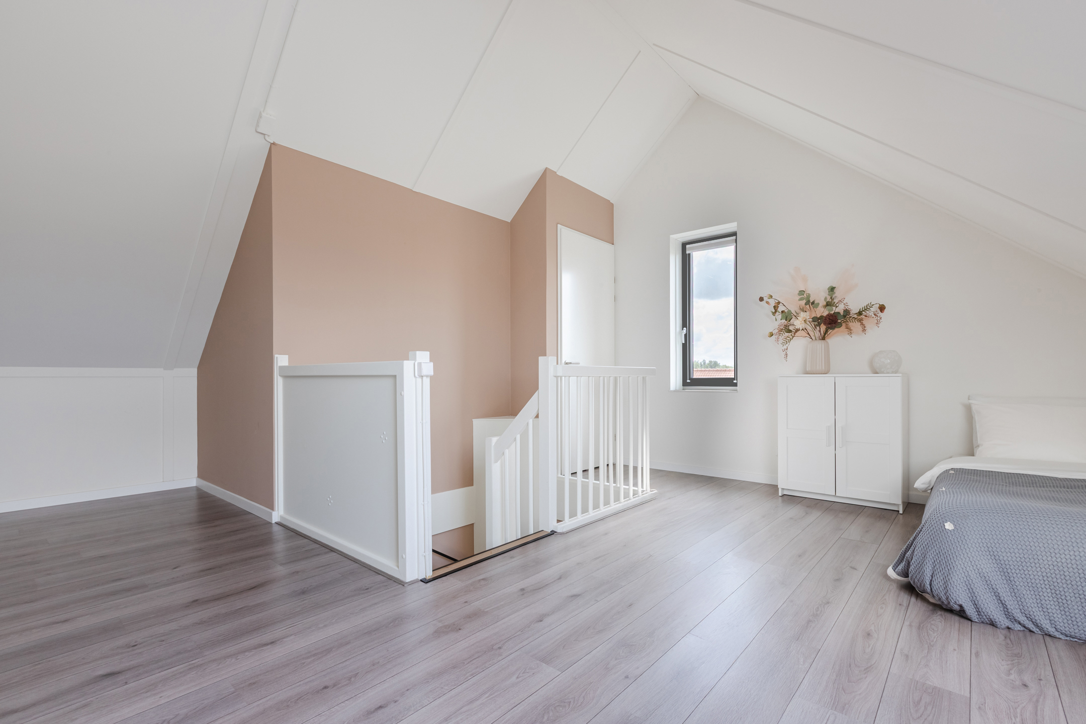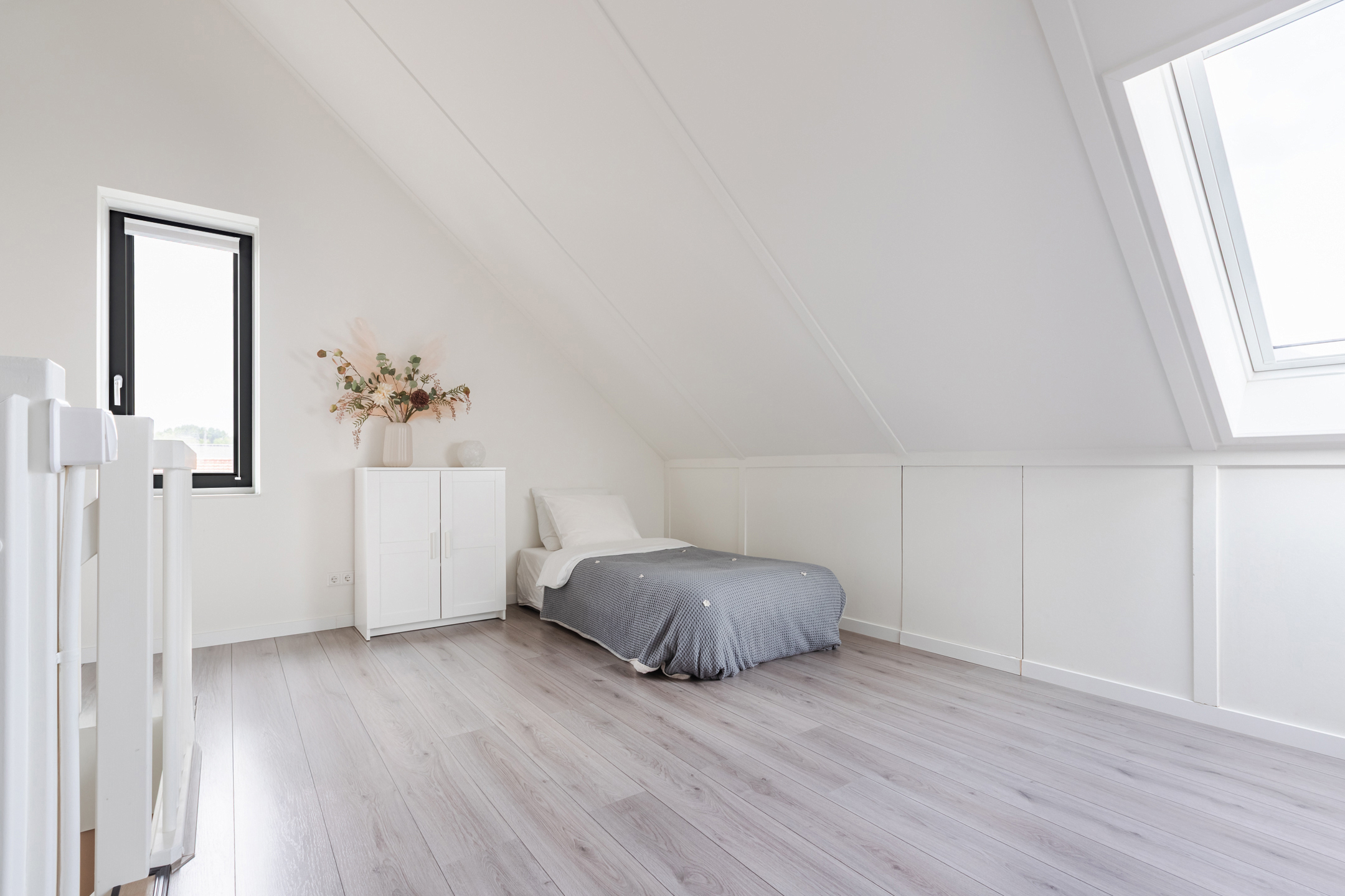Zeer riante 4e (zolder) slaapkamer v.v. Velux dakraam en zijraam, bergruimte achter de knieschotten en een aparte en afsluitbare technische ruimte voor de wasmachine, droger en warmte terugwin installatie.