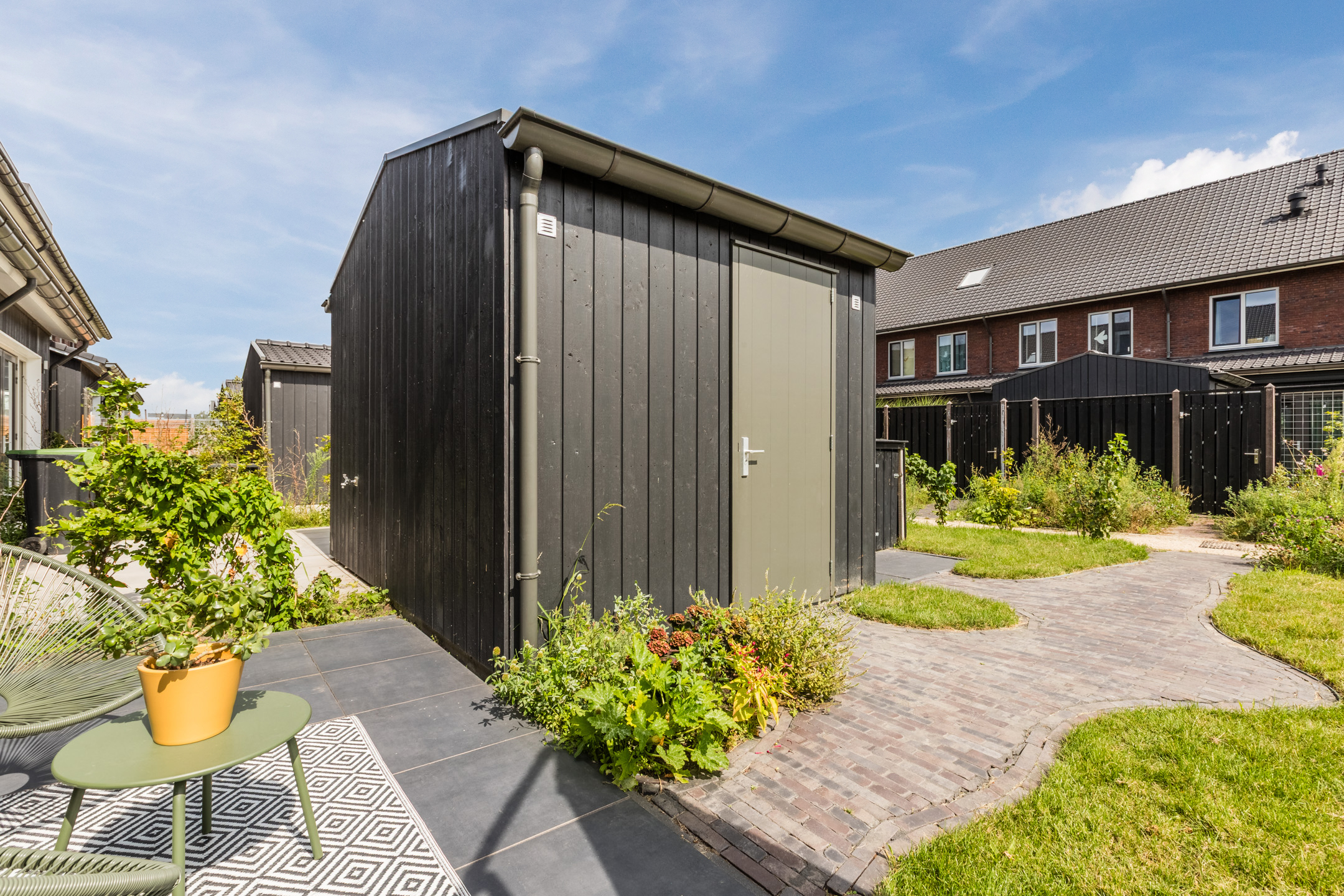 De royale tuin met berging is gelegen op het oosten en is deels ingericht met sierbestrating, zonneterras en een groen haagje, gras en vaste planten. De gehele zijkant van de woning is gelegen aan een groen/bloem strook met appelbomen (die geplukt Ʃn gegeten mogen worden).