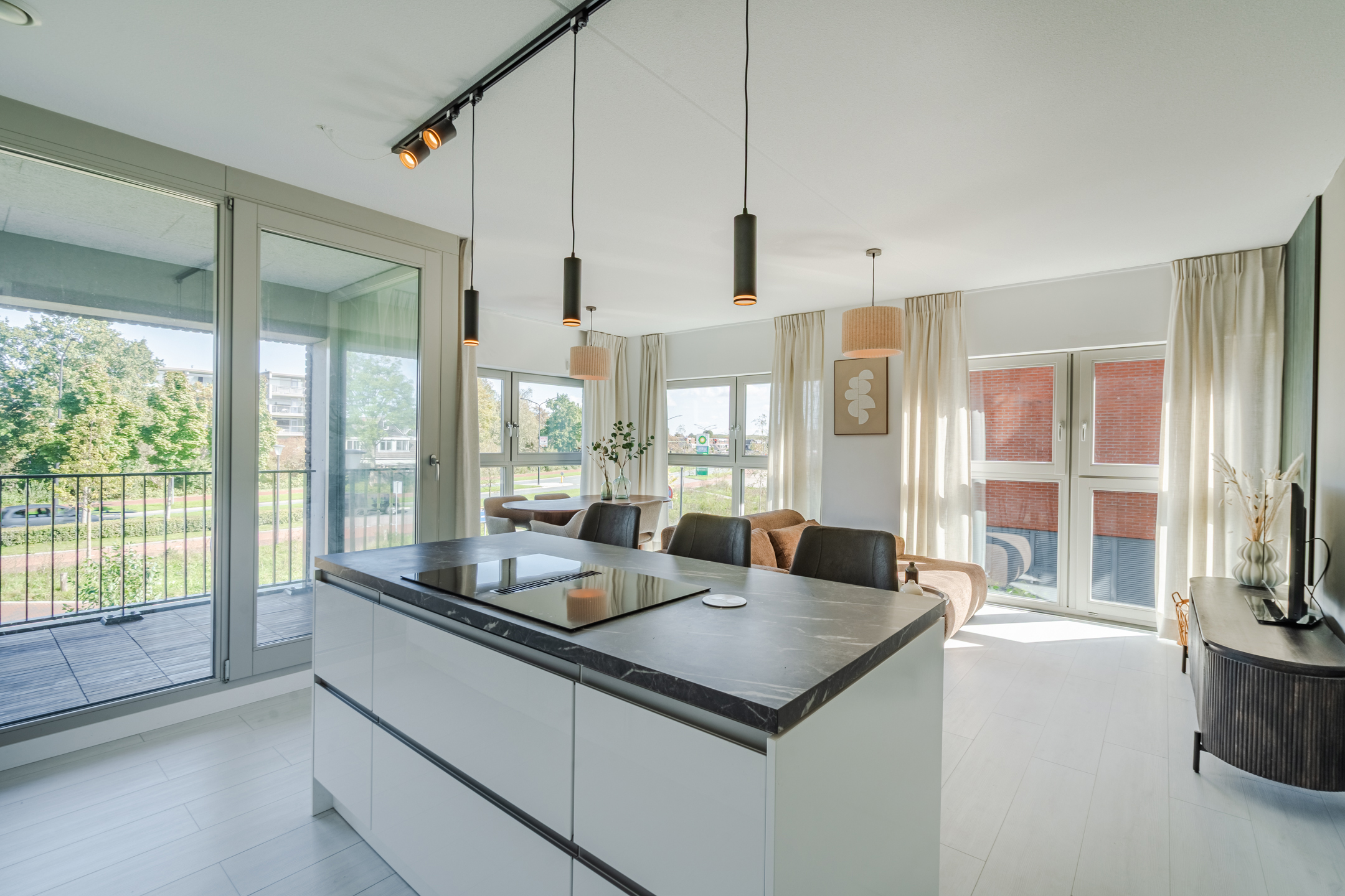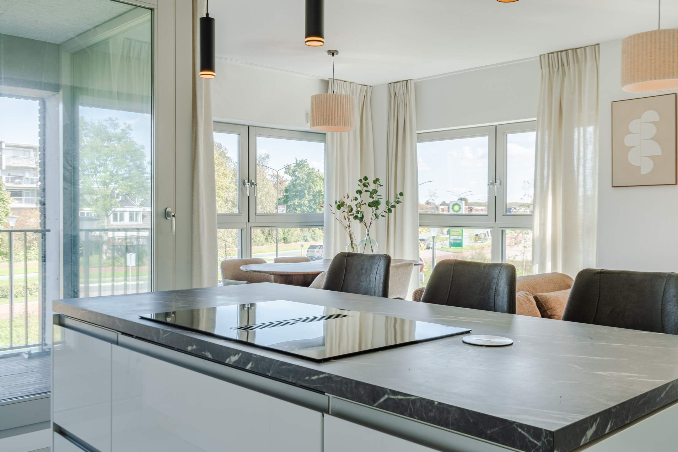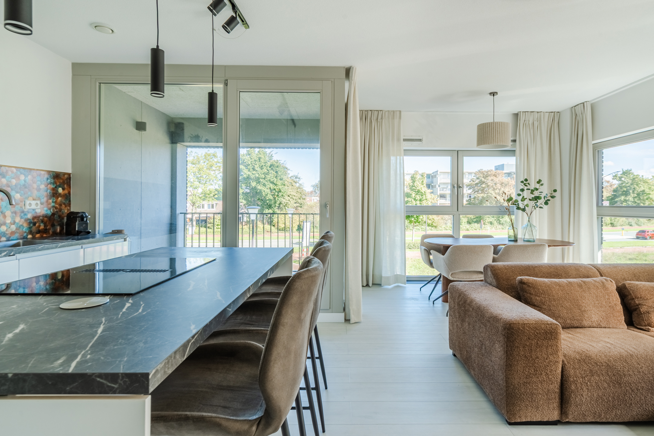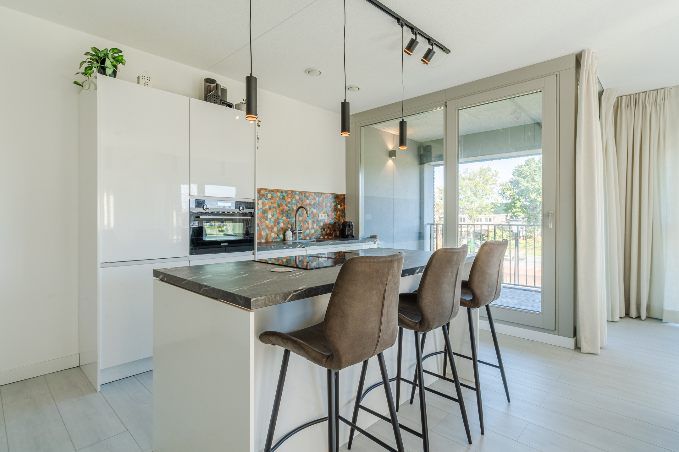 Het appartement met uitzicht over een groenstrook en de Zuidtangent is heerlijk licht. Bij het betreden van het appartement op de 1e verdieping treft u een hal. In de hal treft u een praktische bergkast met wasmachine en droger aansluiting, technische ruimte, meterkast en geheel betegelde toiletruimte met wandcloset en fonteintje. Het appartement heeft een ruime en lichte living met fraaie PVC vloerbedekking met vloerverwarming, gestuukte wanden en een open verbinding met de keuken (2023), welke in een rechte opstelling is geplaatst met kookeiland en voorzien van diverse Siemens inbouwapparatuur, waaronder een vaatwasser met Wifi, 4 pits inductie kookplaat incl. afzuiging, combi-magnetron, koelkast, vriezer en Quooker. De royale slaapkamer is tevens voorzien van een PVC vloer en heeft toegang tot een geheel betegelde badkamer met inloopdouche, wastafel met meubel en spiegel.