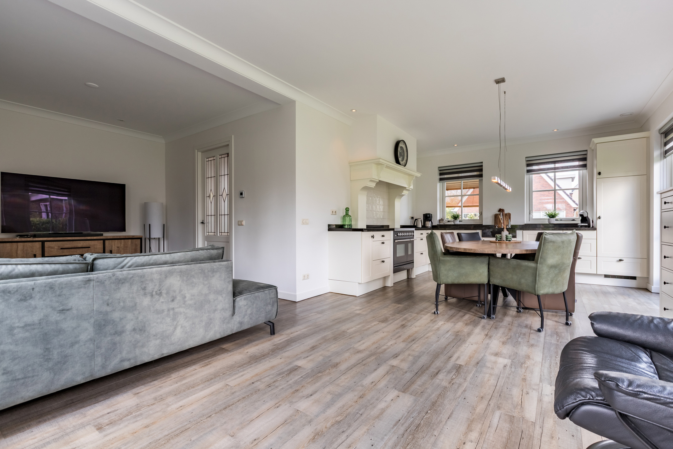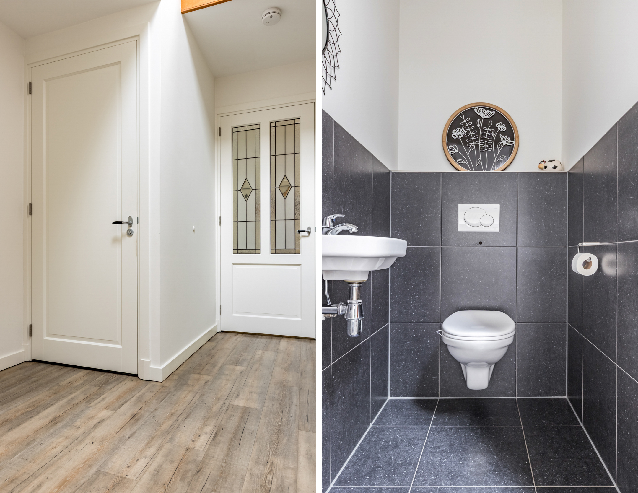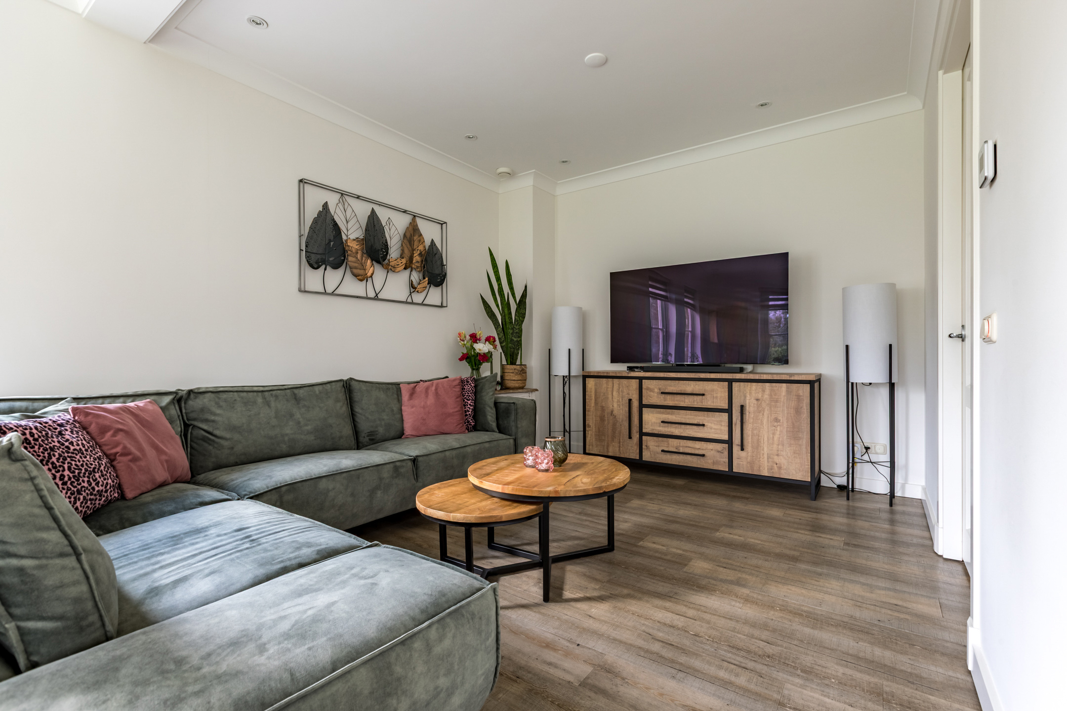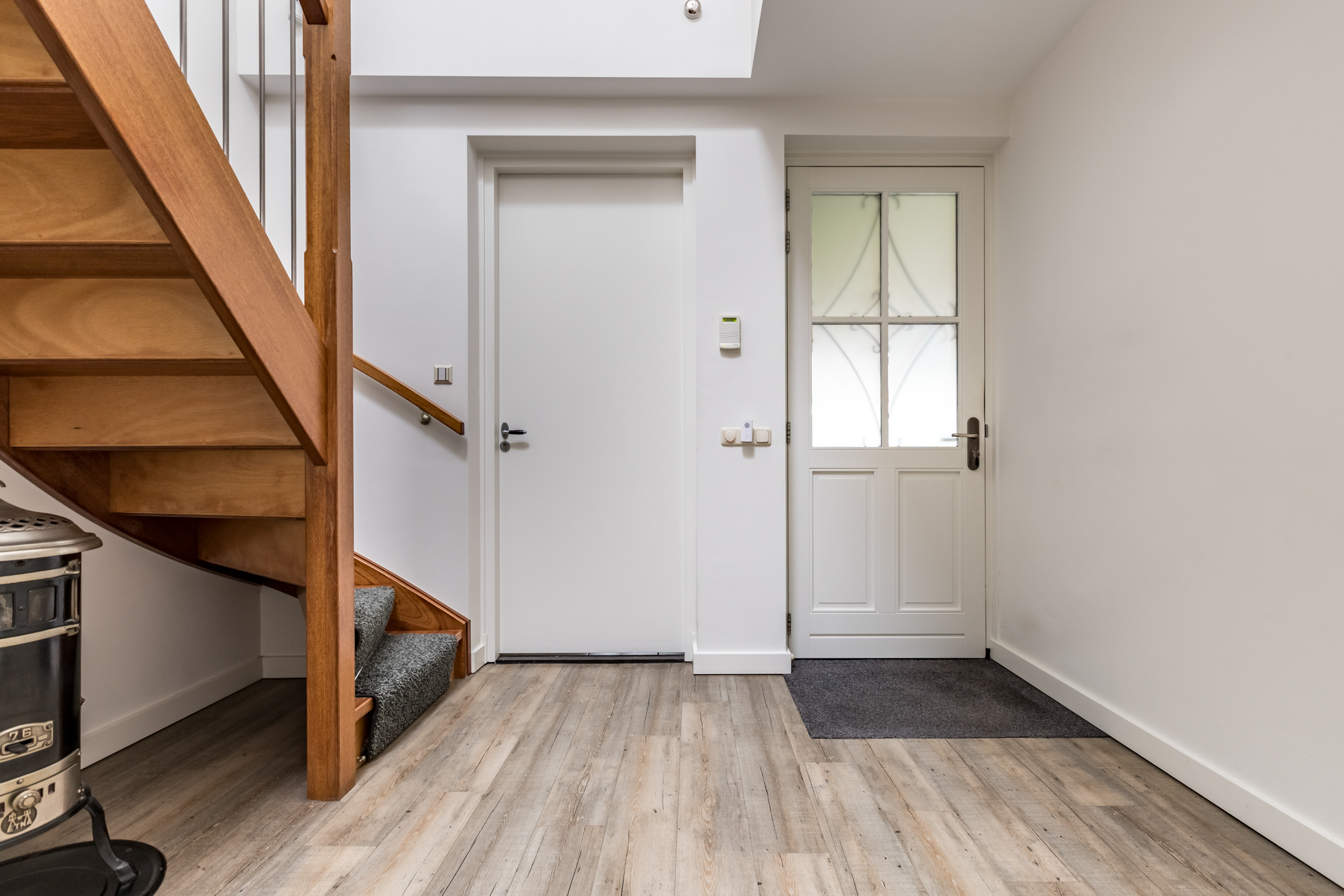 Entree, hal voorzien van een fraaie pvc vloer met vloerverwarming, prachtige vide, modern toilet met wandcloset en fonteintje. Woonkamer voorzien van gestuukte wanden met fraaie stuc lijst en openslaande deuren naar de moderne en onderhoudsvriendelijk aangelegde tuin. Aan de achterzijde van de woning is een serre geplaatst.