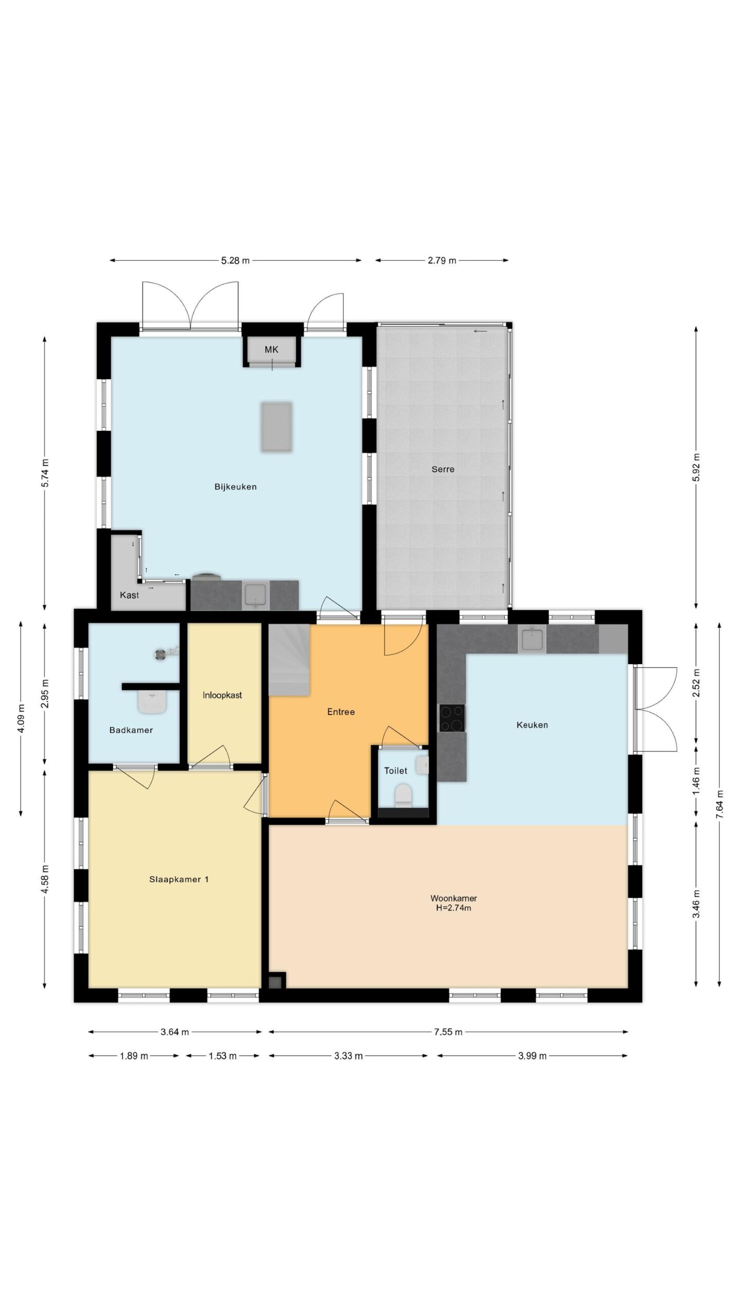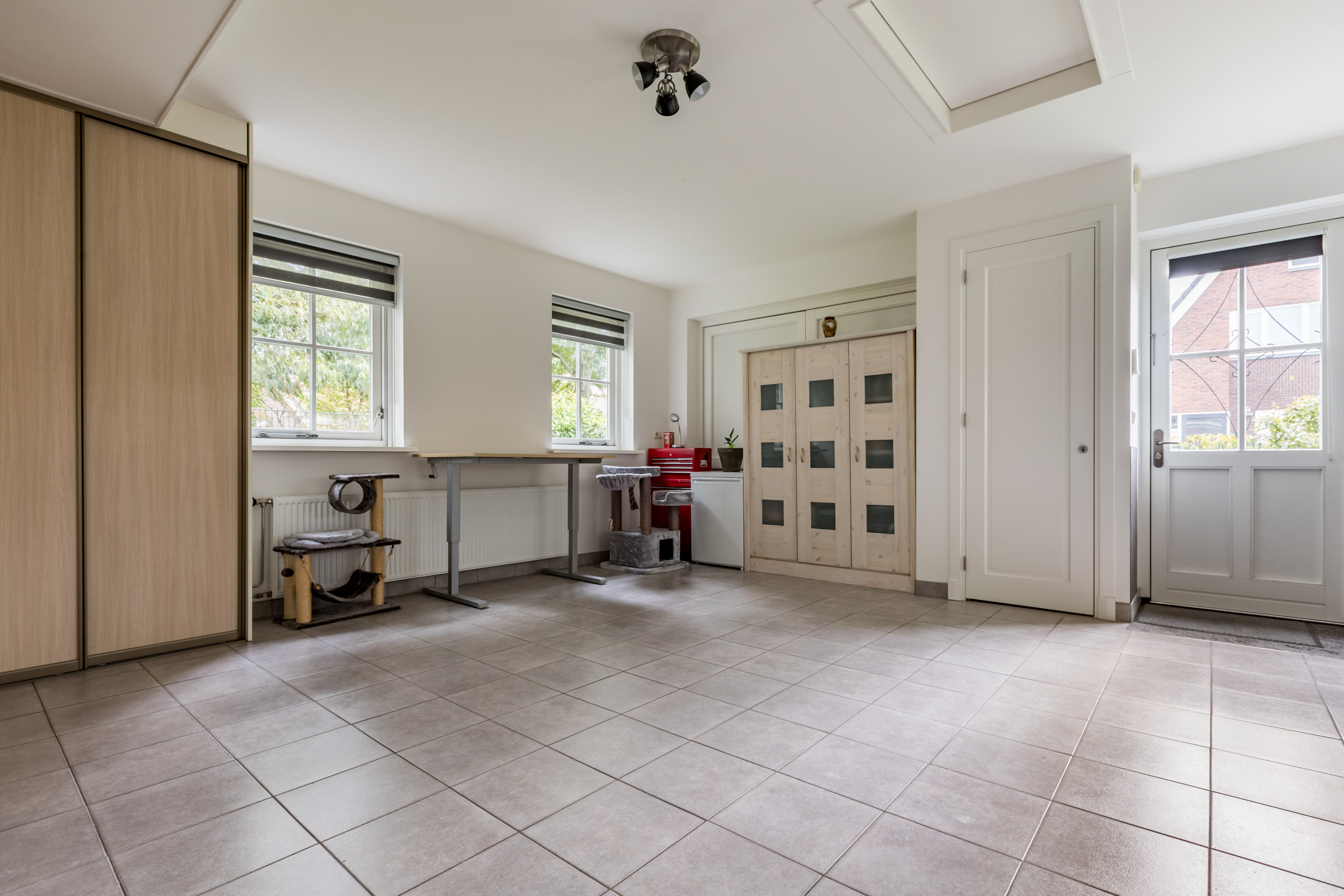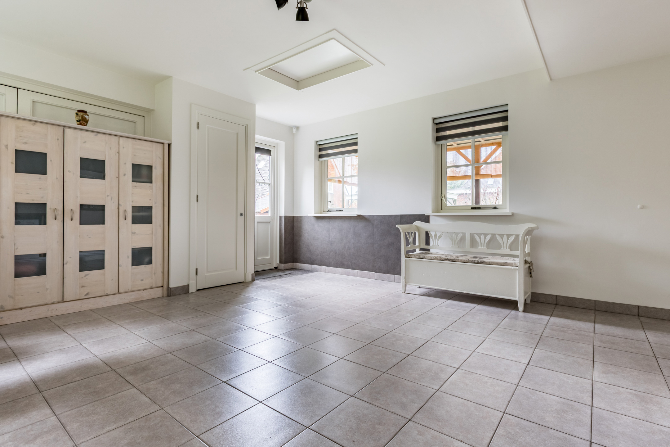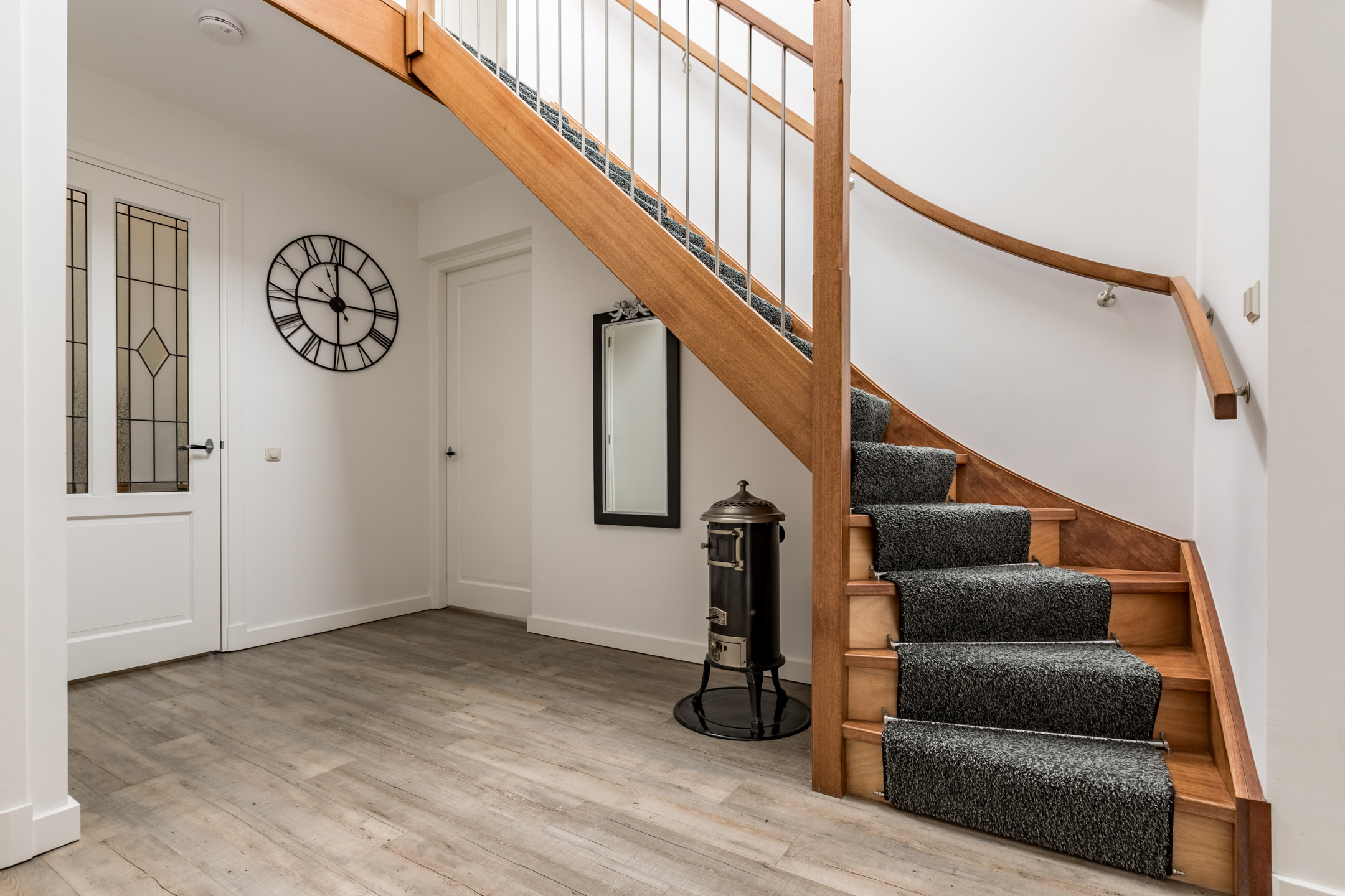 Entree, hal voorzien van een fraaie pvc vloer met vloerverwarming, prachtige vide, modern toilet met wandcloset en fonteintje. Woonkamer voorzien van gestuukte wanden met fraaie stuc lijst en openslaande deuren naar de moderne en onderhoudsvriendelijk aangelegde tuin. Aan de achterzijde van de woning is een serre geplaatst.