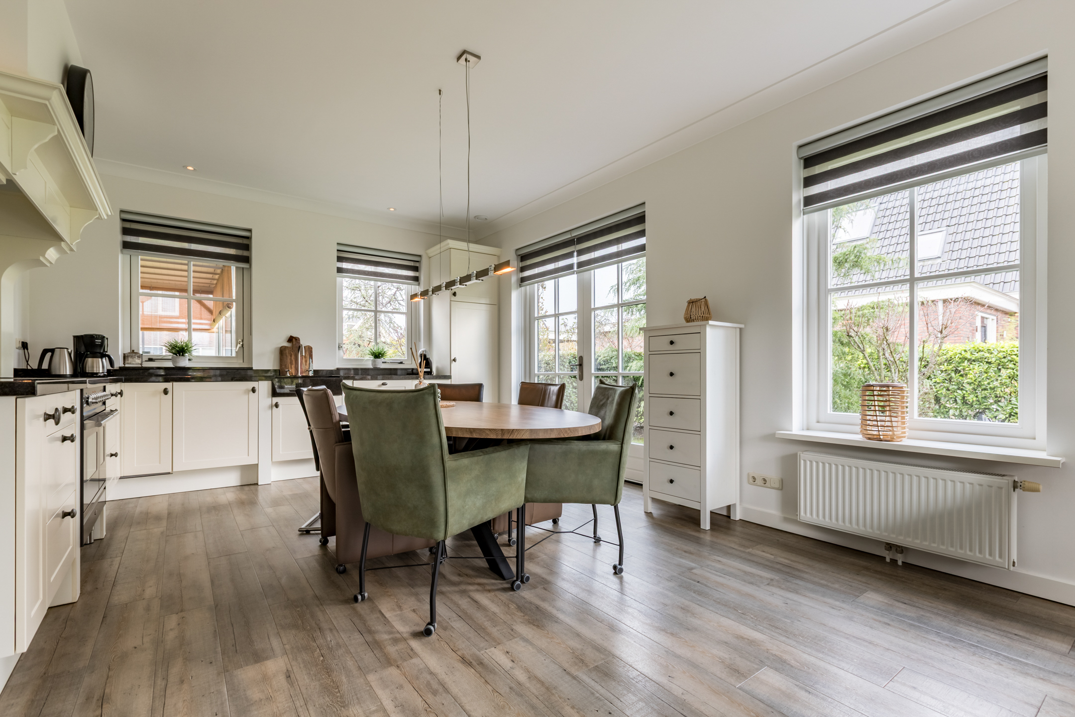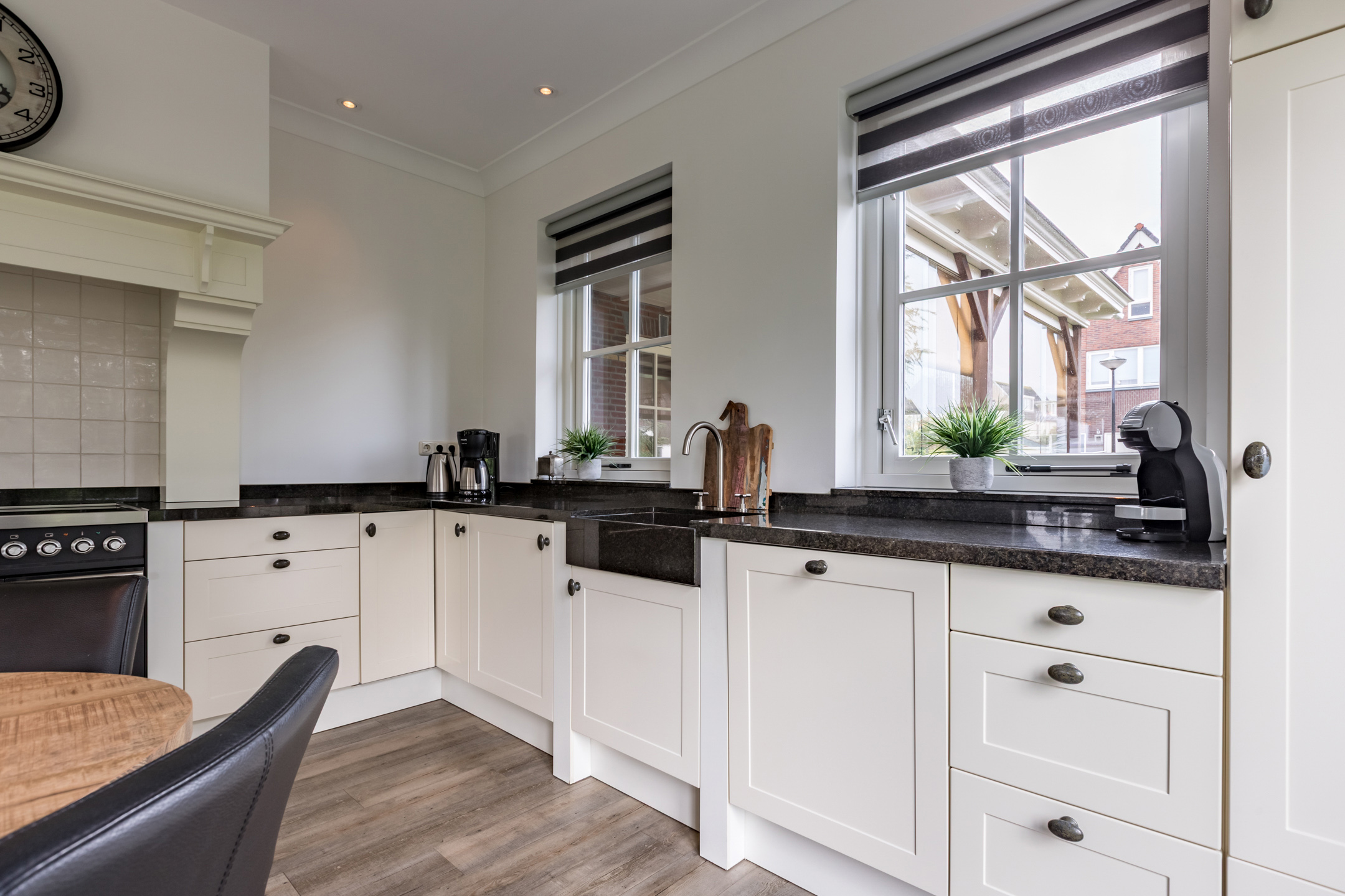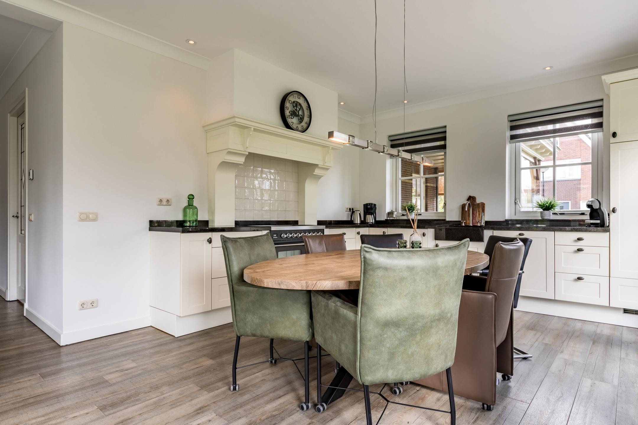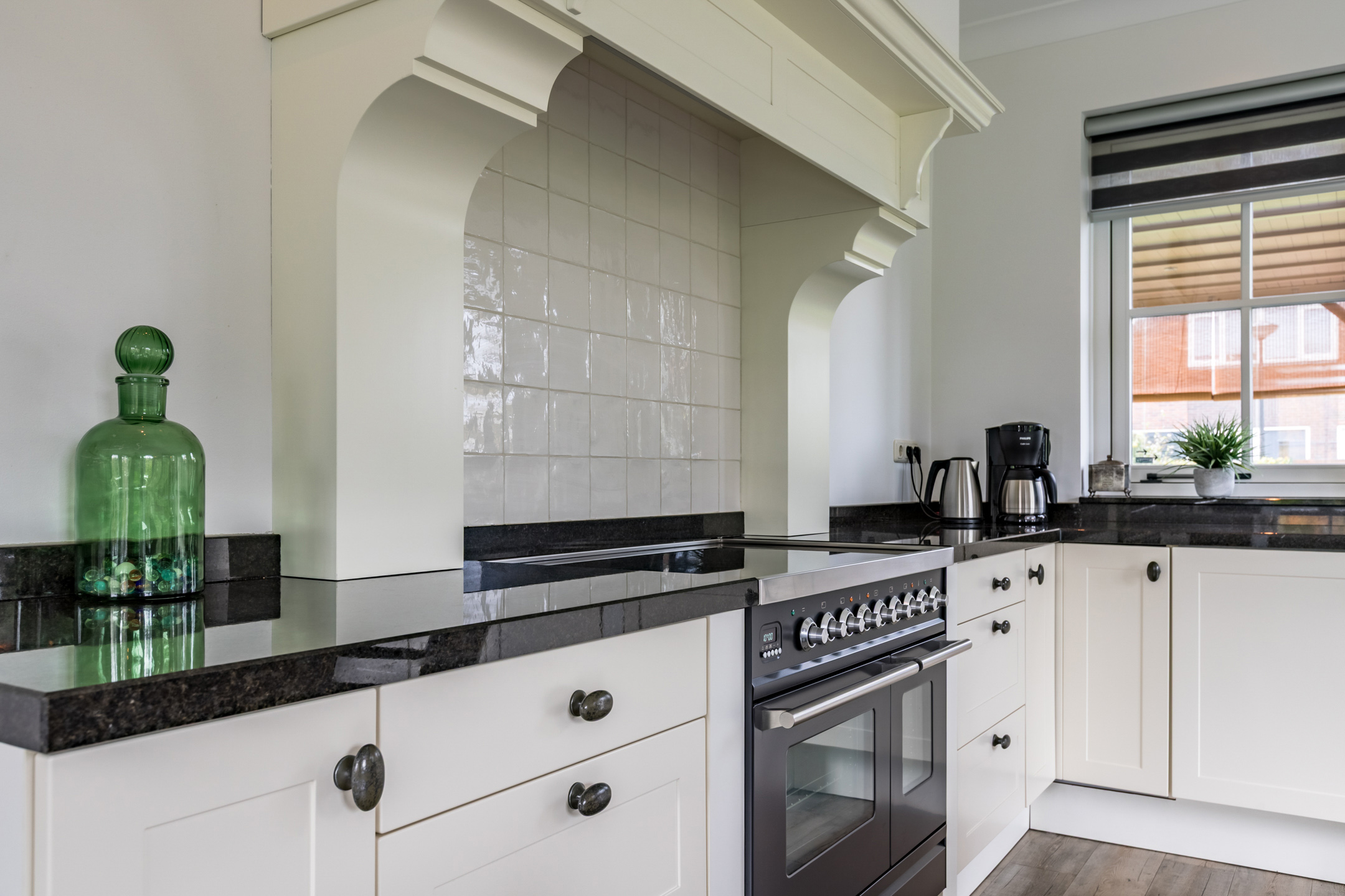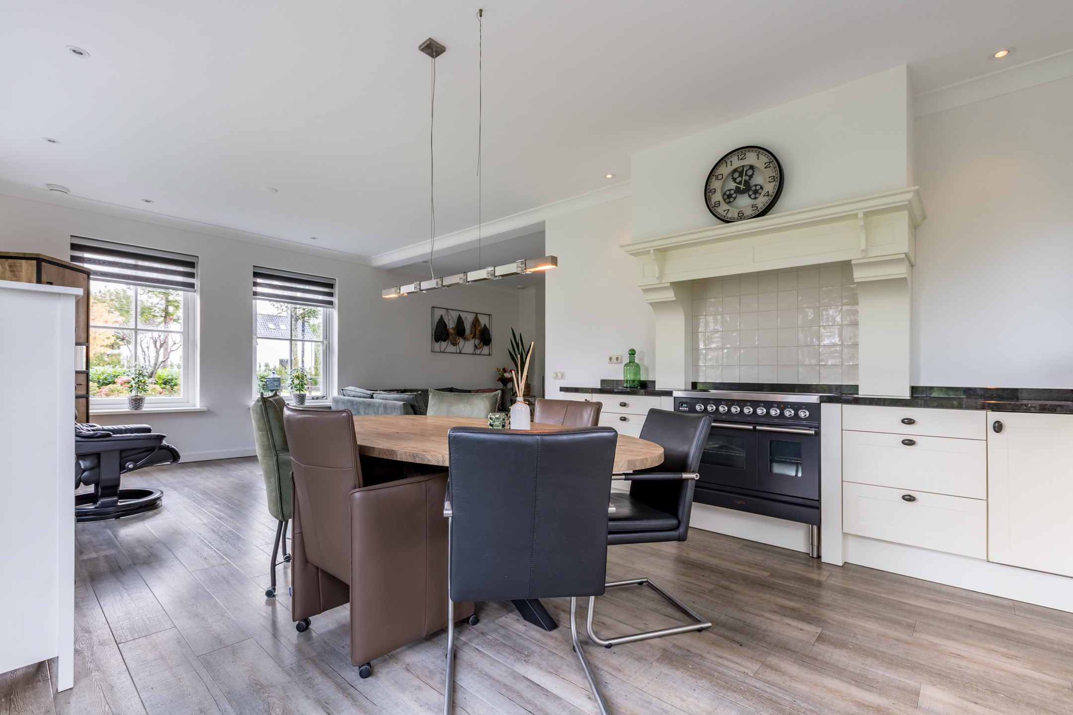 De keuken is in hoekopstelling geplaatst en voorzien van een fraai natuurstenen werkblad en diverse inbouwapparatuur o.a., een koelkast, 5 pits inductie fornuis met dubbele oven. Voorts beschikt de keuken over een vaatwasser, een fraaie afzuigkap, close in boiler, veel kasten en lades. De bijkeuken is voorzien van een wasmachineaansluiting, keukenblok, meterkast en vlizotrap naar de bergvliering.