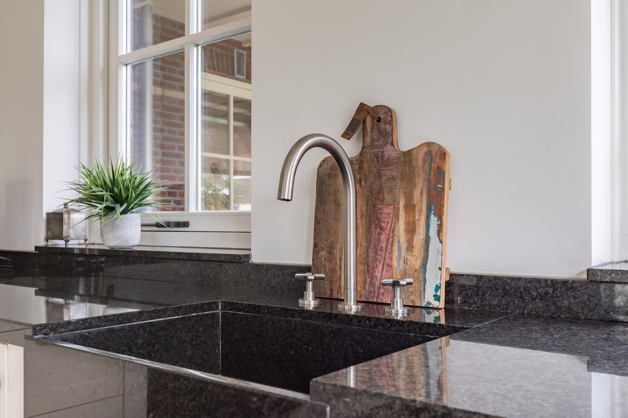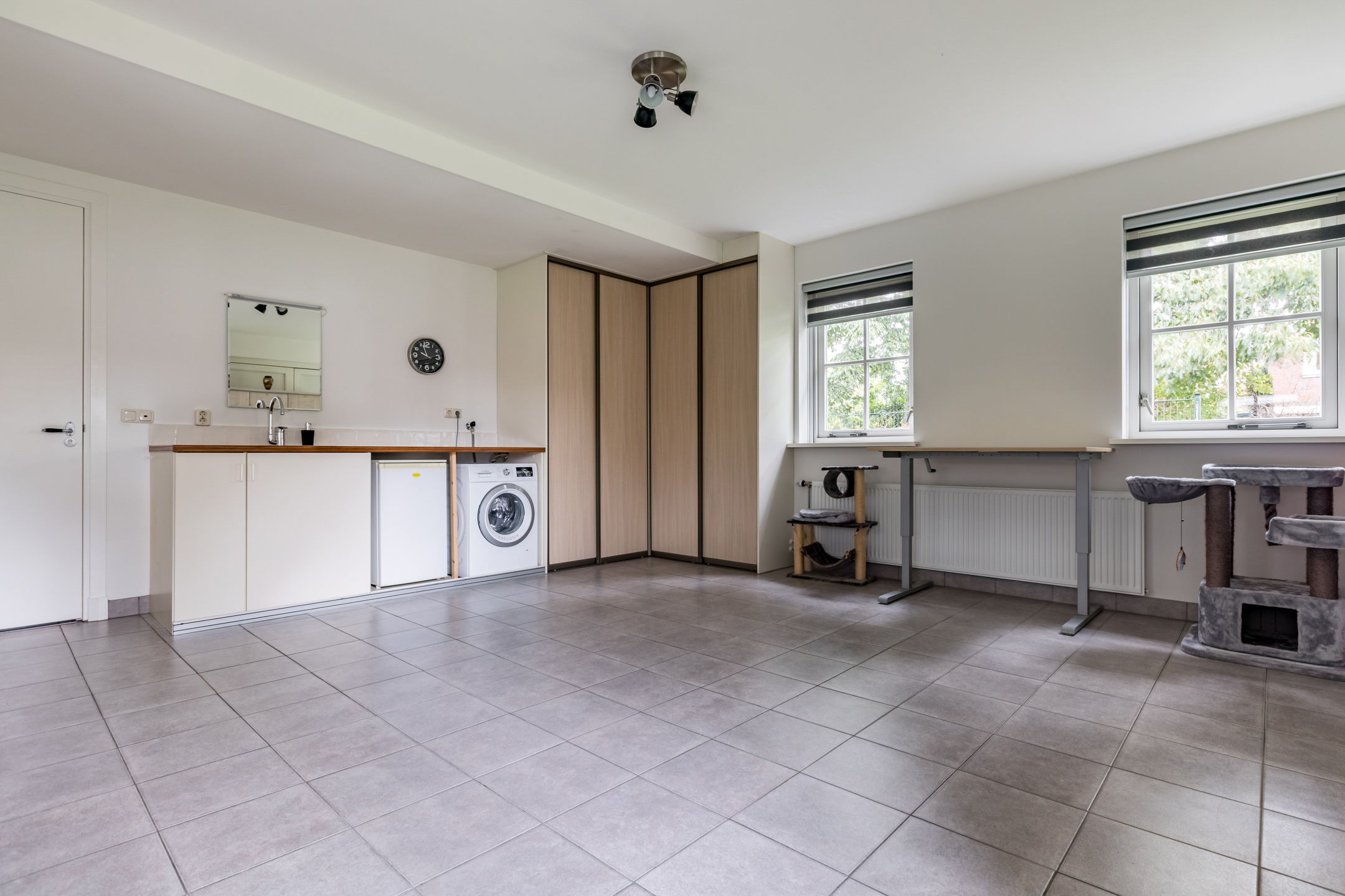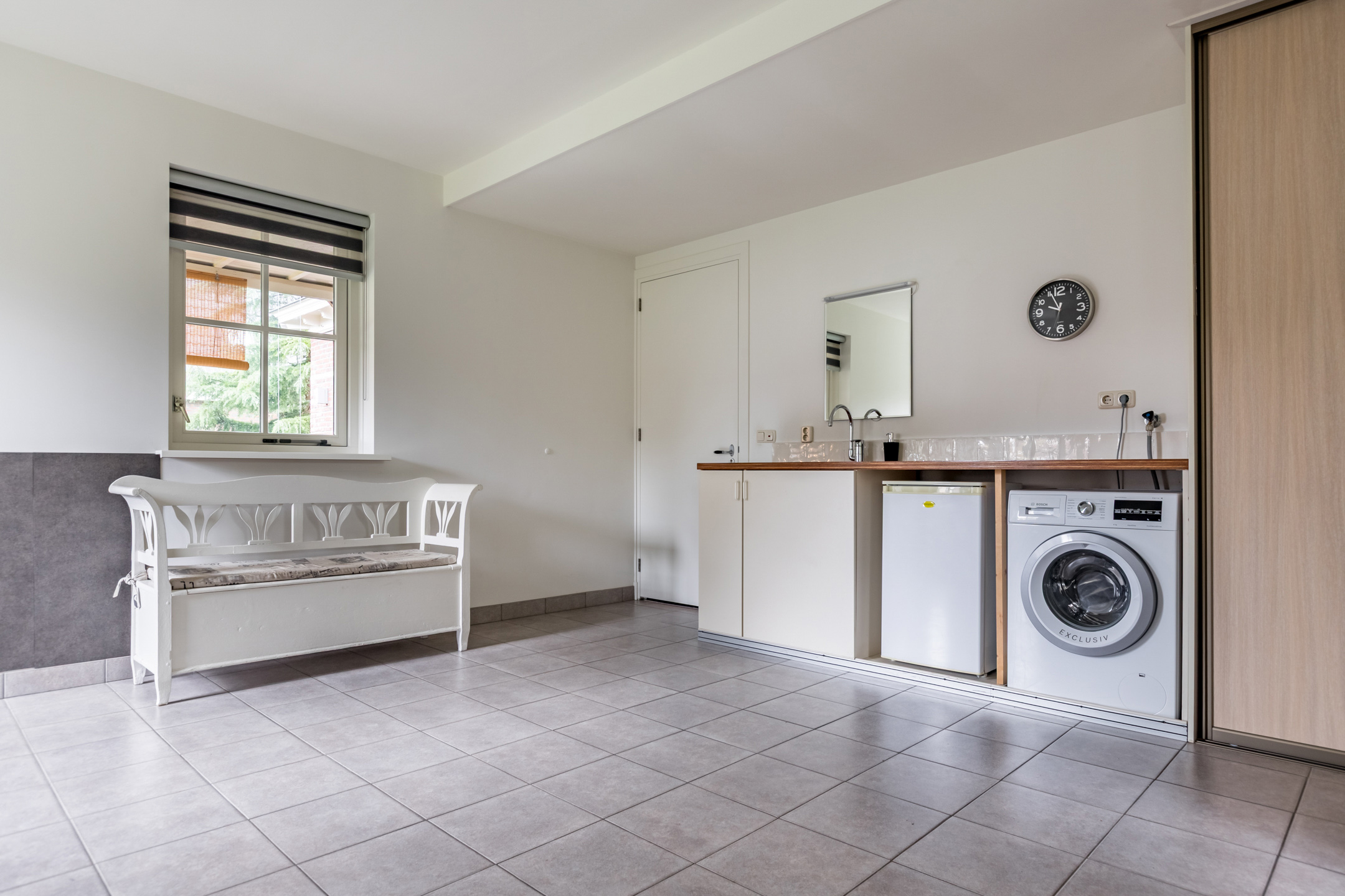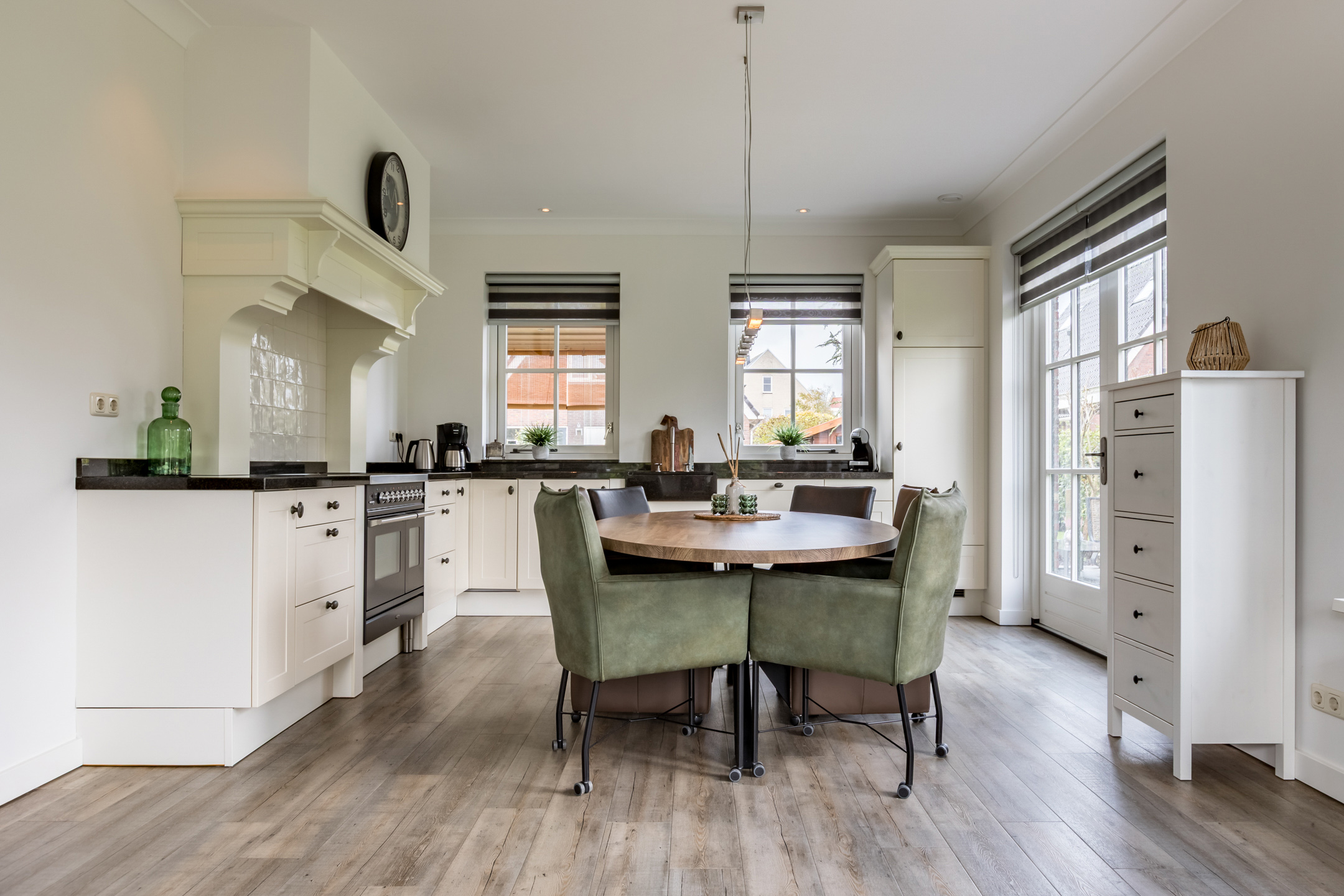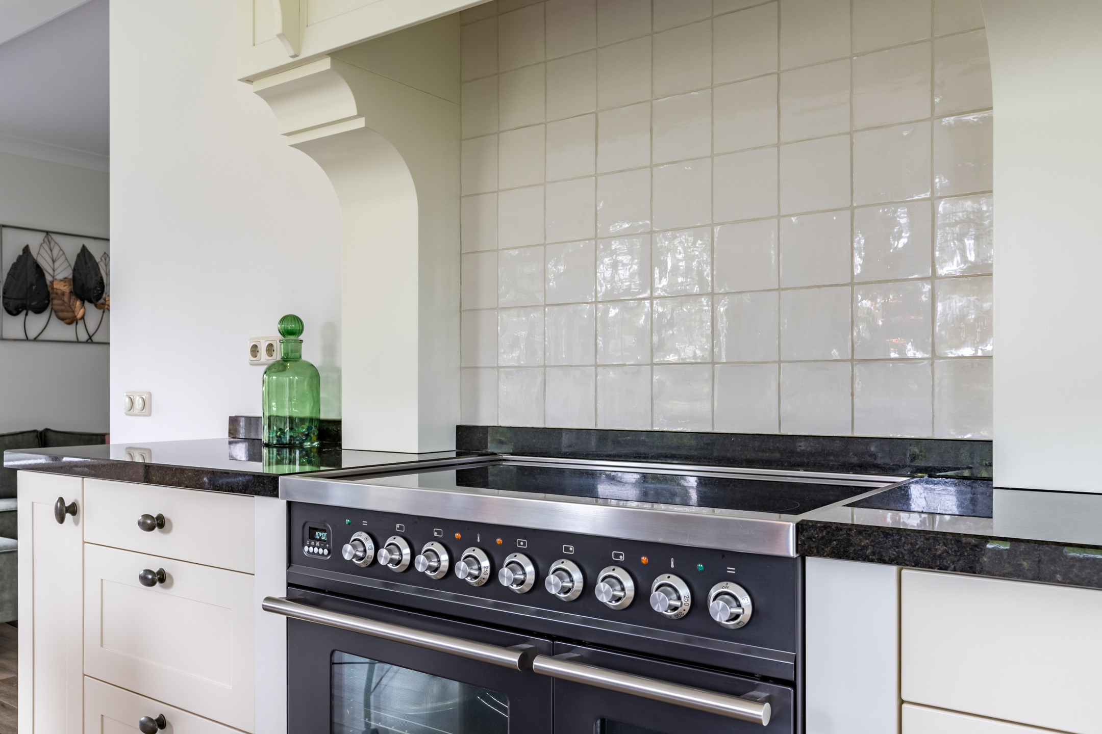 De keuken is in hoekopstelling geplaatst en voorzien van een fraai natuurstenen werkblad en diverse inbouwapparatuur o.a., een koelkast, 5 pits inductie fornuis met dubbele oven. Voorts beschikt de keuken over een vaatwasser, een fraaie afzuigkap, close in boiler, veel kasten en lades. De bijkeuken is voorzien van een wasmachineaansluiting, keukenblok, meterkast en vlizotrap naar de bergvliering.