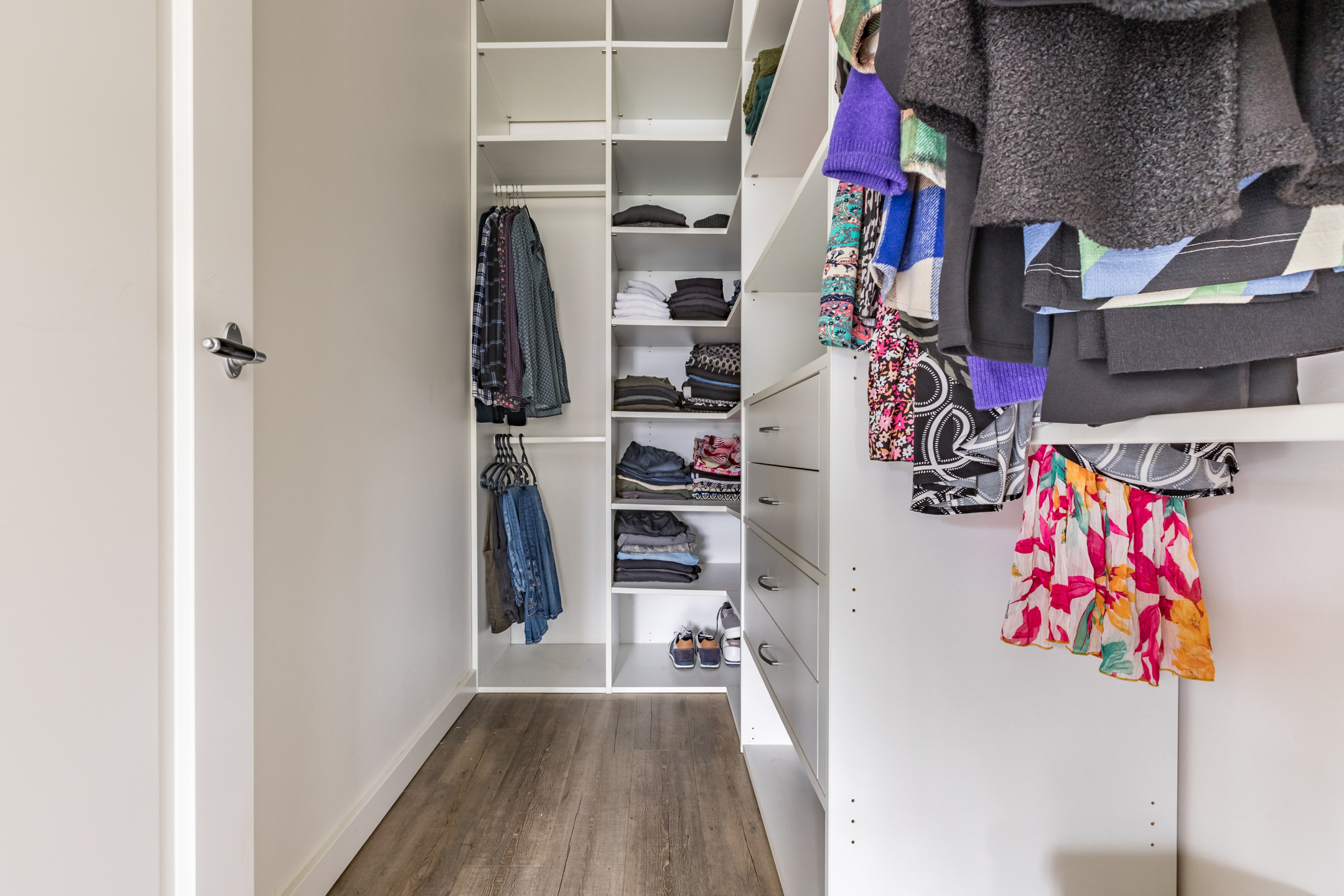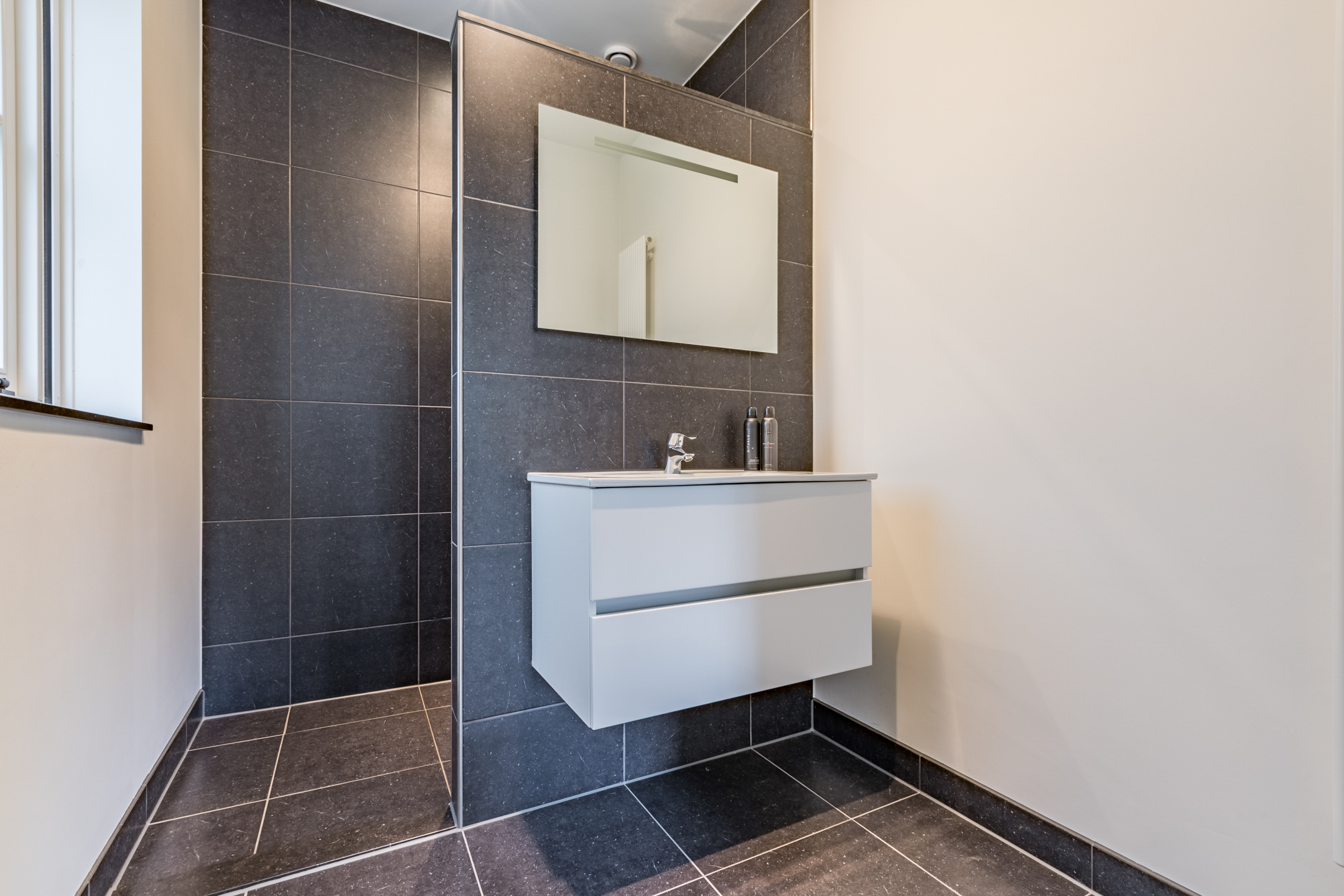 De slaapkamer op de begane grond is voorzien van een inloopkast en heeft een badkamer (en suite) met inloopdouche, wastafelmeubel en spiegel met verlichting.