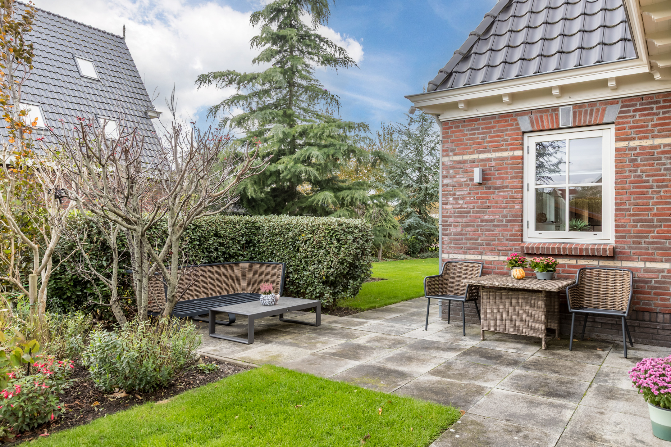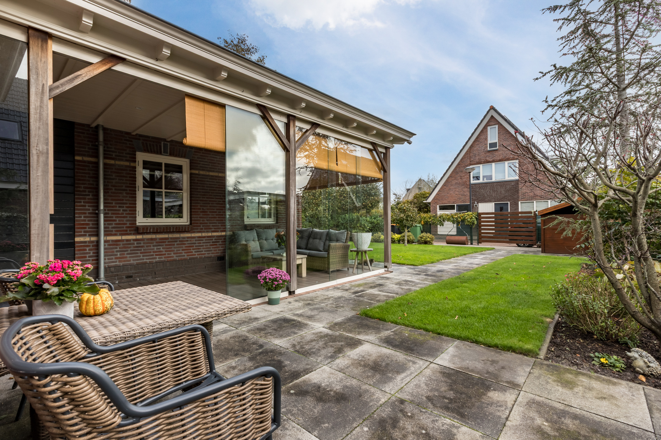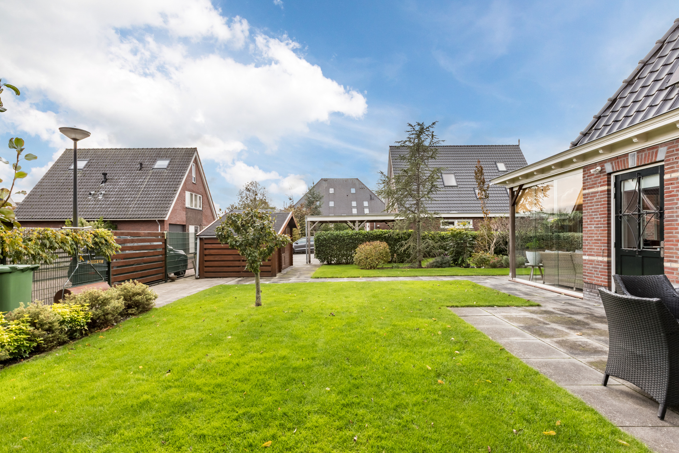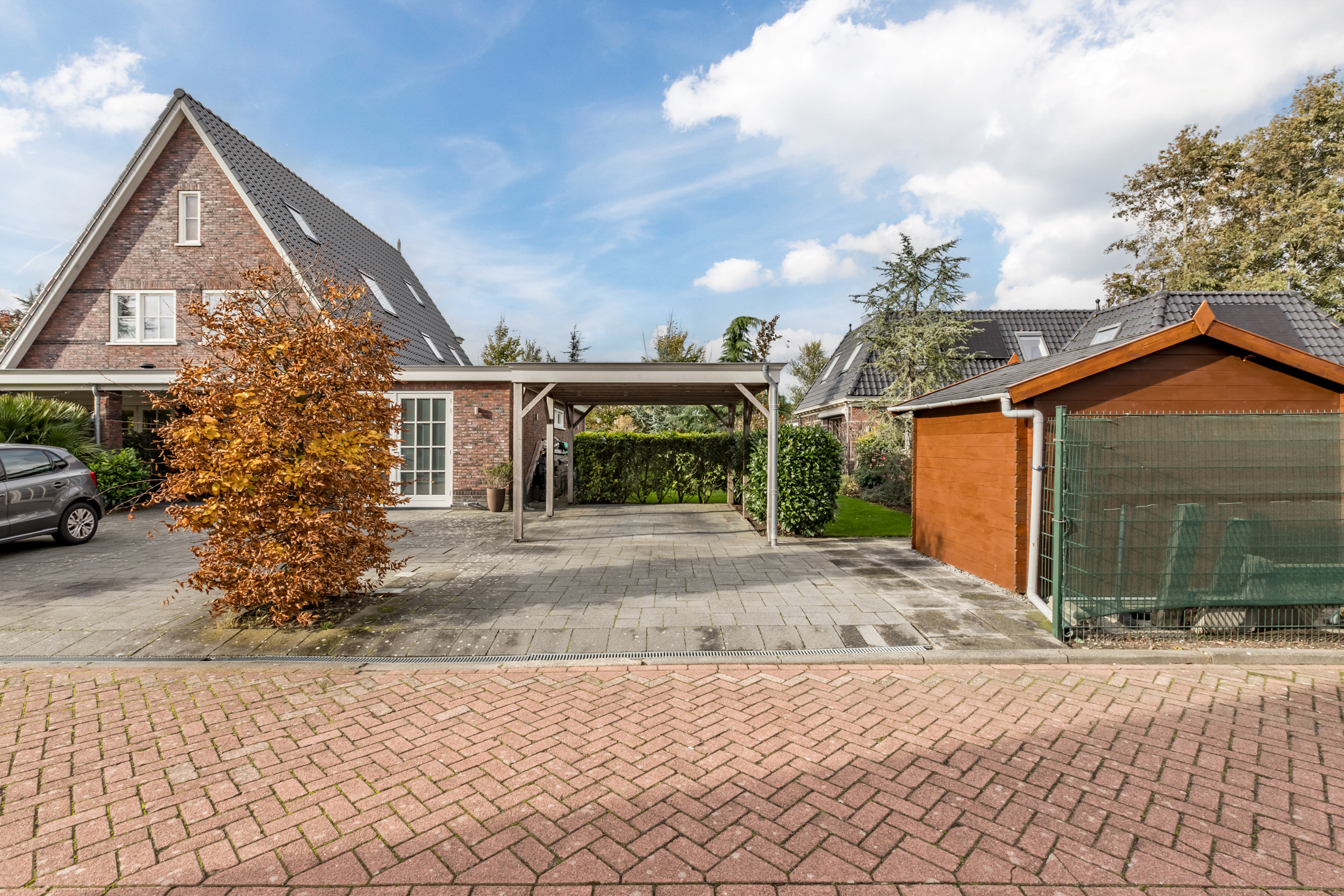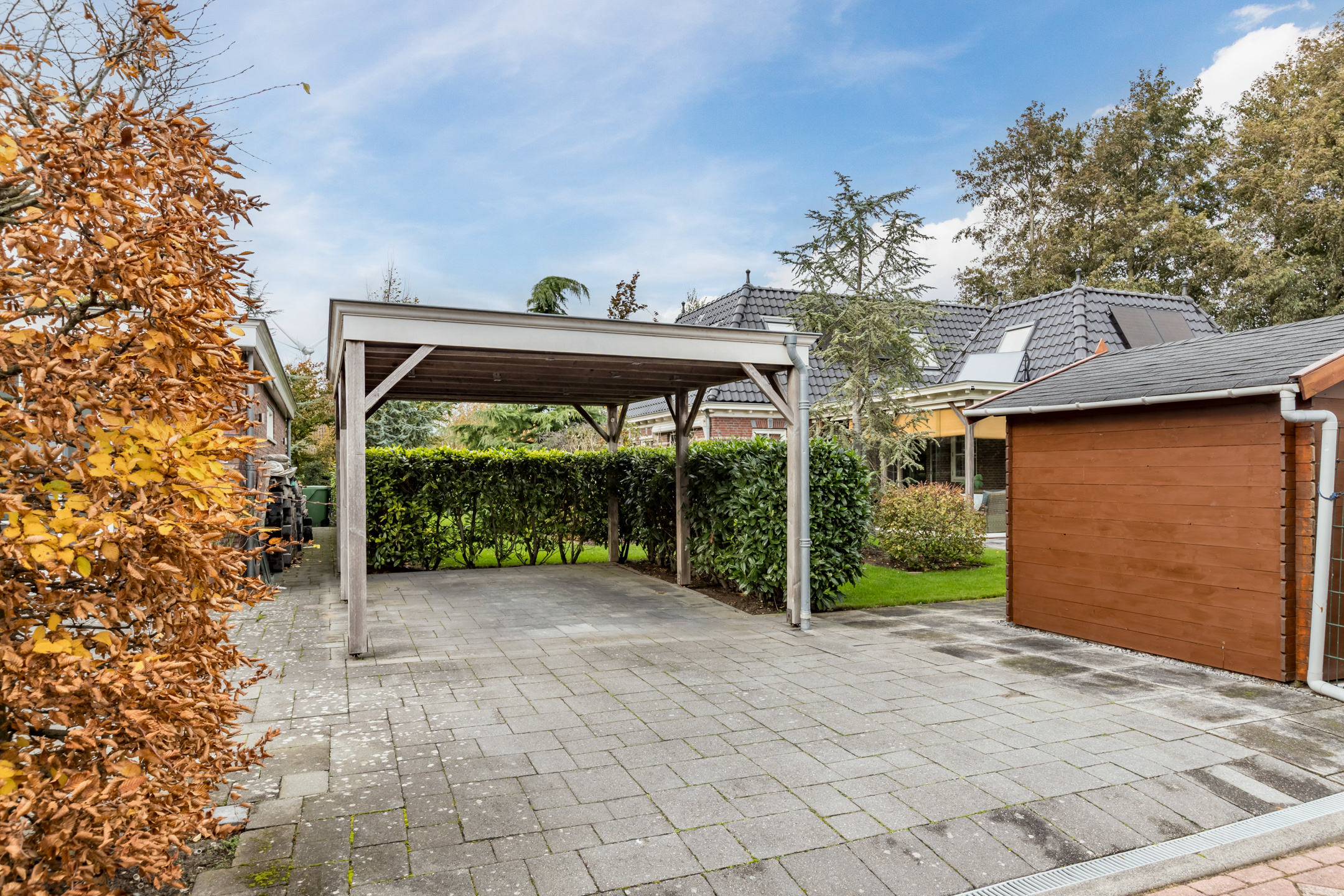 De prachtige aangelegde tuin beschikt over een fraaie overkapping heeft diverse terrassen, gazon en volwassen groen en houten berging. Tevens is er een oprit met een carport aanwezig.