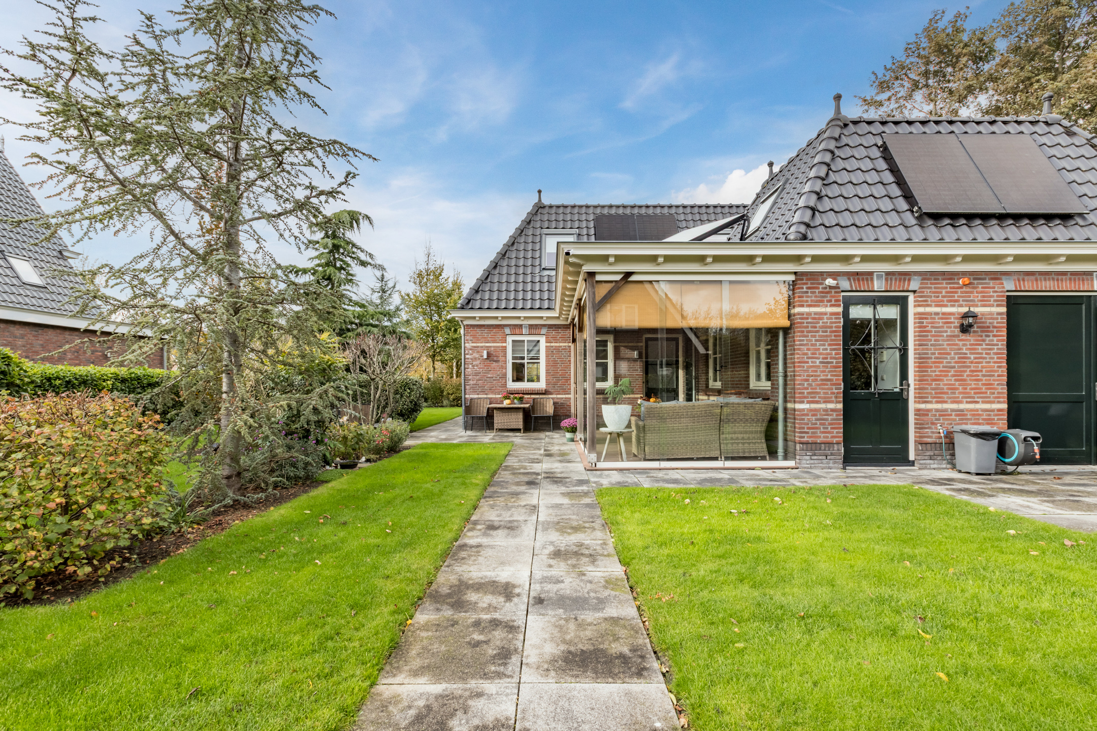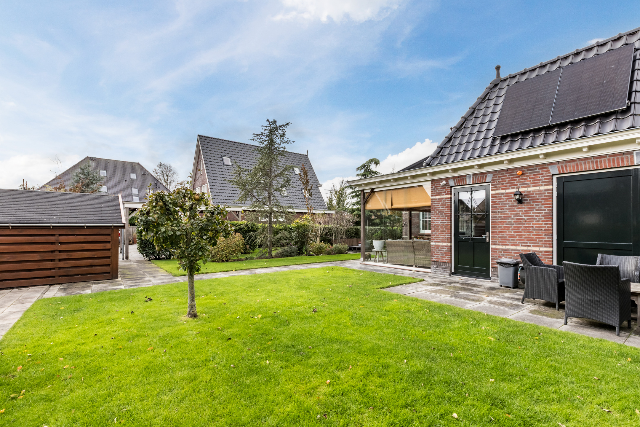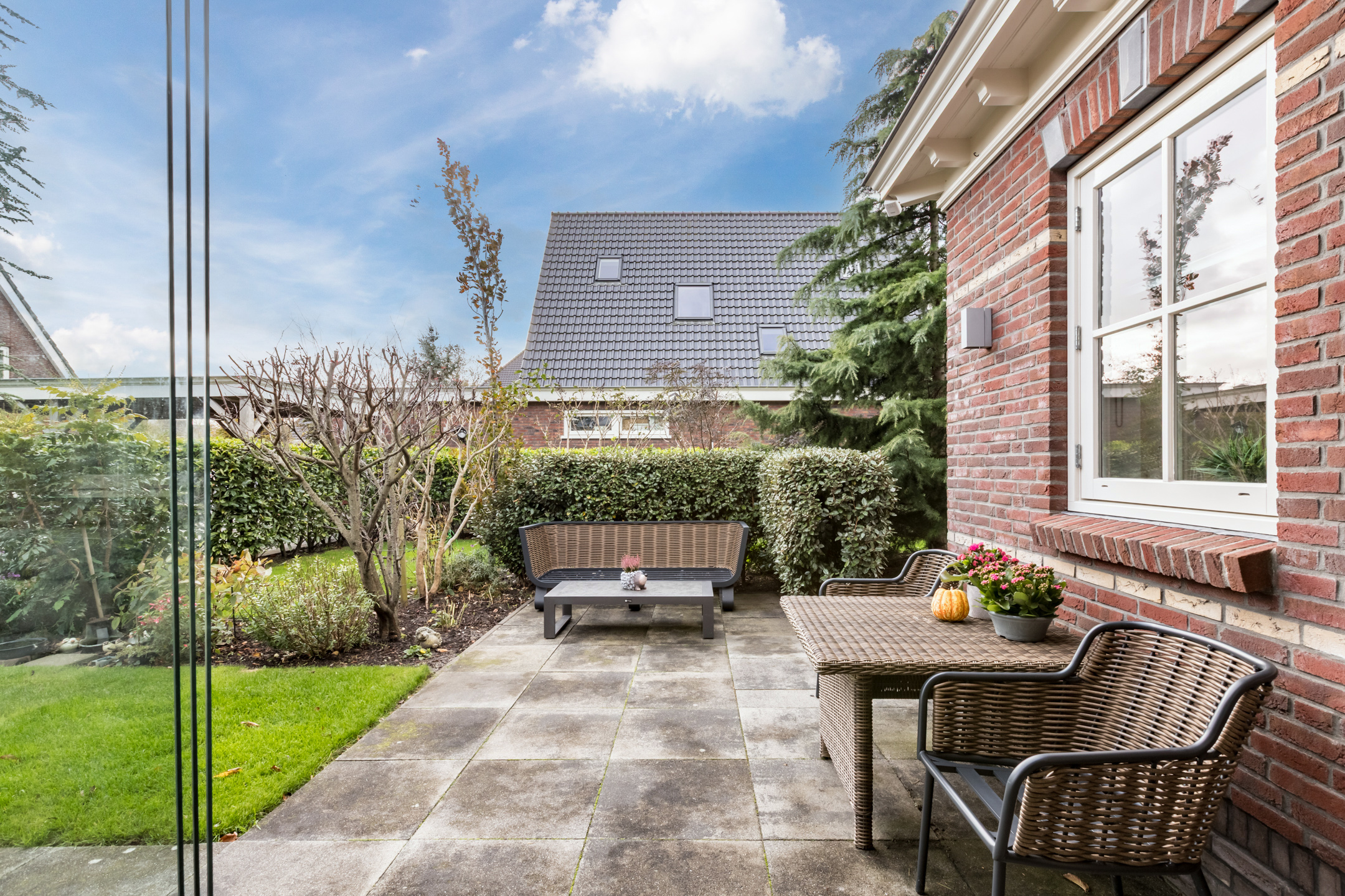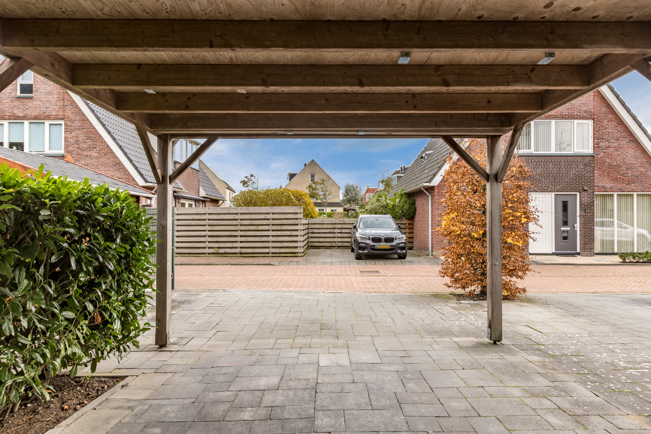 De prachtige aangelegde tuin beschikt over een fraaie overkapping heeft diverse terrassen, gazon en volwassen groen en houten berging. Tevens is er een oprit met een carport aanwezig.
