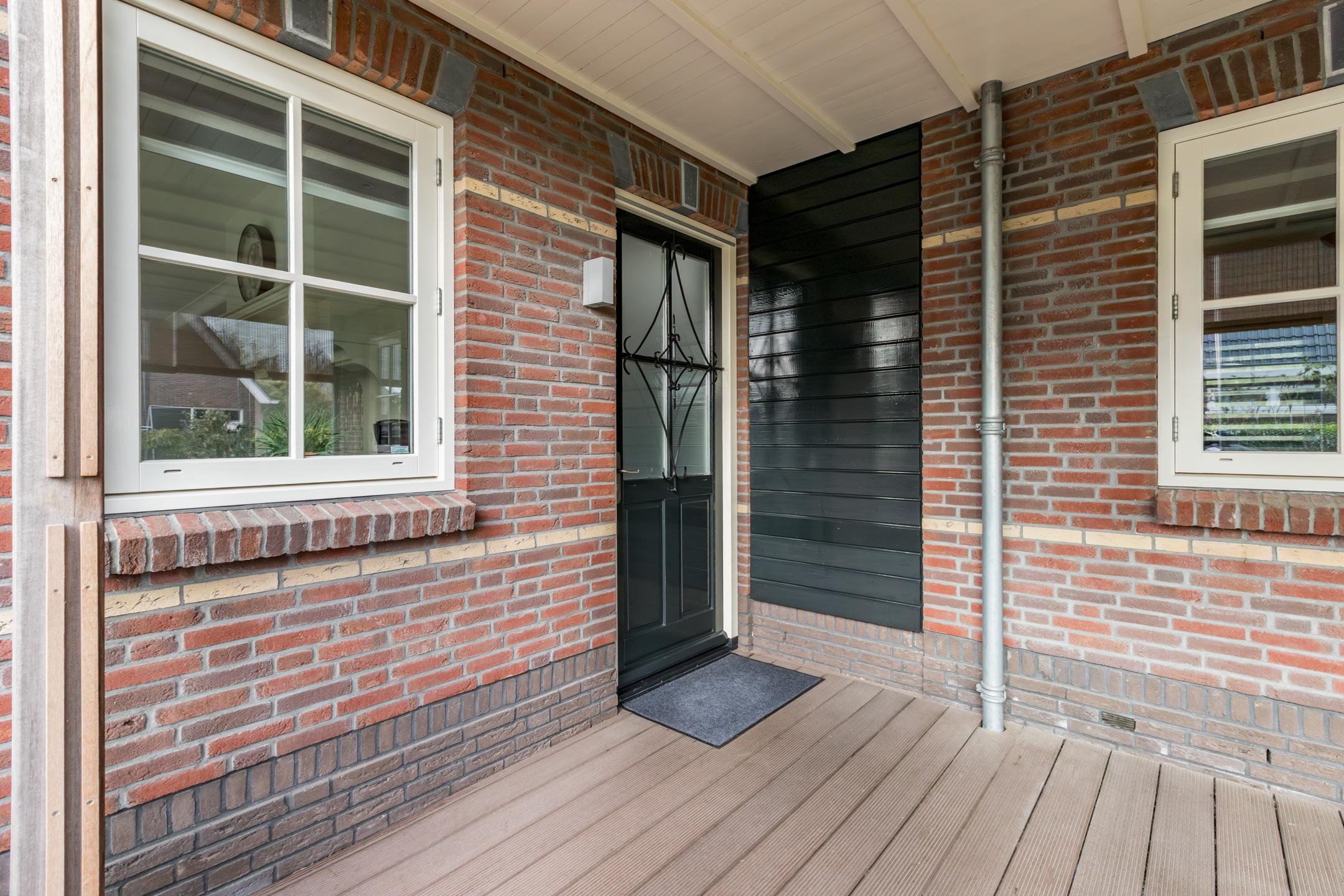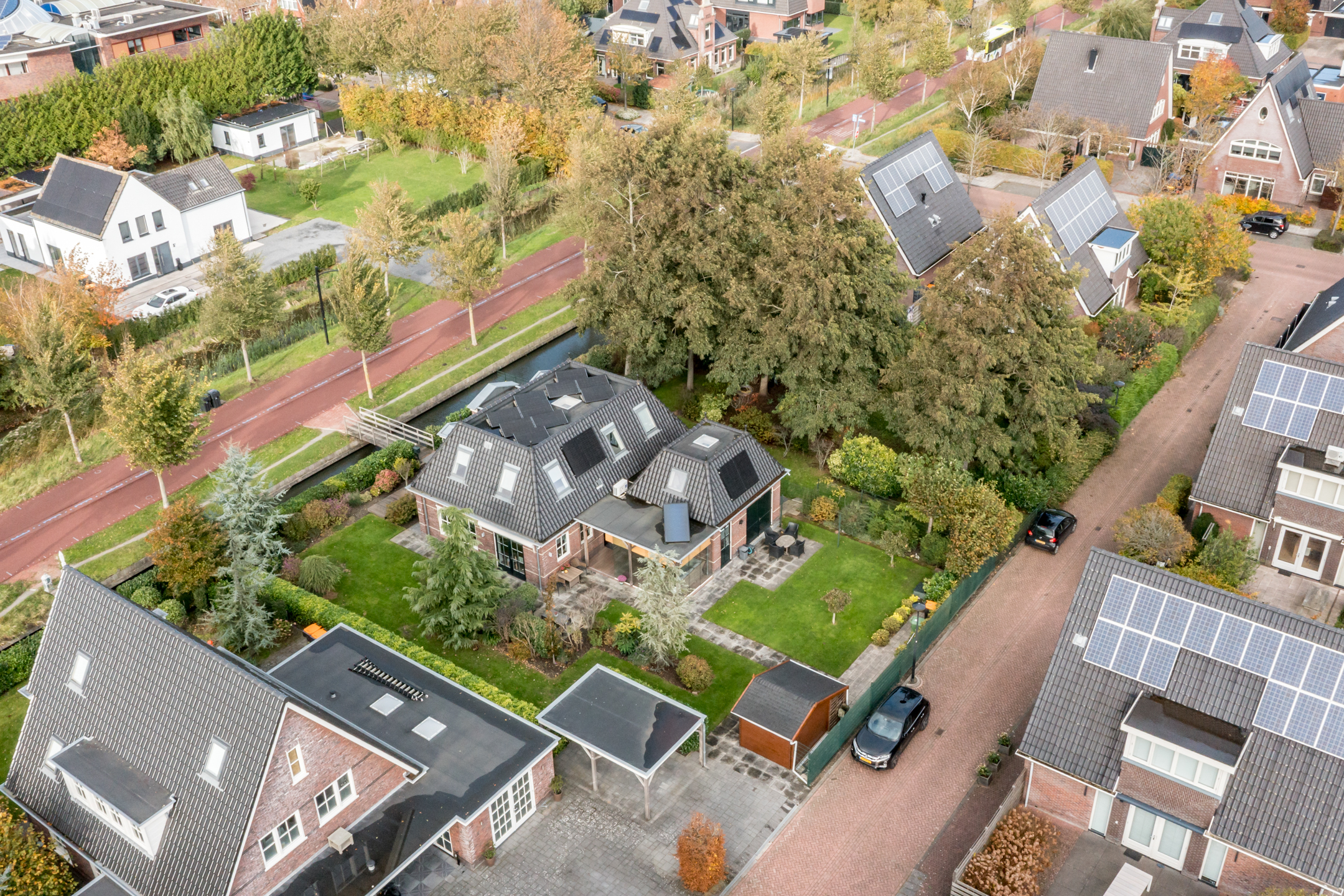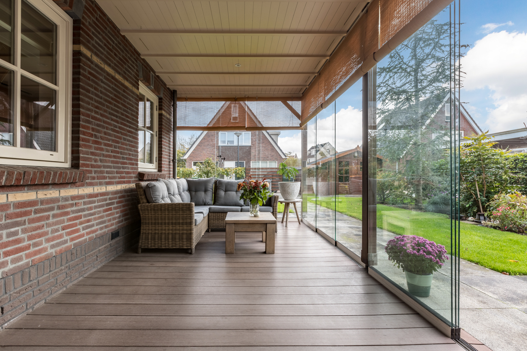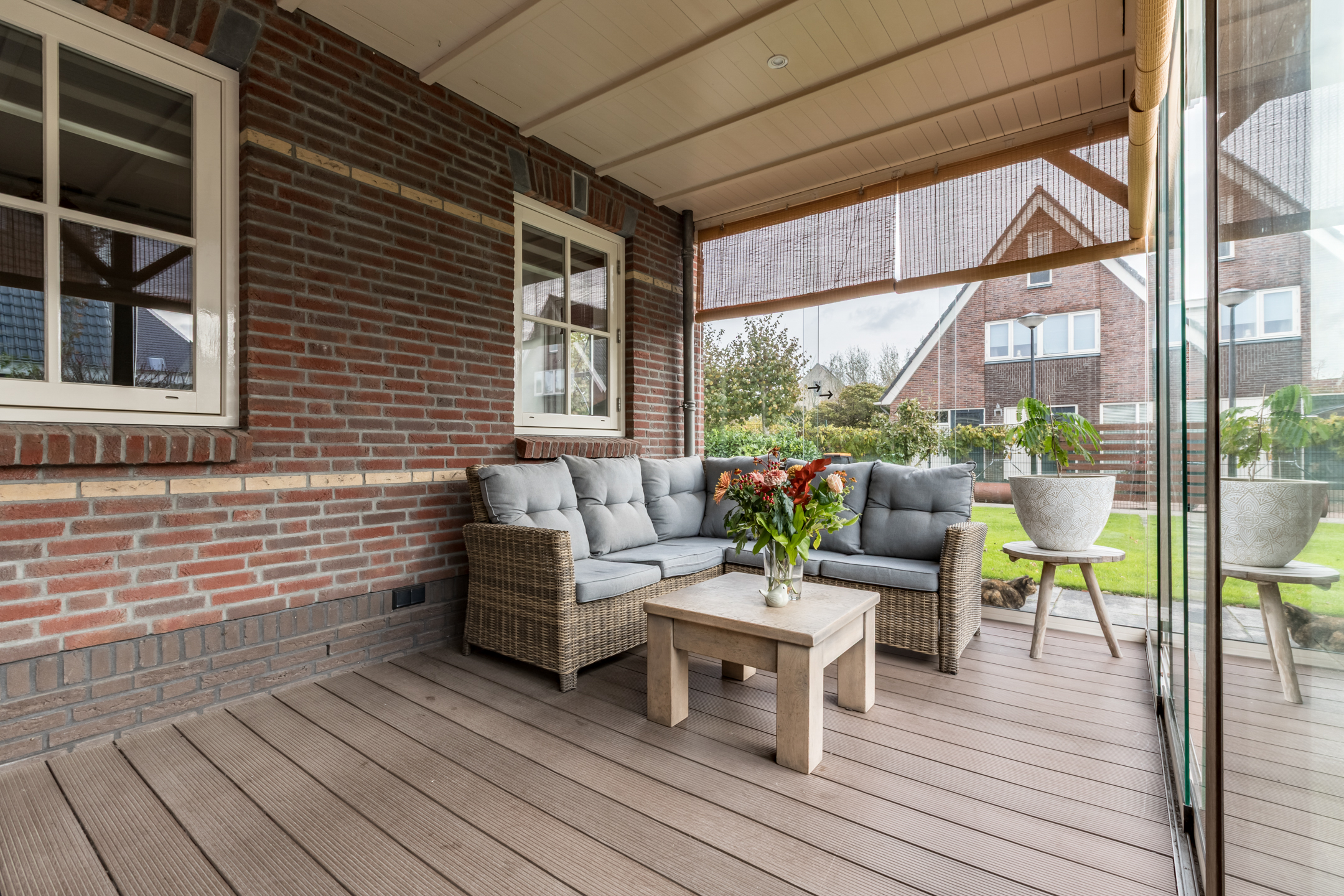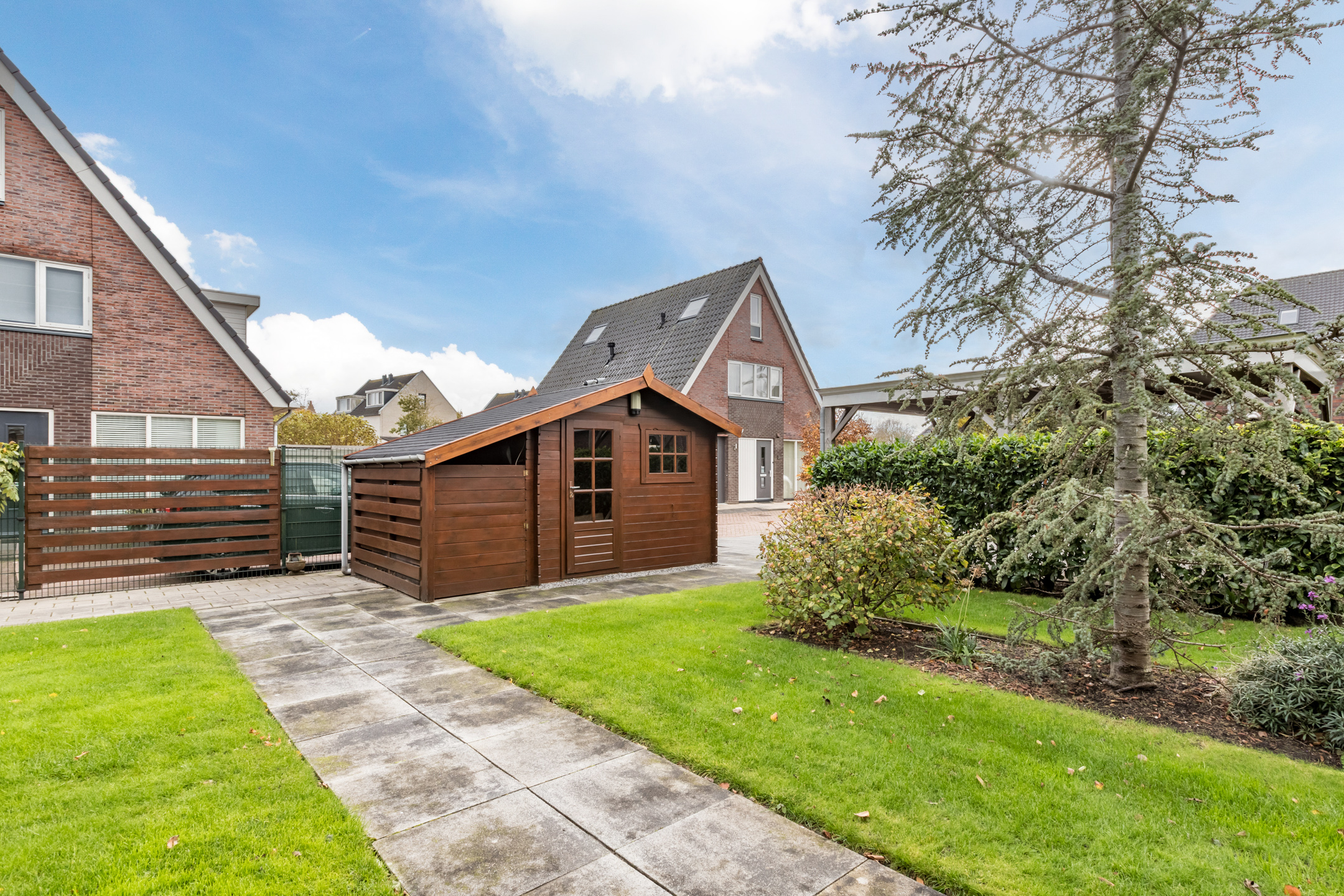 De prachtige aangelegde tuin beschikt over een fraaie overkapping heeft diverse terrassen, gazon en volwassen groen en houten berging. Tevens is er een oprit met een carport aanwezig.