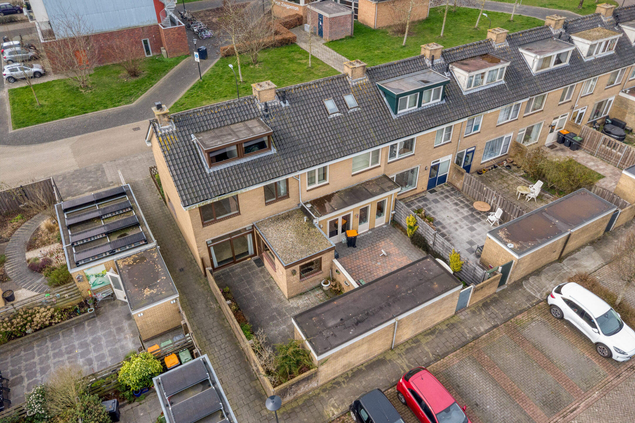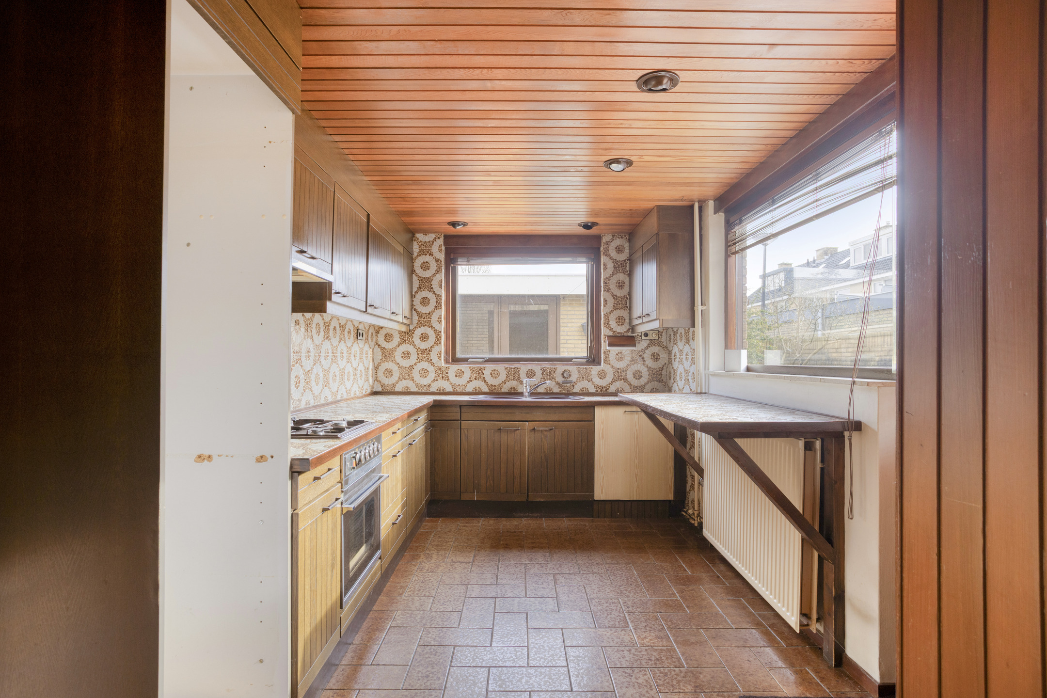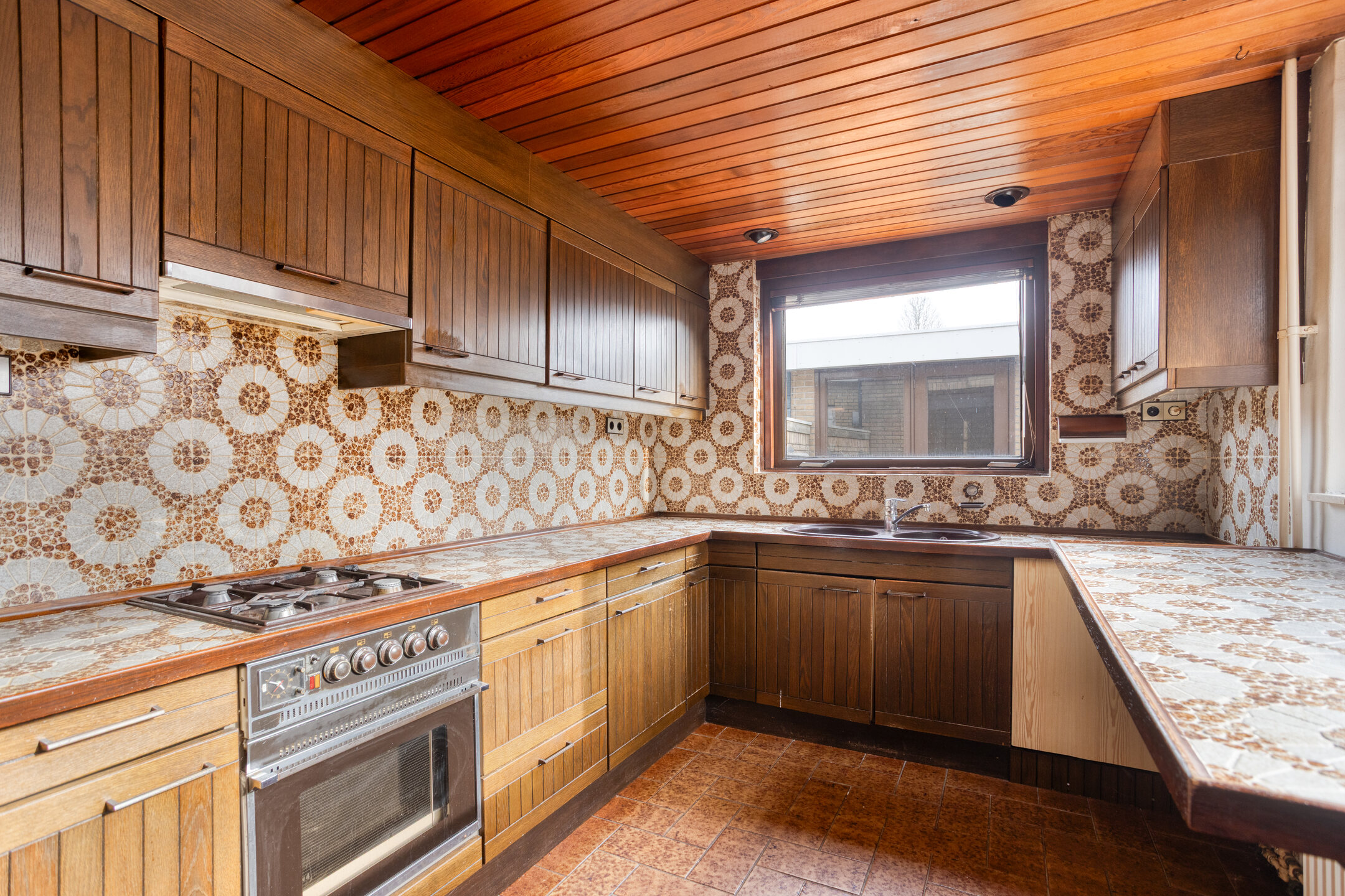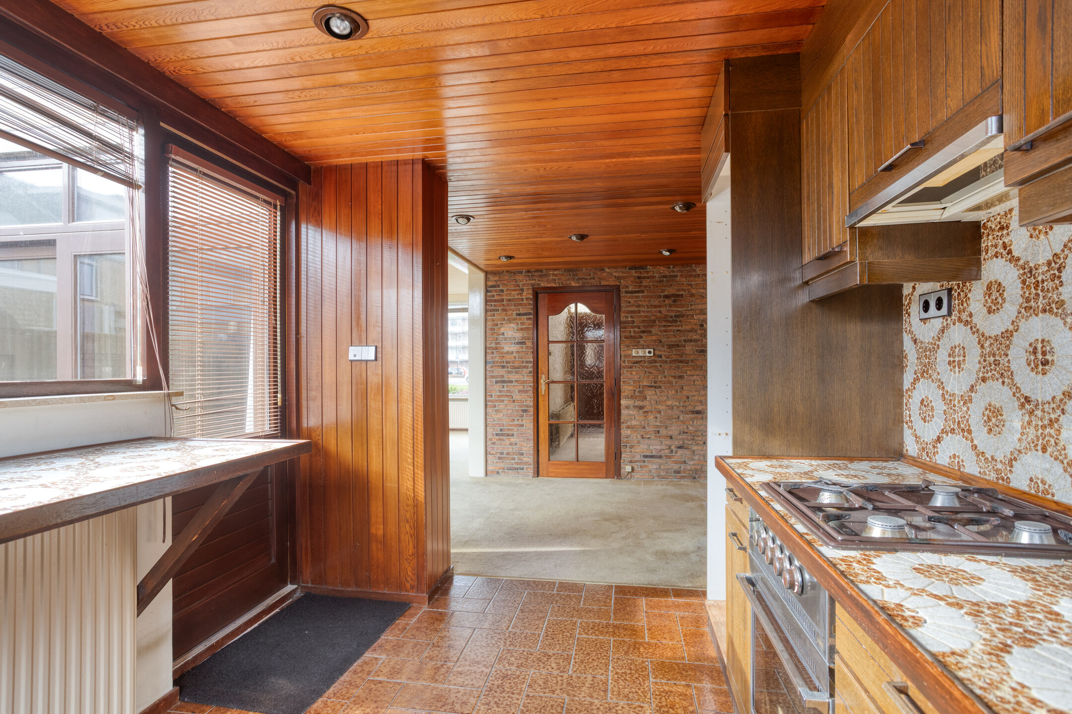 Aan de achterzijde ligt de aangebouwde keuken, praktisch opgesteld en voorzien van diverse apparatuur. Door deze uitbouw blijft het woongedeelte ruim en overzichtelijk. Via de schuifpui in de woonkamer en via een extra deur in de keuken is er toegang tot de achtertuin.
