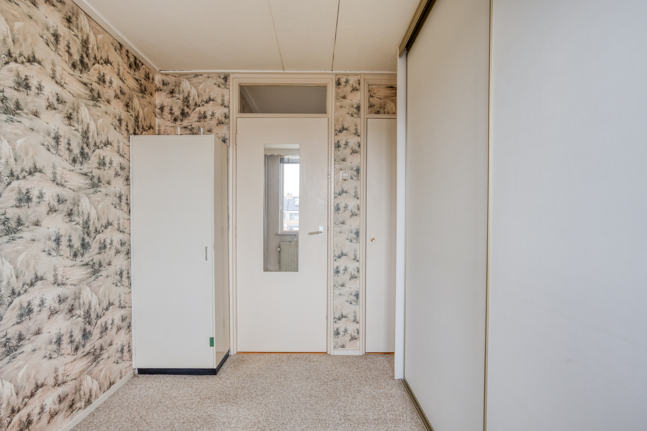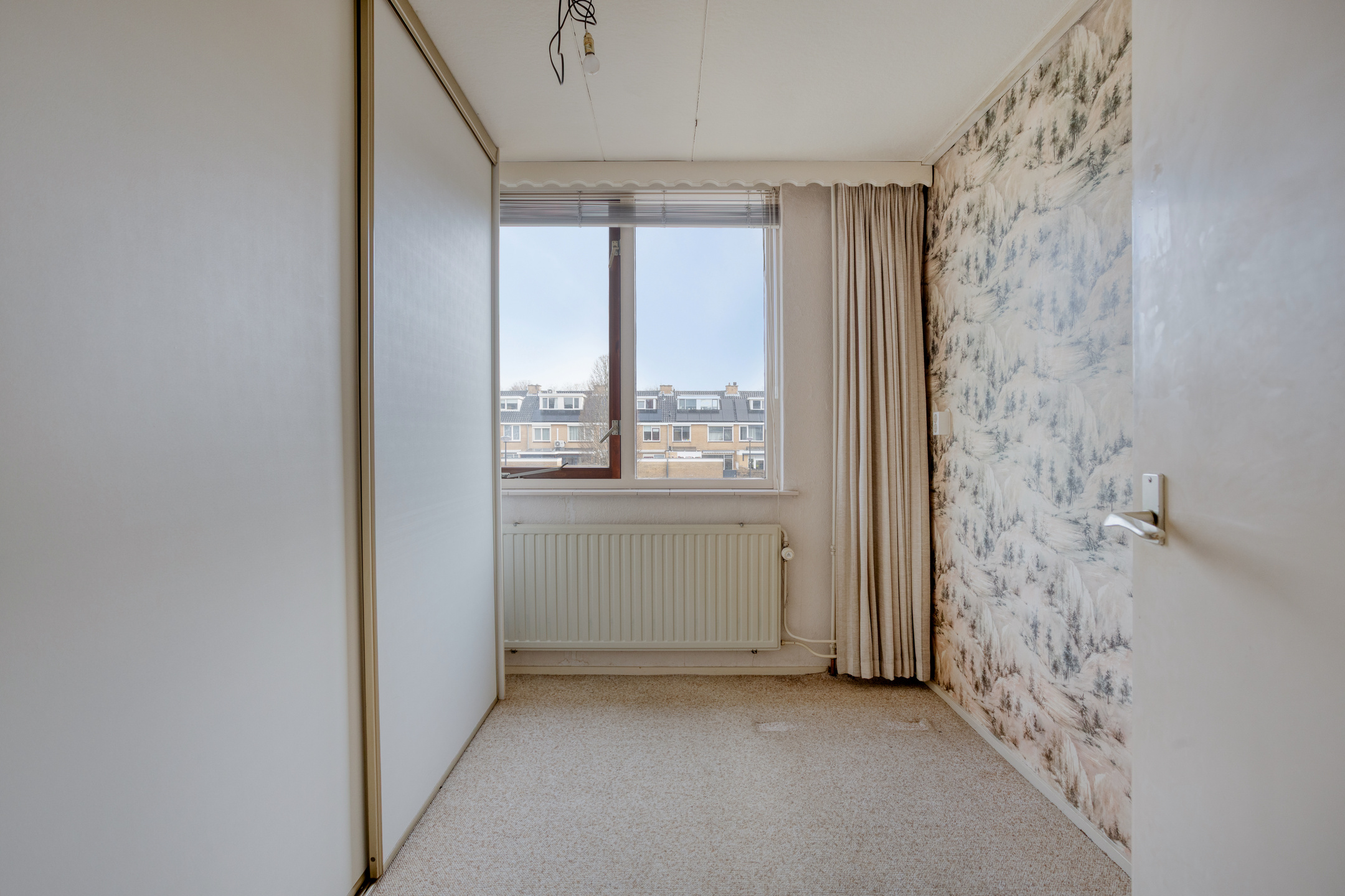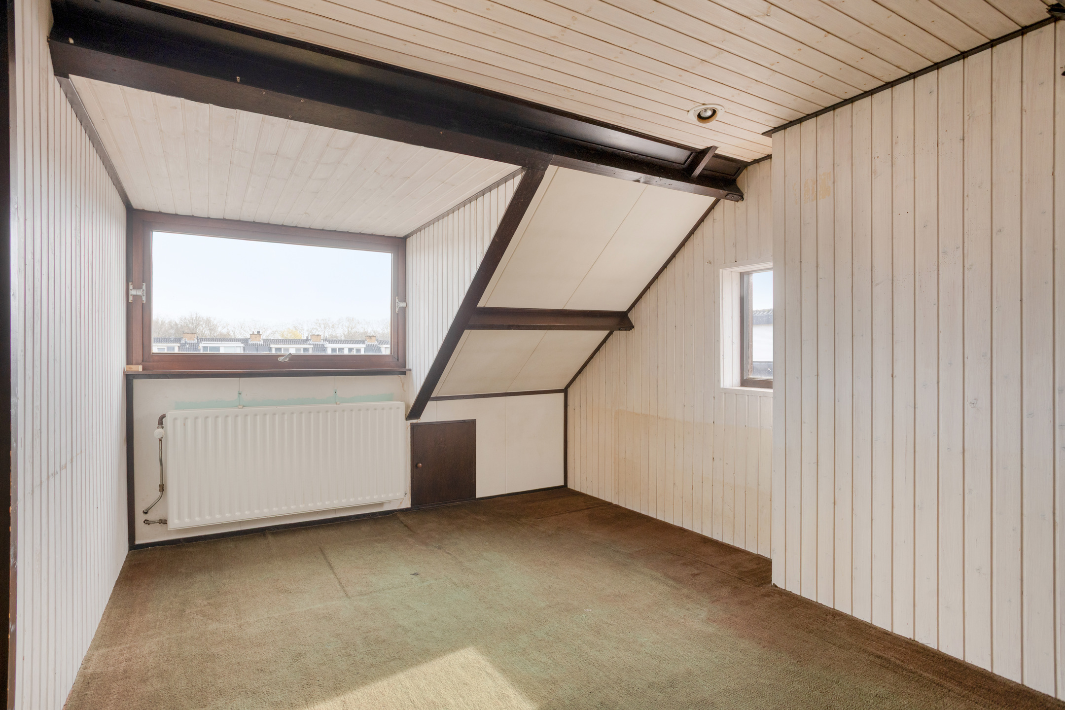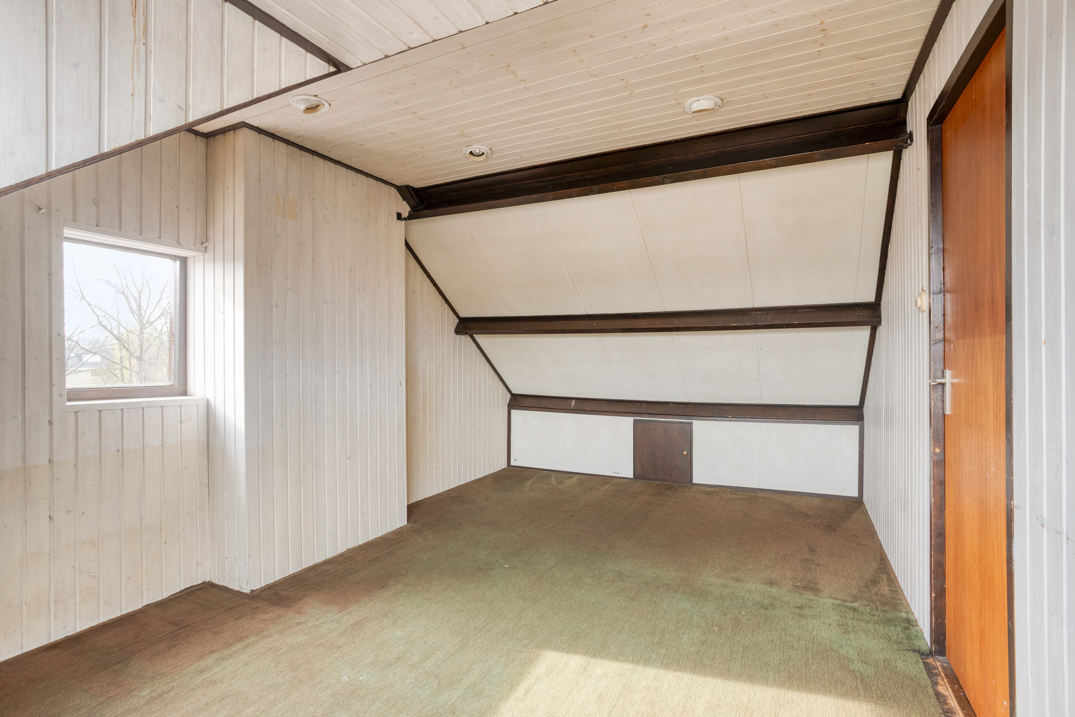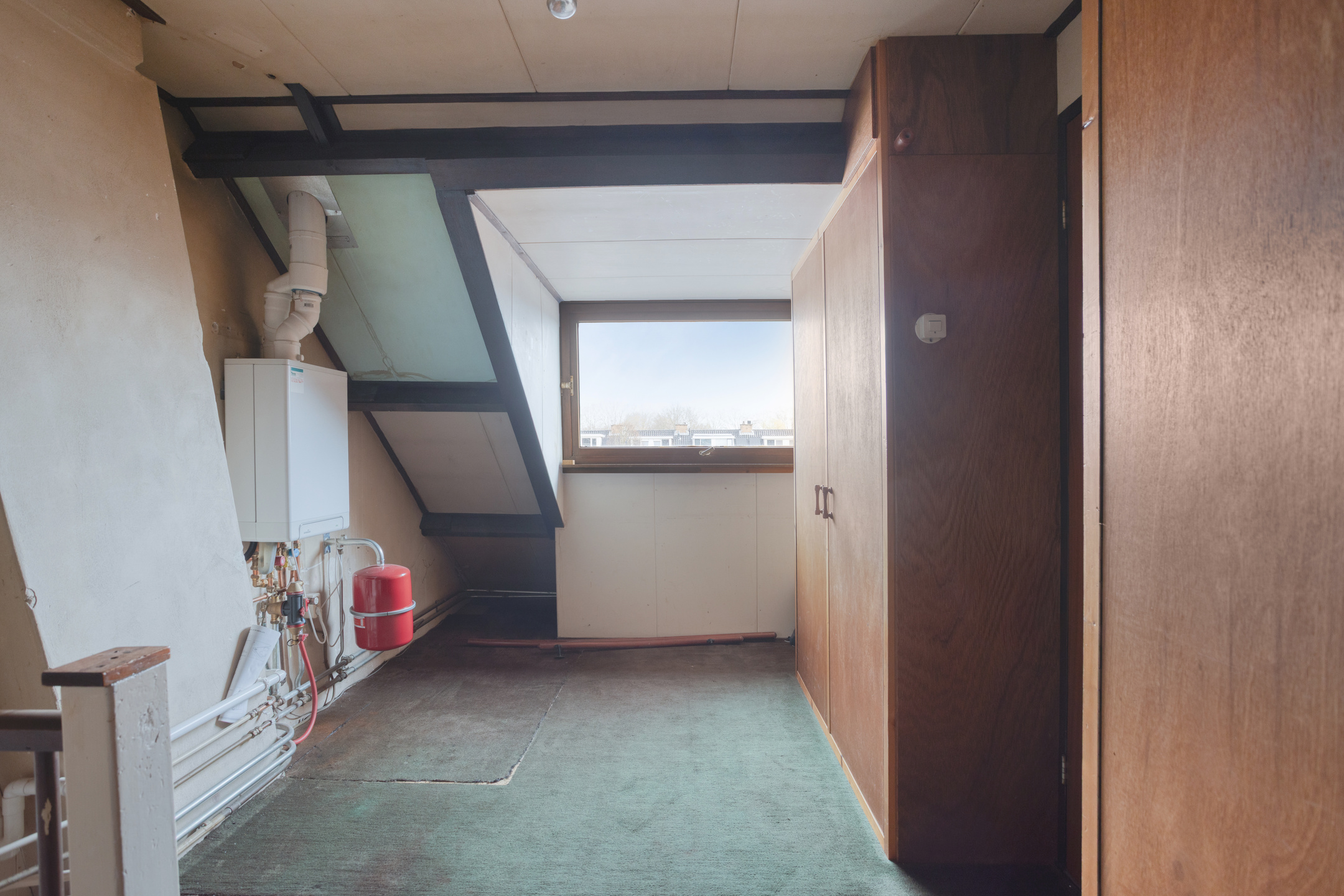 Via een vaste trap bereik je de 2e verdieping. Op de overloop/voorzolder vind je vaste kasten, de cv-opstelling. Daarnaast is hier een ruime slaapkamer van 16,5 m² aanwezig, met een fijne lichtinval en een prettige indeling. De gehele verdieping biedt tevens praktische bergruimte achter de knieschotten.