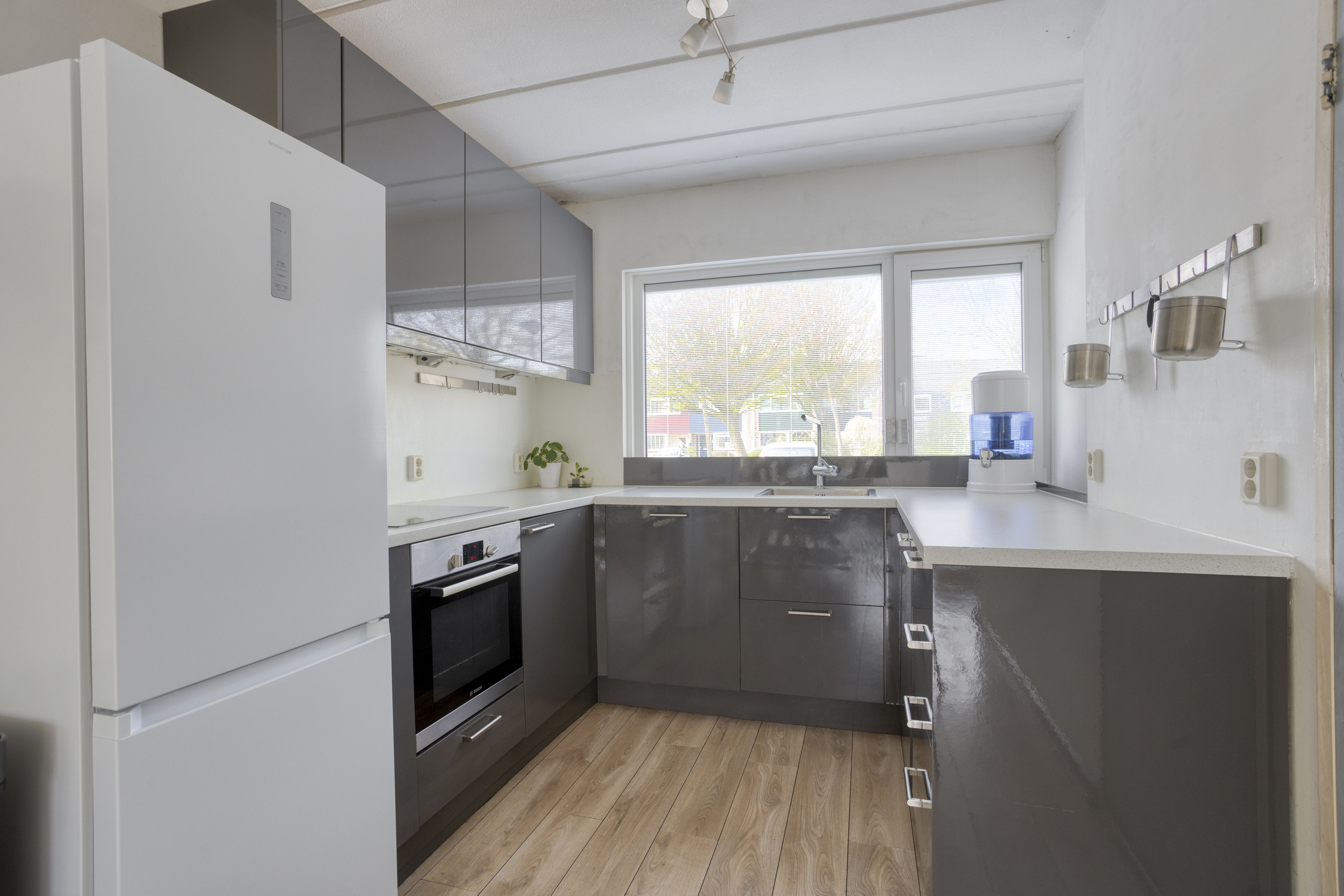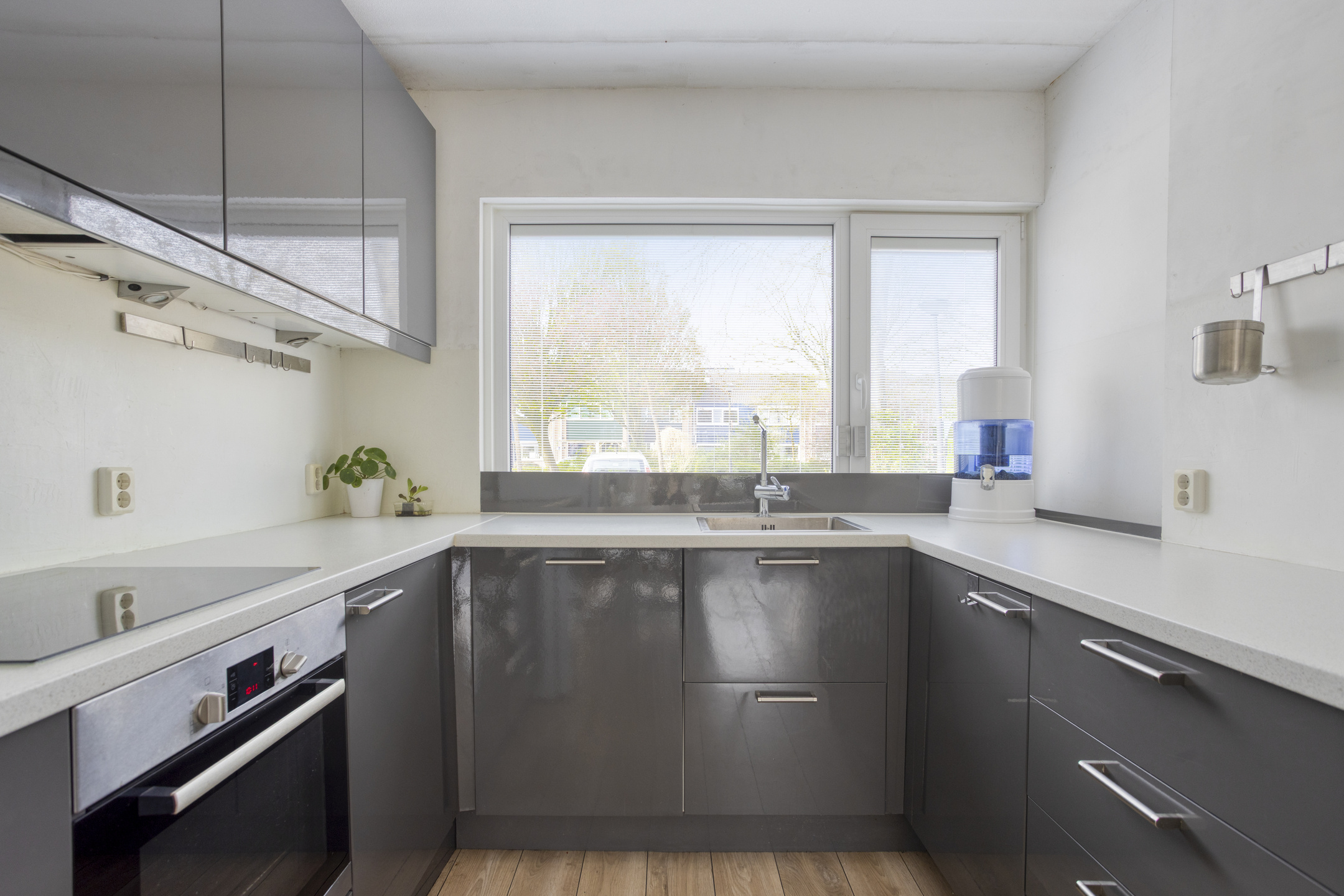 Aan de voorzijde ligt de keuken, uitgevoerd in een moderne U-opstelling met diverse inbouwapparatuur (inductiekookplaat, oven en (mogelijkheid) voor vaatwasser) en veel werk- en opbergruimte.