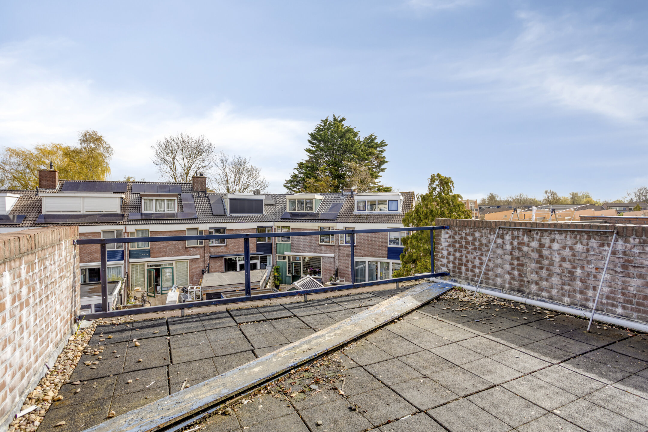 Op de tweede verdieping bevindt zich een derde ruime slaapkamer (ca 19,5 m²), met toegang tot het dakterras. Dit dakterras van 3,60 x 4,63 m is een heerlijke buitenruimte waar je eenvoudig een zit- of loungeplek creëert. Daarnaast beschikt deze verdieping over bergruimte achter de knieschotten en de aansluiting voor wasmachine, droger en CV-ketel (Remeha 2018).