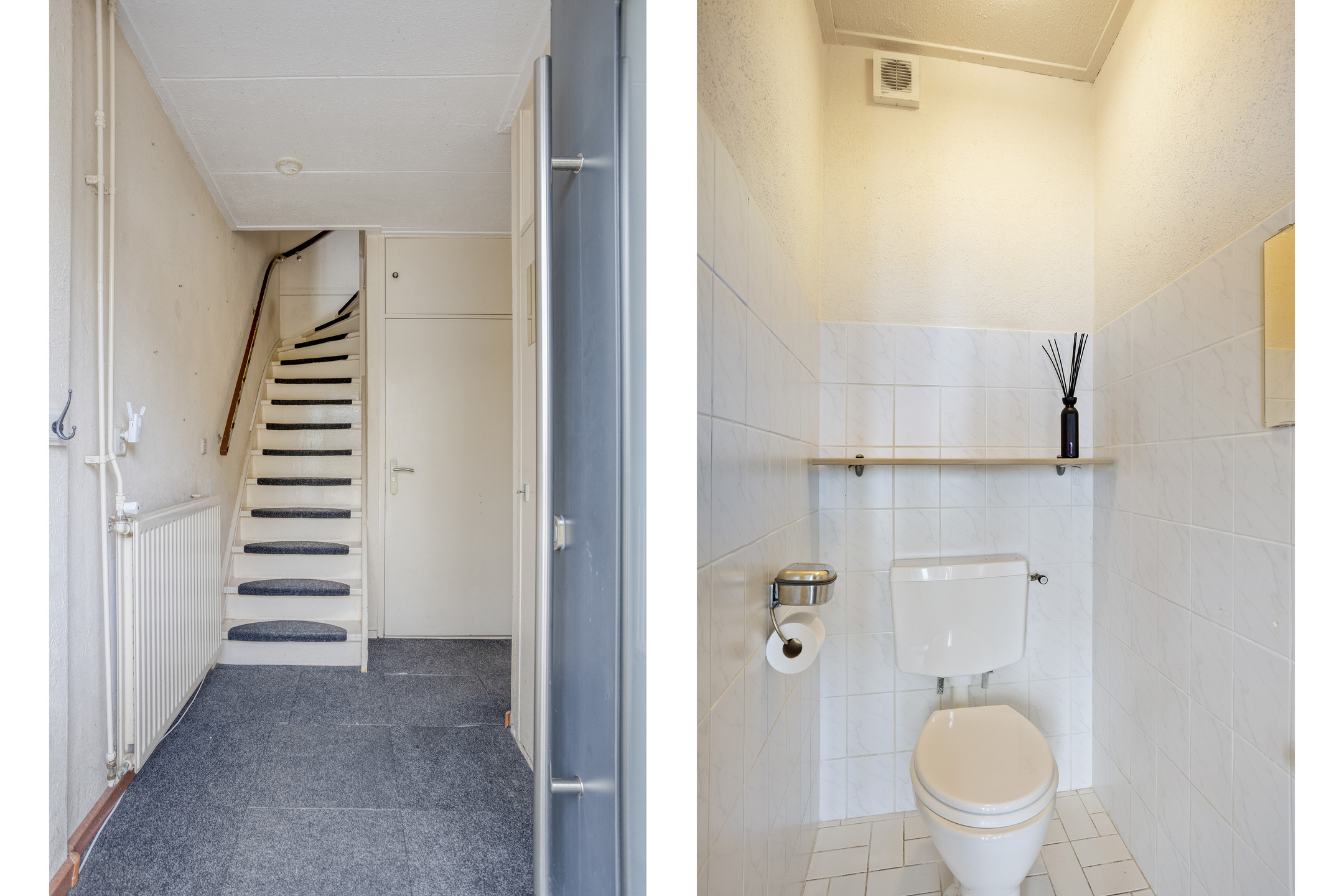 Hal voorzien van meterkast, het toilet en trapopgang naar de eerste verdieping.