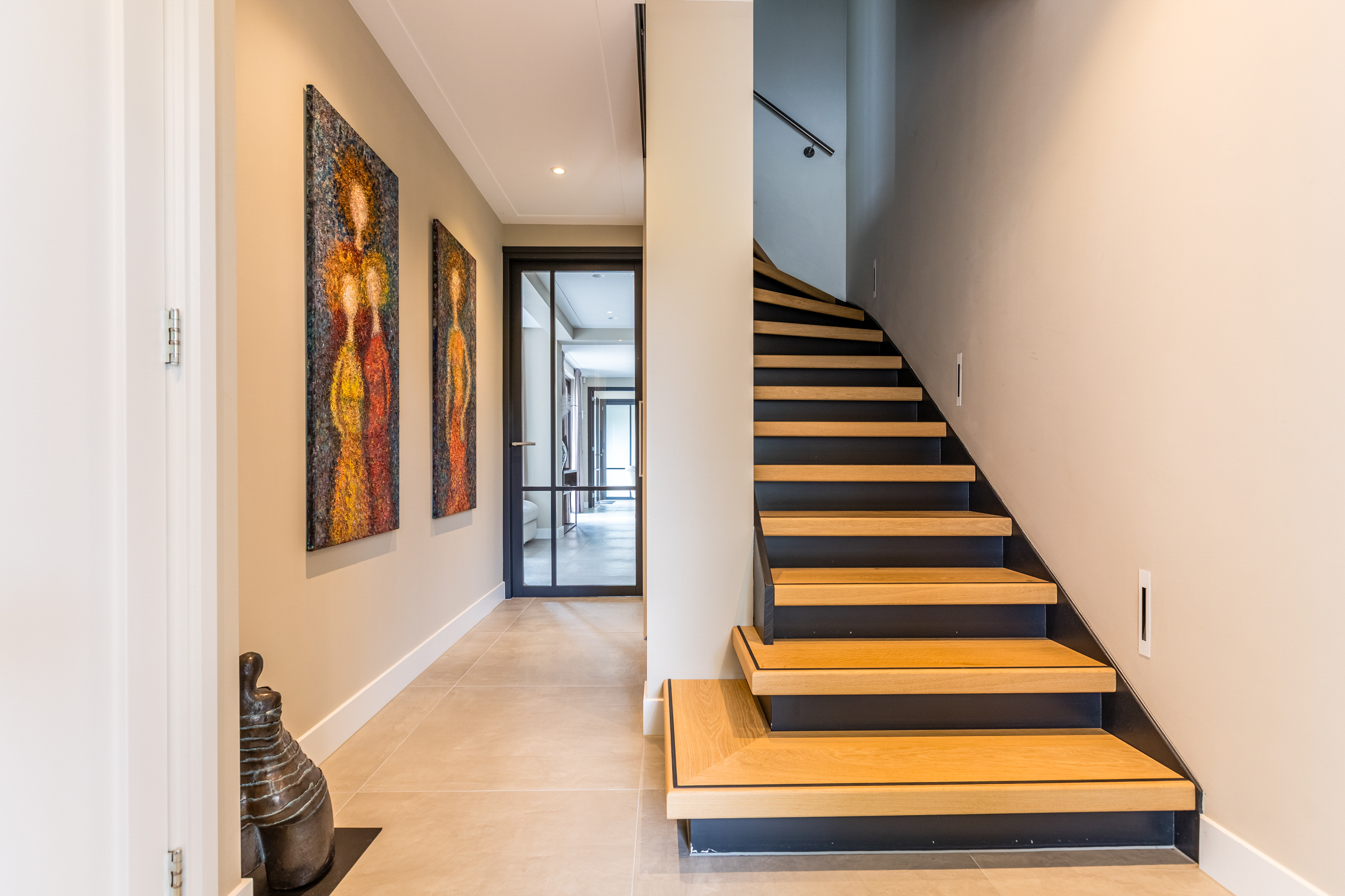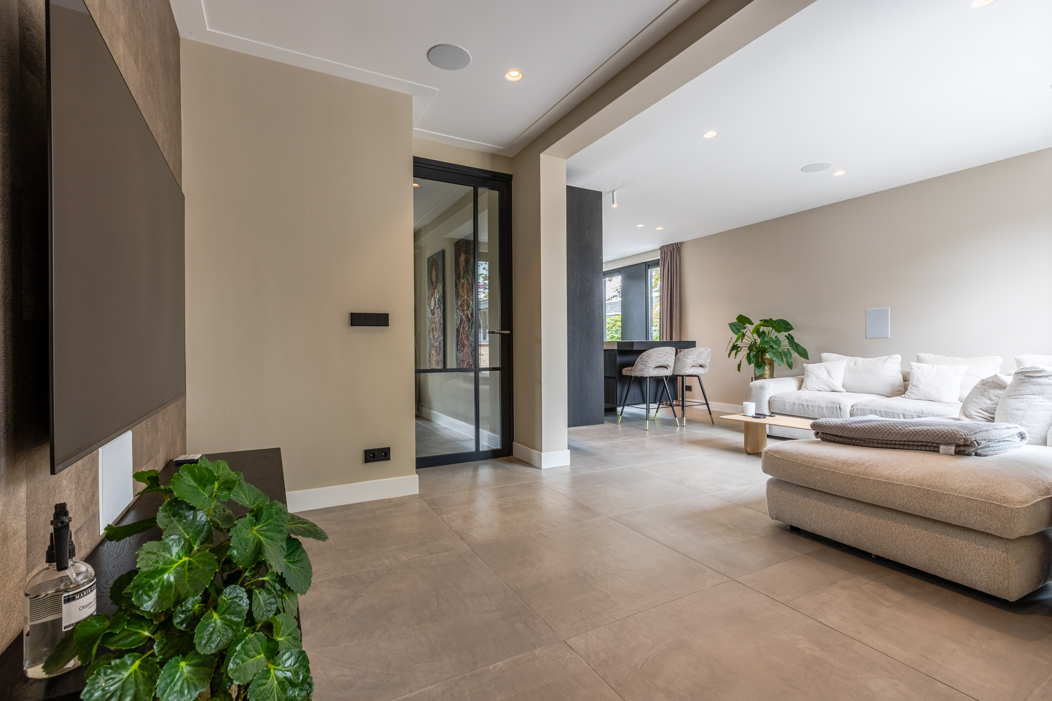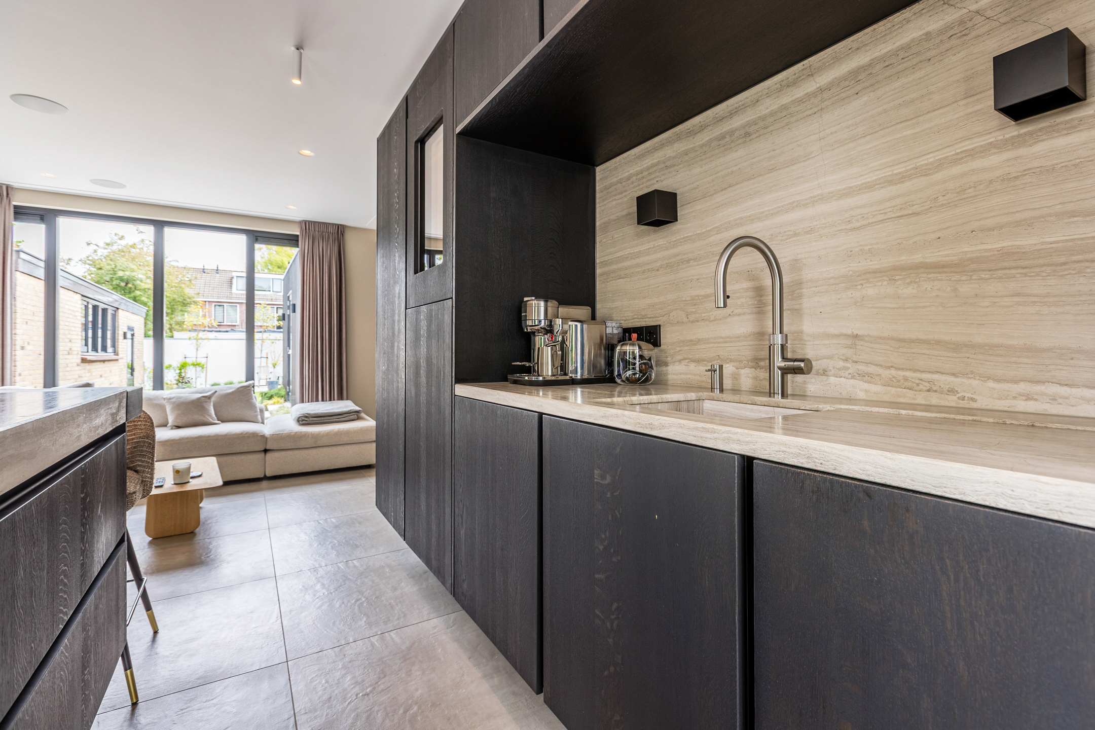 Entree met royale hal, meterkast, trap, bergruimte, luxe keuken (handgemaakt van eikenhout, wandgedeelte en eiland zwevend uitgevoerd, keukenblad en achterwand in oak grey marmer afgewerkt en voorzien van kwalitatief hoogwaardige apparatuur), zitkamer, eetkamer voorzien van openslaande tuindeuren, achterentree met hal en garderobekast, luxe toiletruimte voorzien van hangend toilet en urinoir.