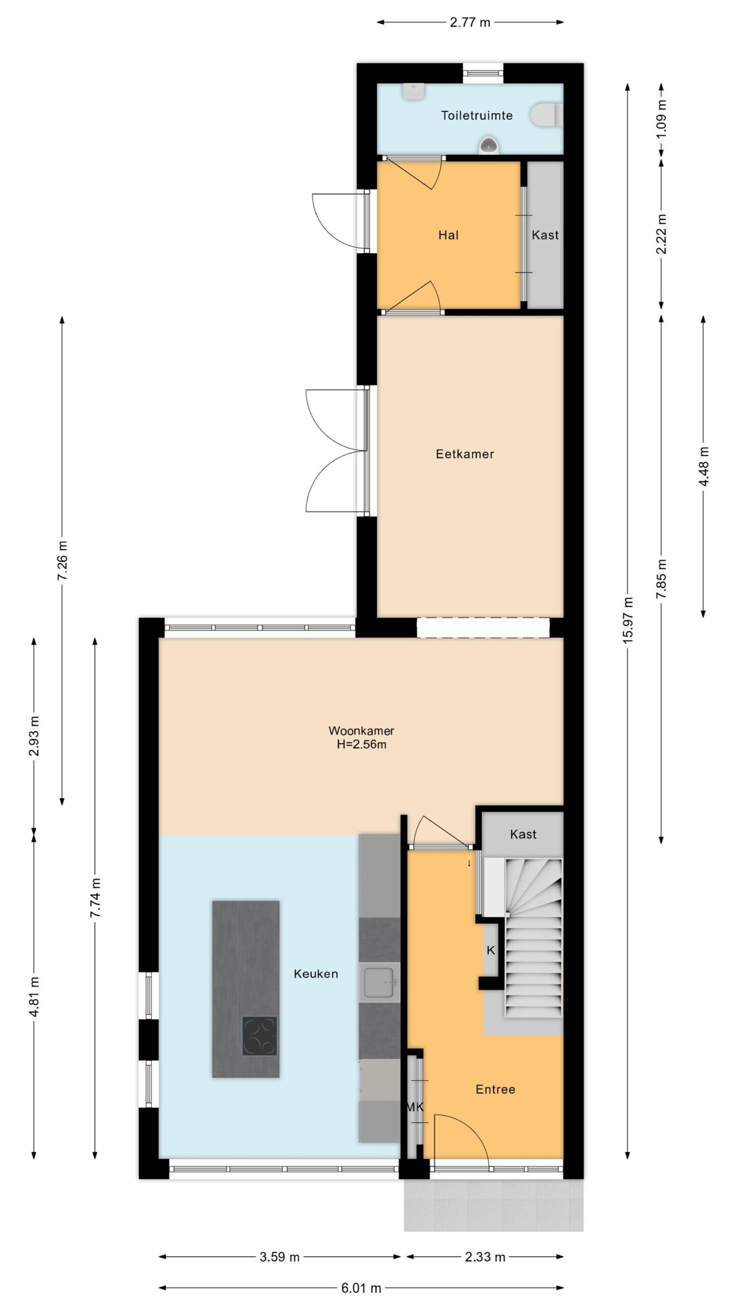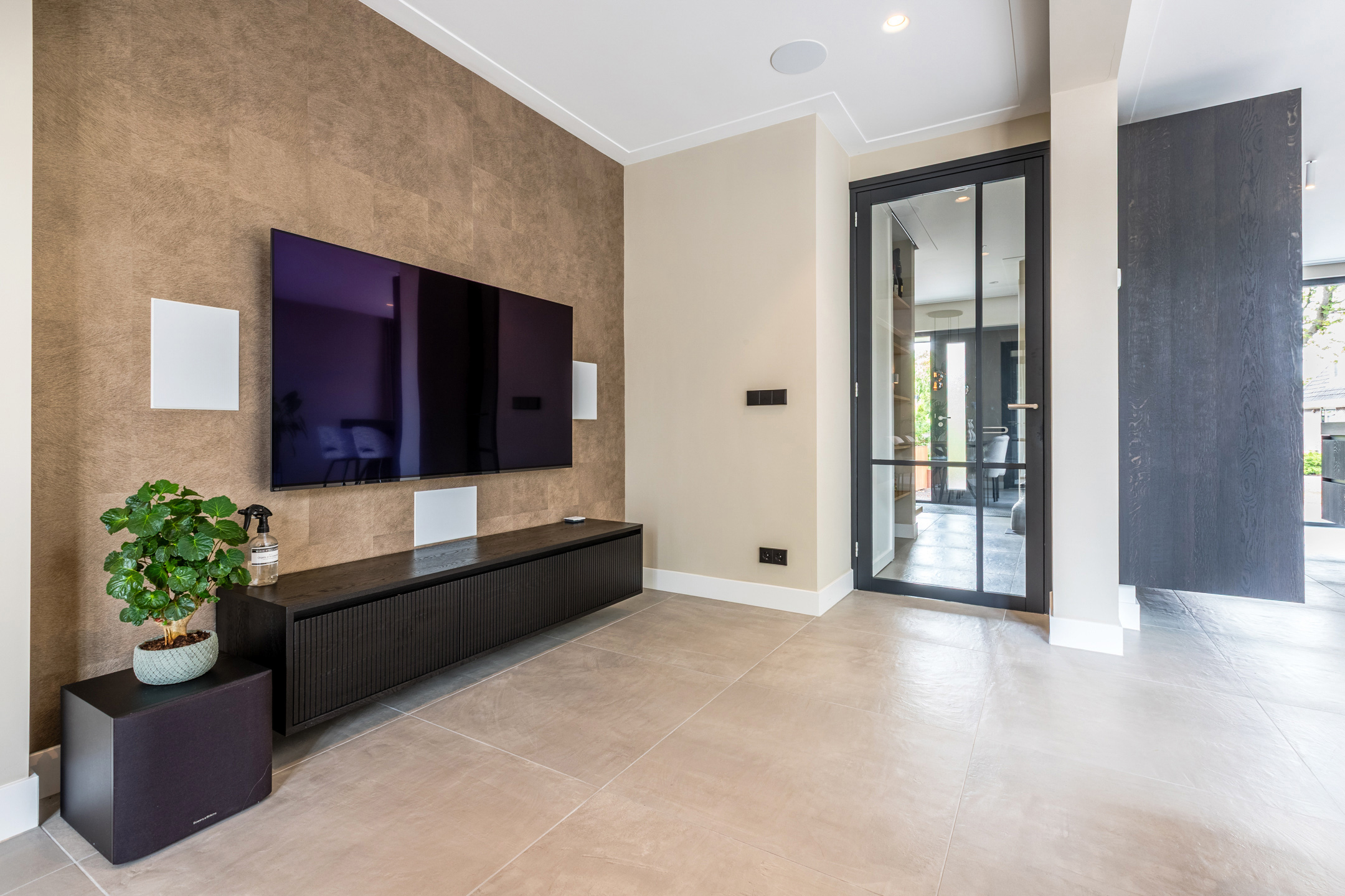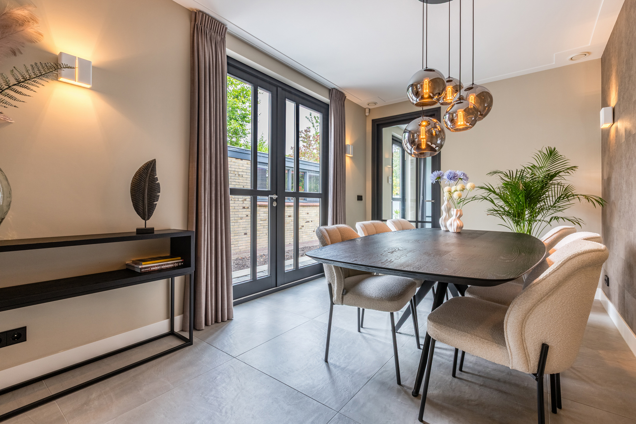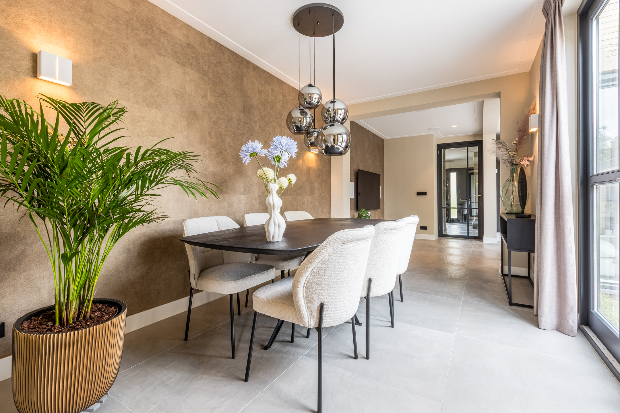 Entree met royale hal, meterkast, trap, bergruimte, luxe keuken (handgemaakt van eikenhout, wandgedeelte en eiland zwevend uitgevoerd, keukenblad en achterwand in oak grey marmer afgewerkt en voorzien van kwalitatief hoogwaardige apparatuur), zitkamer, eetkamer voorzien van openslaande tuindeuren, achterentree met hal en garderobekast, luxe toiletruimte voorzien van hangend toilet en urinoir.