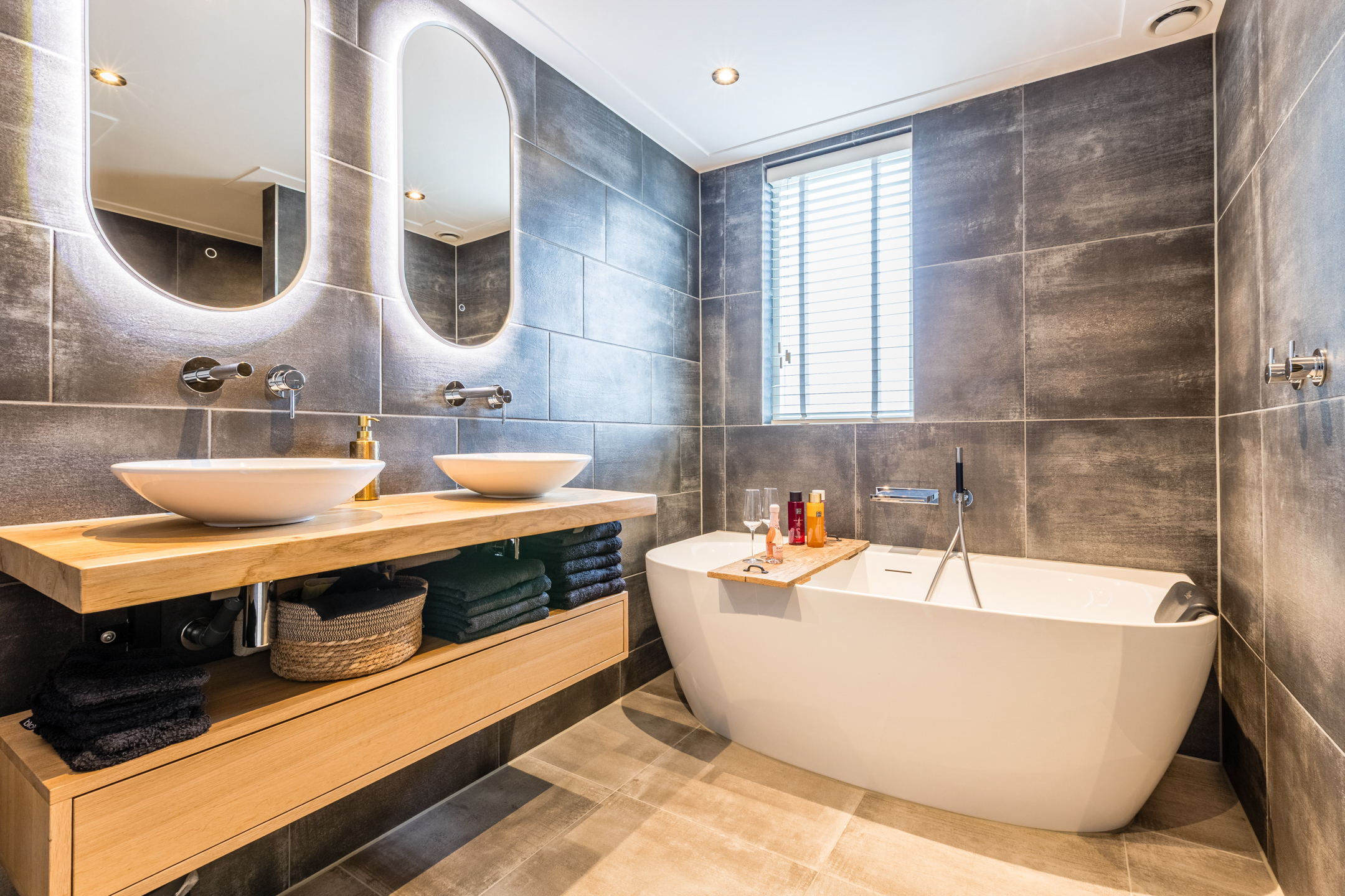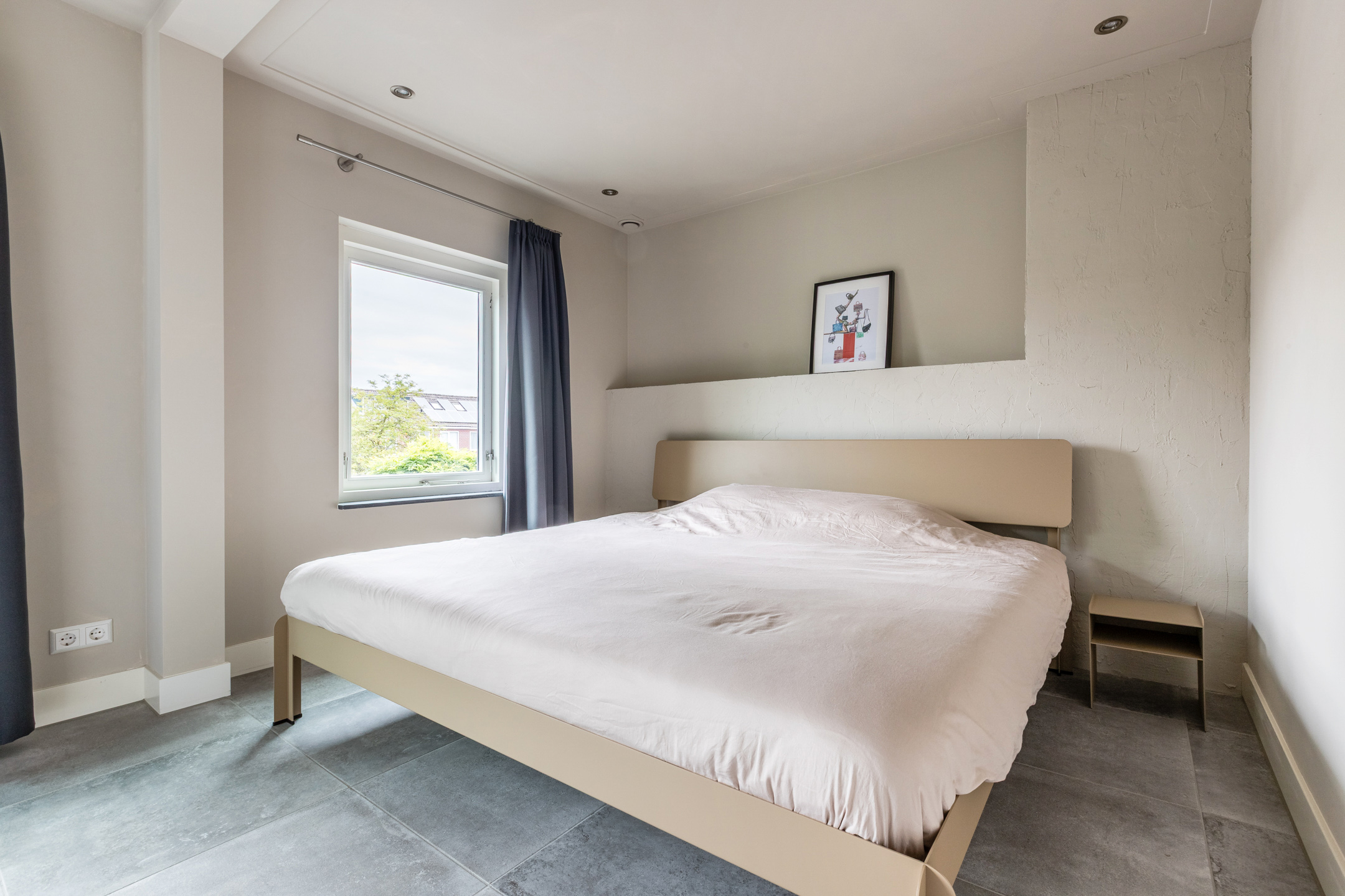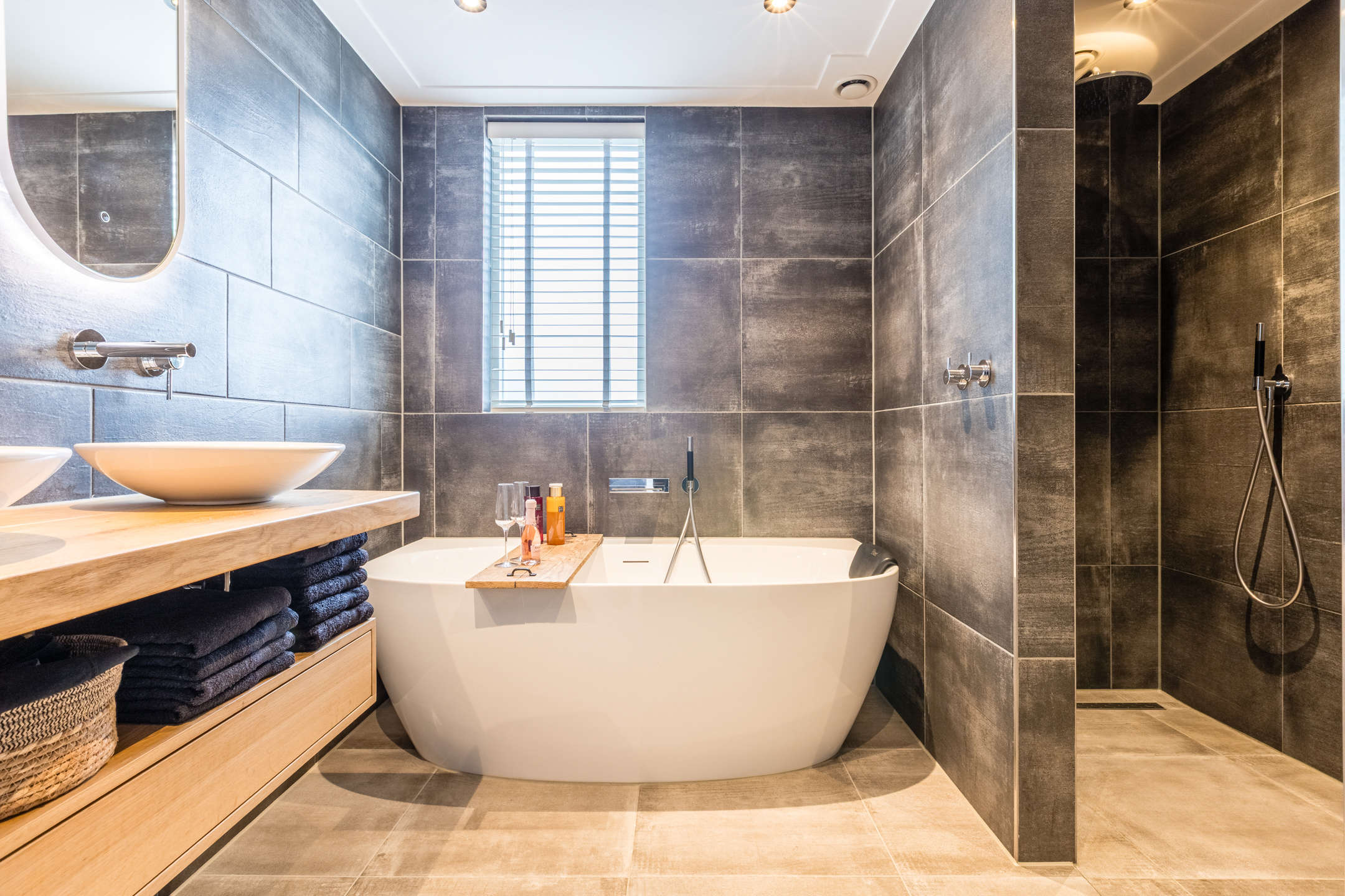 Overloop, moderne luxe betegelde badkamer met vrijstaand ligbad, inloopdouche,2 wastafels en een hangend toilet. Hoofdslaapkamer (16,5 m2) aan de achterzijde, 2 slaapkamers (6 m2 + 9,5 m2) aan de voorzijde.