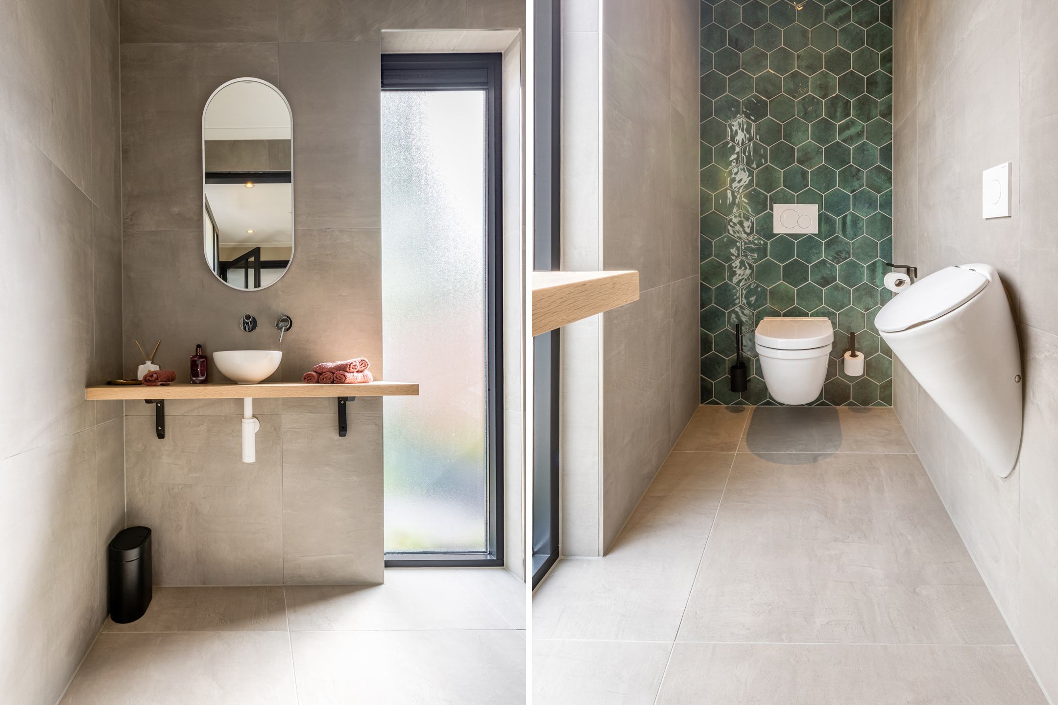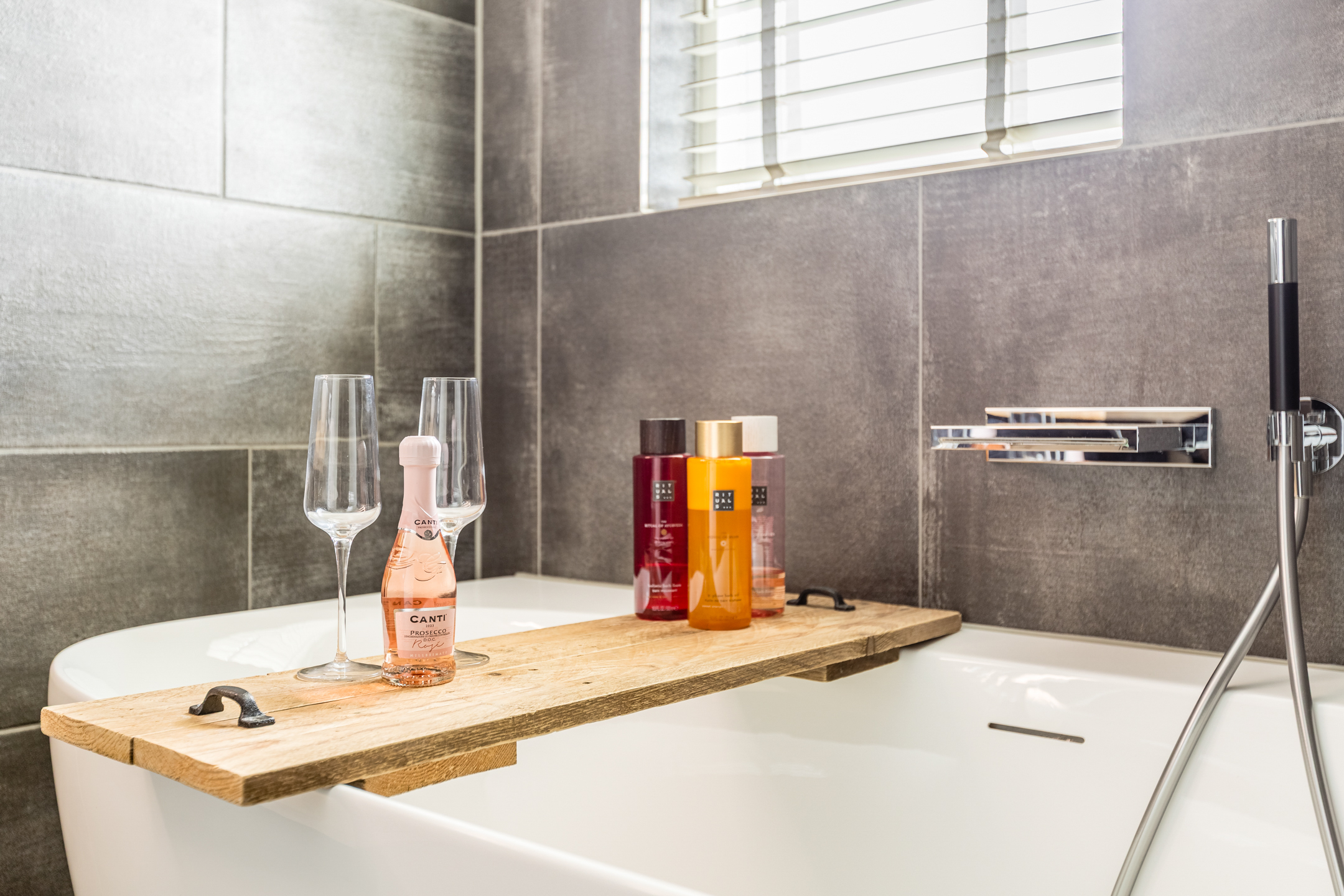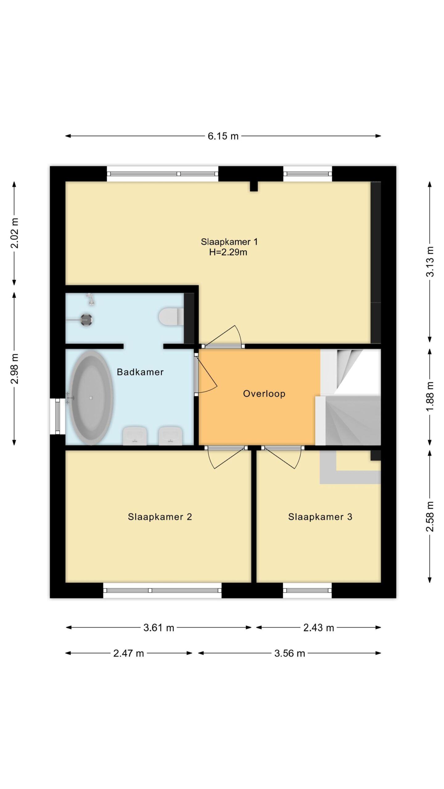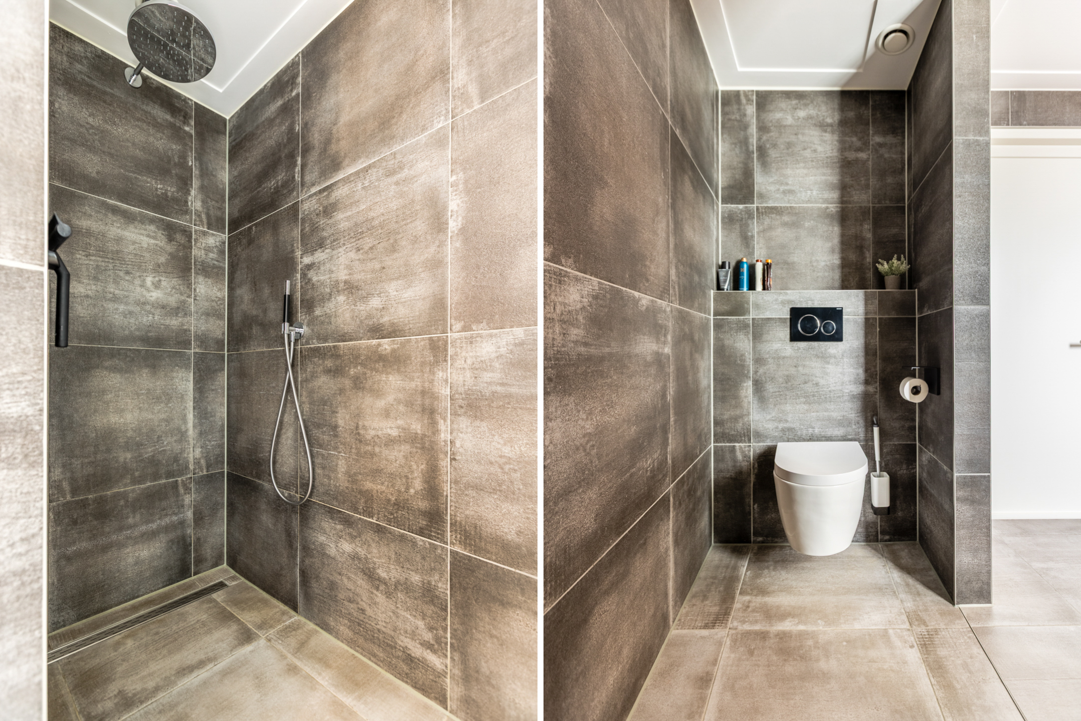 Overloop, moderne luxe betegelde badkamer met vrijstaand ligbad, inloopdouche,2 wastafels en een hangend toilet. Hoofdslaapkamer (16,5 m2) aan de achterzijde, 2 slaapkamers (6 m2 + 9,5 m2) aan de voorzijde.